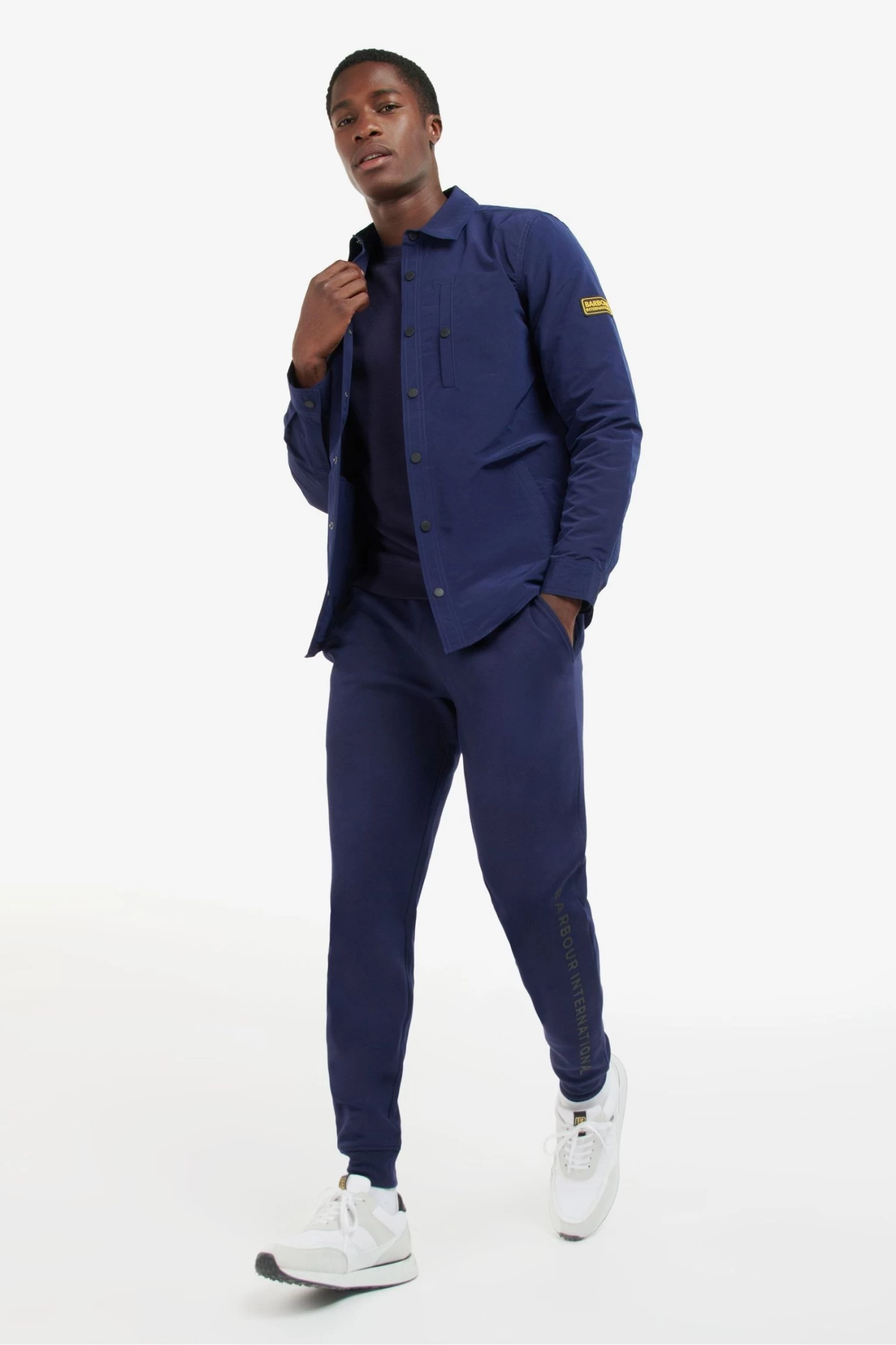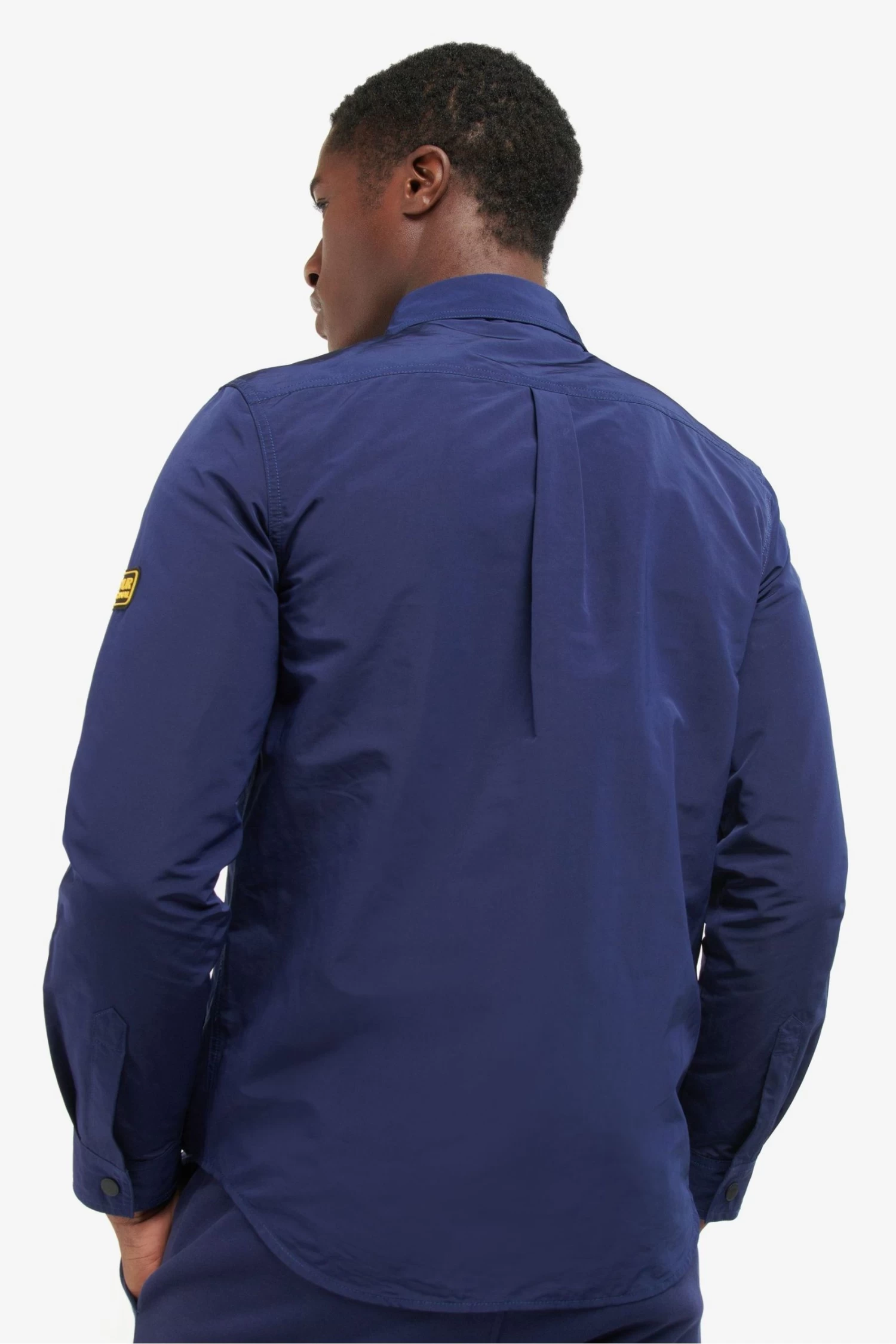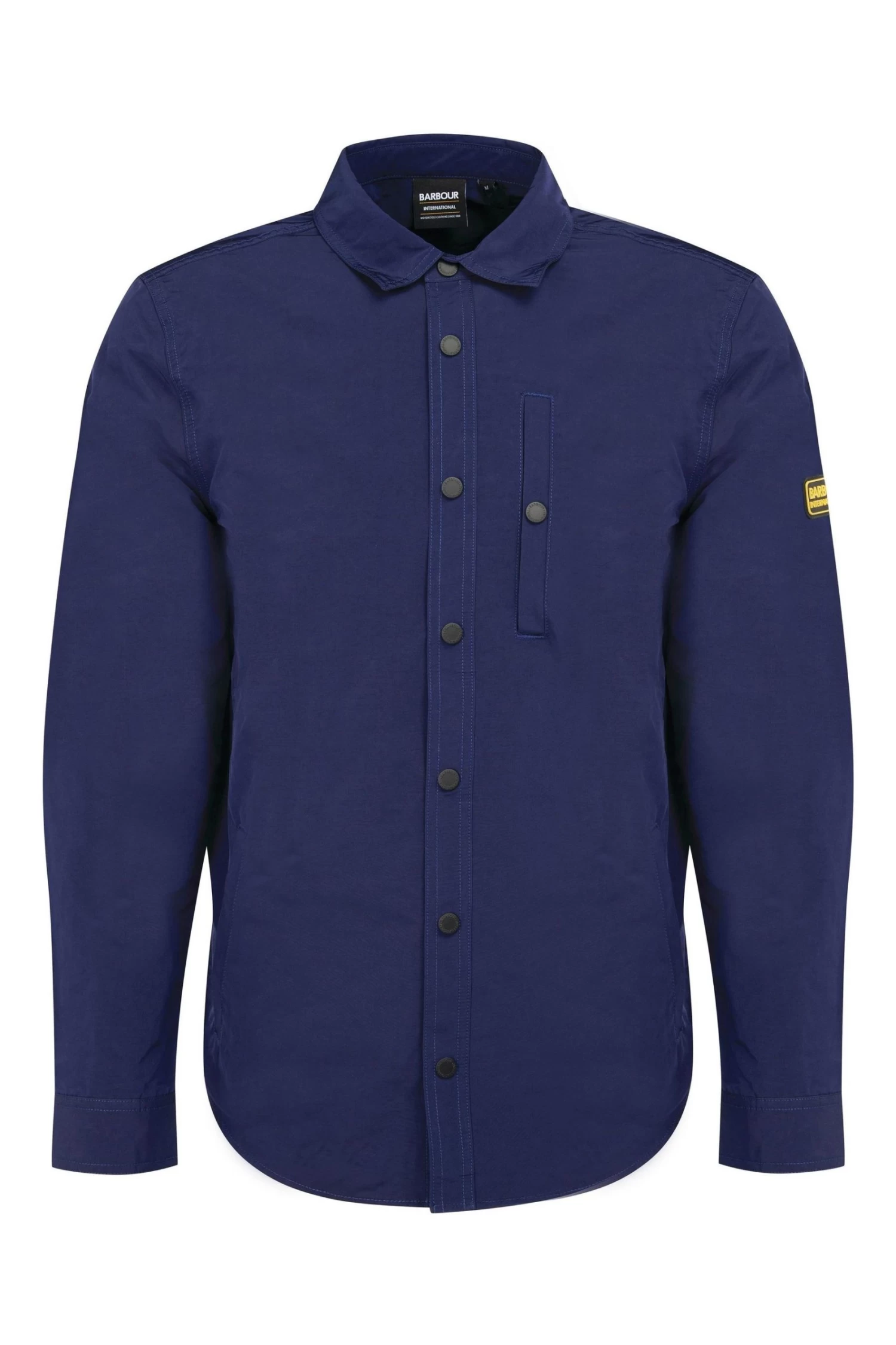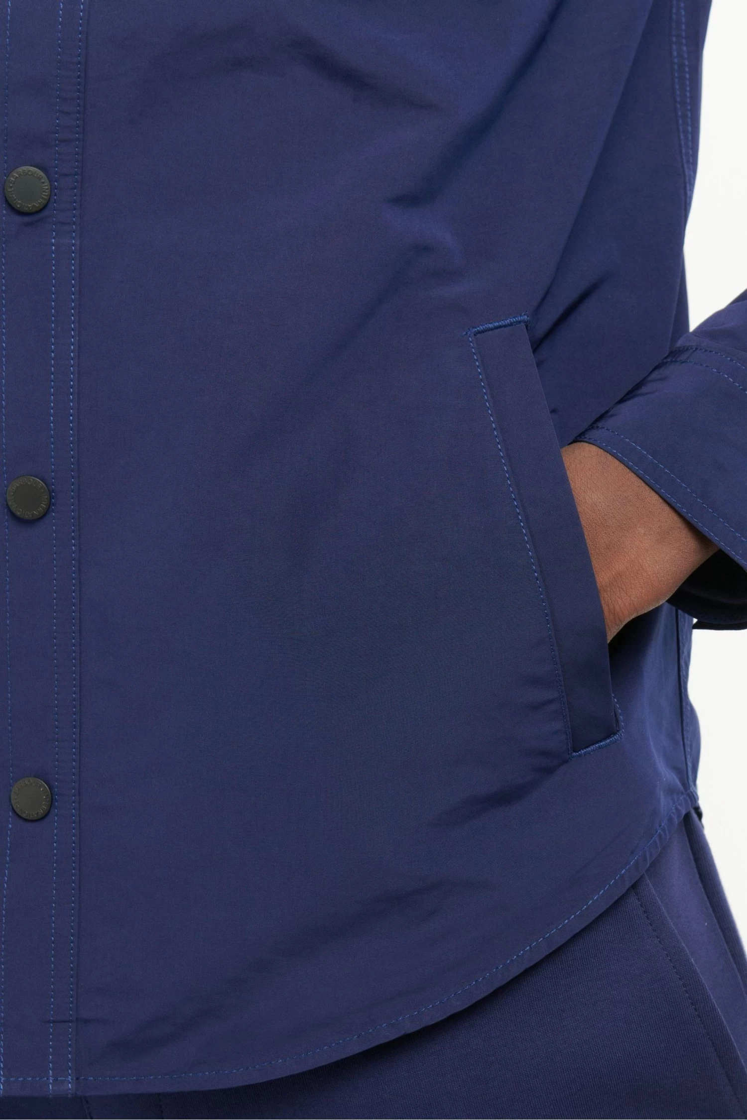 Overshirt with multi pocket set up carrying contrast branding to sleeve left as worn and stud front fastening.