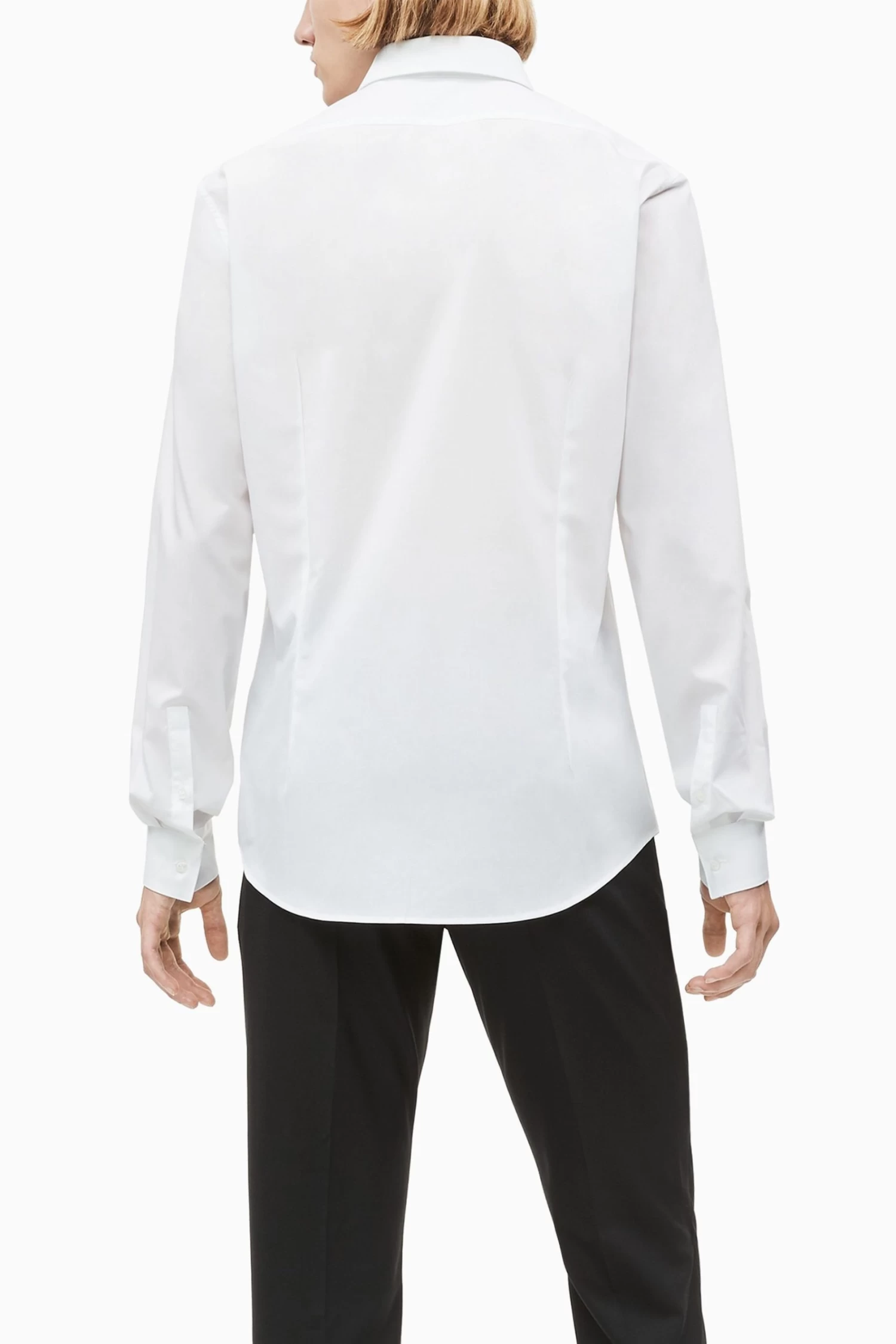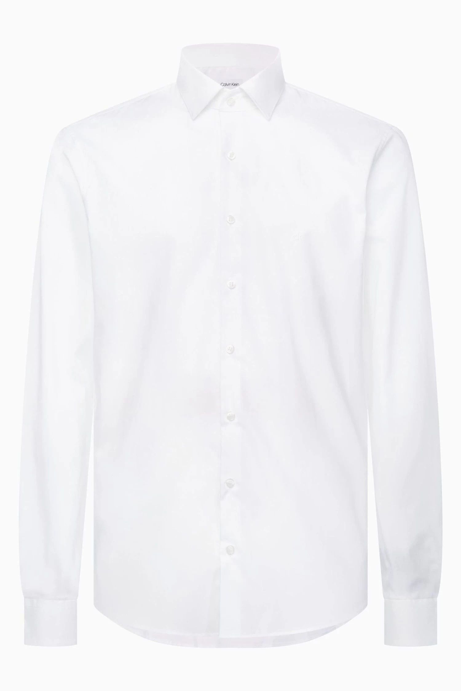 Calvin Klein Slim Stretch Poplin Shirt. Made from cotton stretch poplin, this slim fit shirt has a semi-spread collar, barrel cuffs and a curved hem. Finished with mother-of-pearl buttons and a subtle but smart CK embroidered logo on the chest, this shirt is perfect for smart casual or formal occasions. A must have shirt for any smart dresser. Part of the Core range.