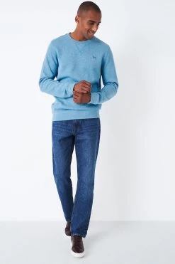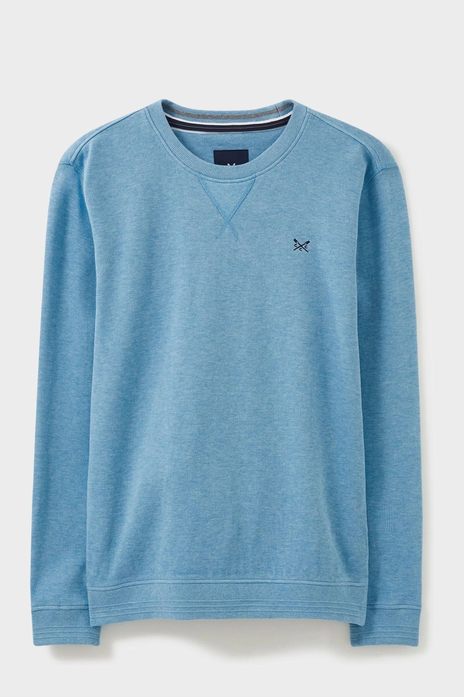 Our classic crew neck jumper in blue marl. Fans of this signature style will love this update, now in a soft vertical French rib knit. Stripes across the inner collar make for that extra touch. Pair with jeans or joggers for a relaxed day out and about, or around the house. Washed for softness. Ribbed cuffs, inner collar and hem. Branded zip pull. Crossed oars embroidered on the chest.