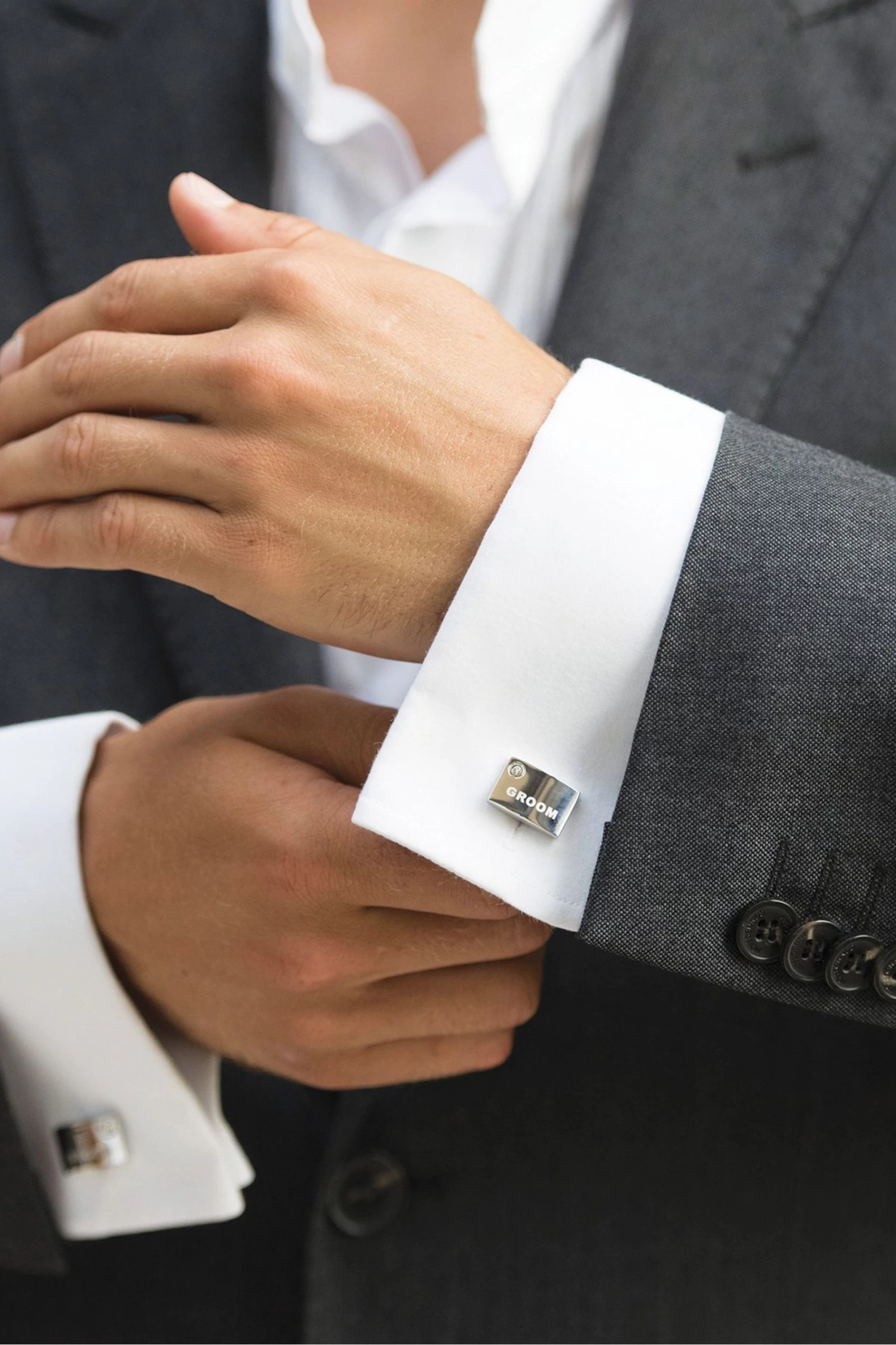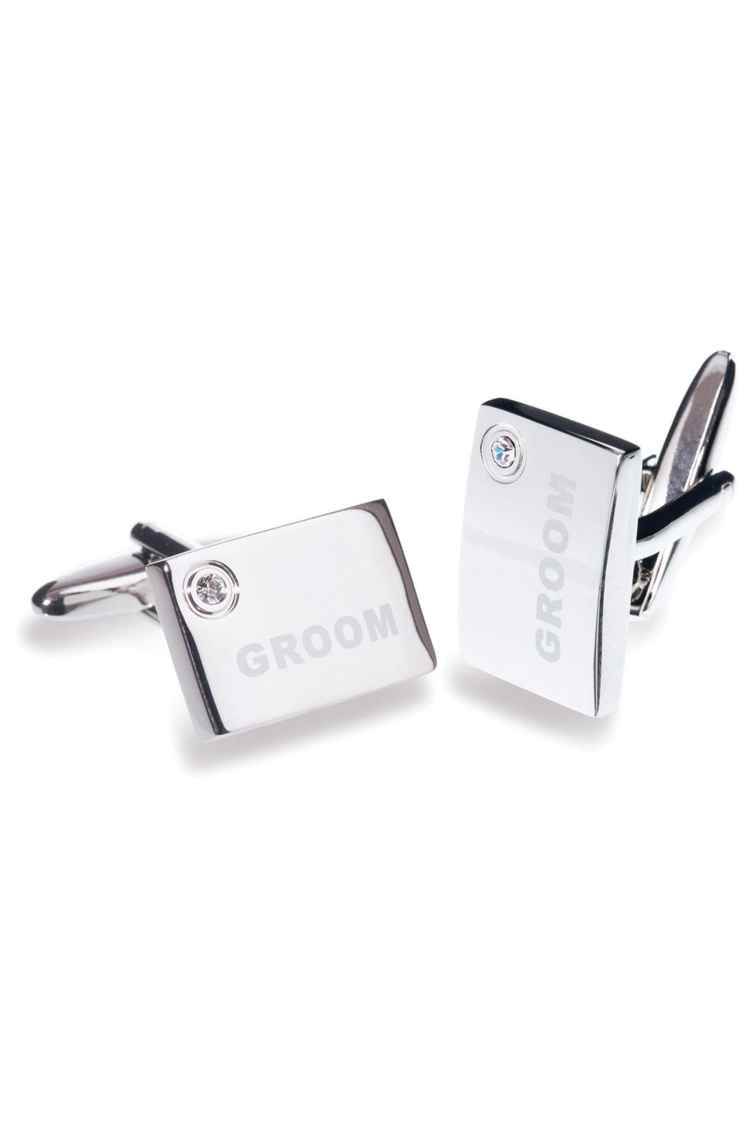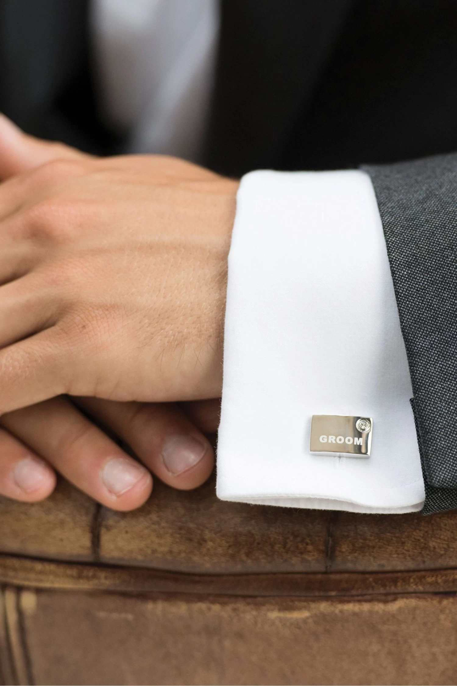 A contemporary set of cufflinks that make the perfect gift for your Groom. This set of Rhodium plated rectangular cufflinks are laser engraved and set with a crystal detail to complete this simple and elegant style.
