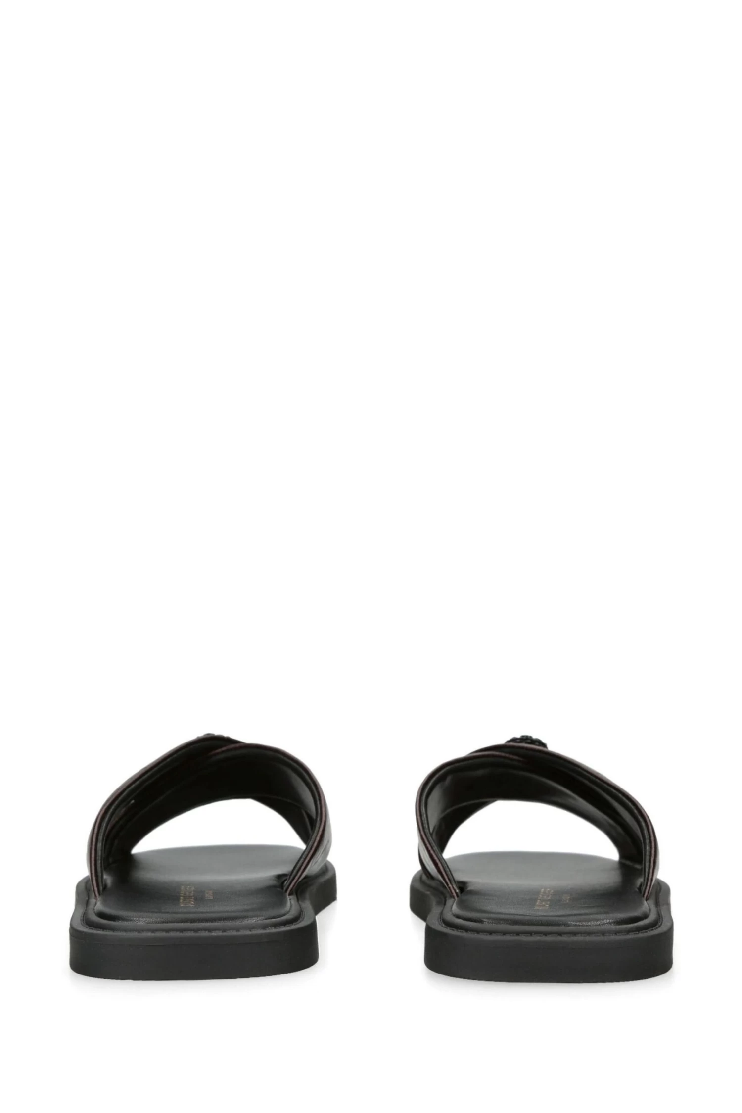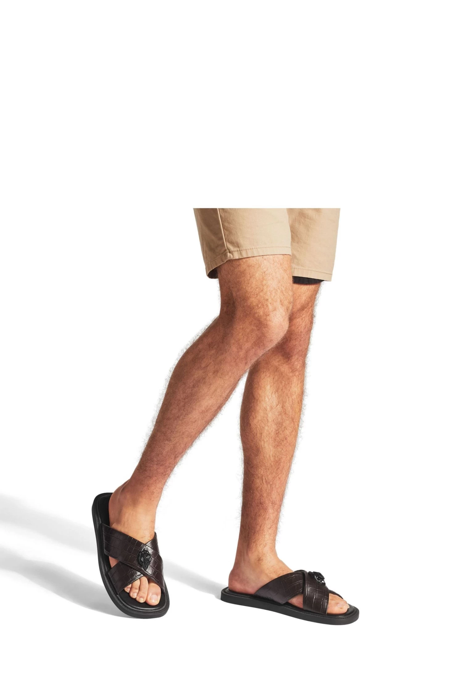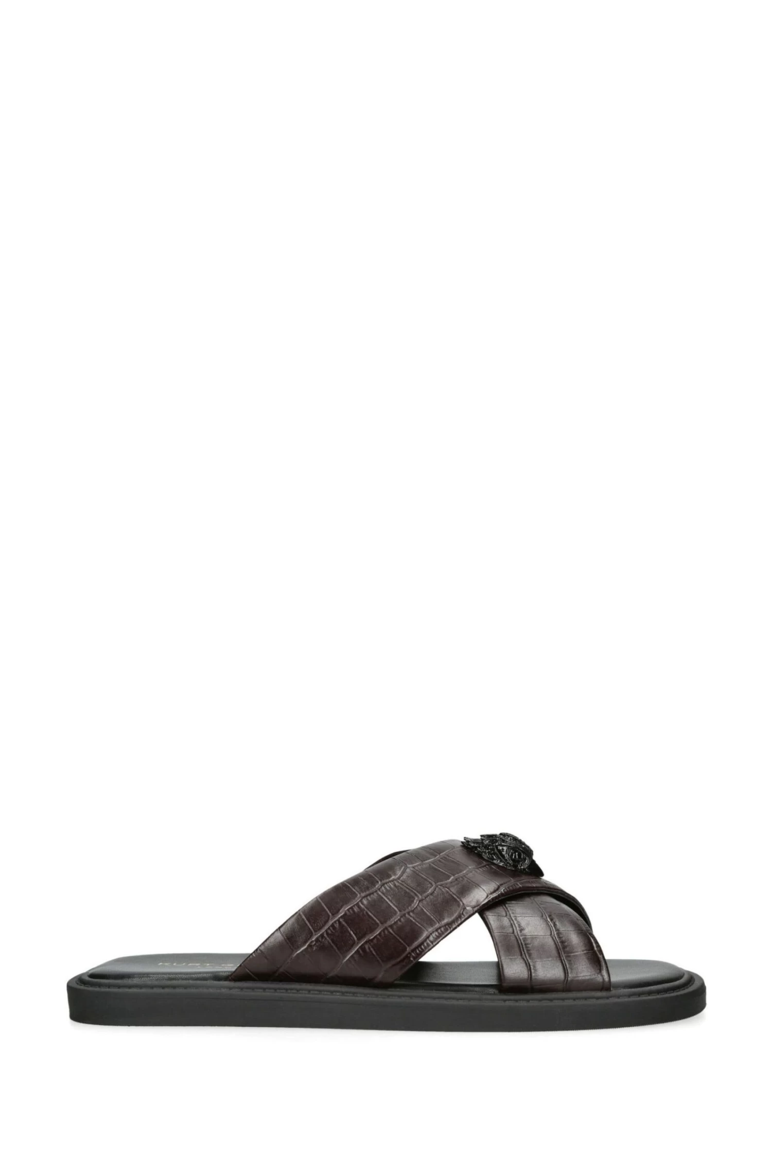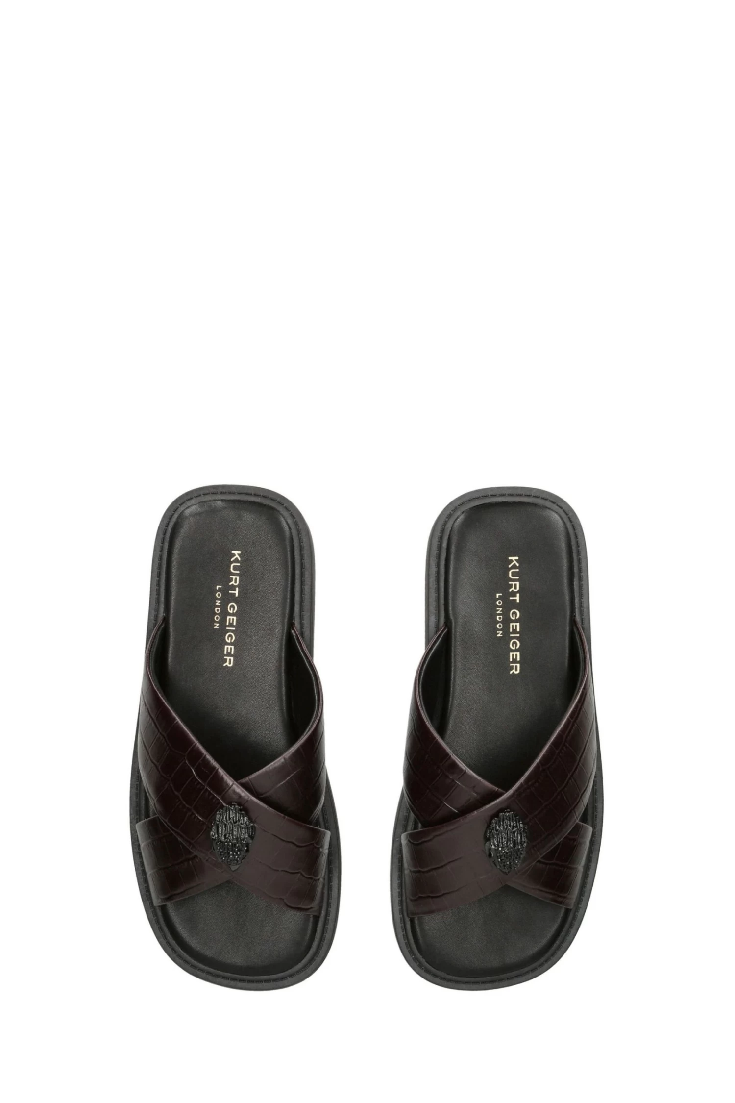 The Owen sandal is crafted from a brown, croc embossed leather. The black Eagle head features crystals and black bead eyes on the strap. Padded footbed.