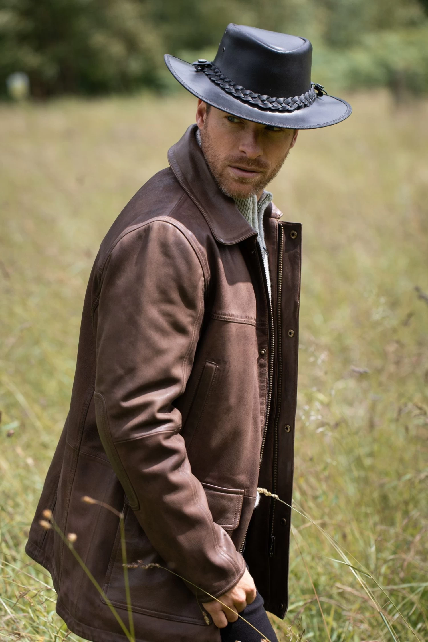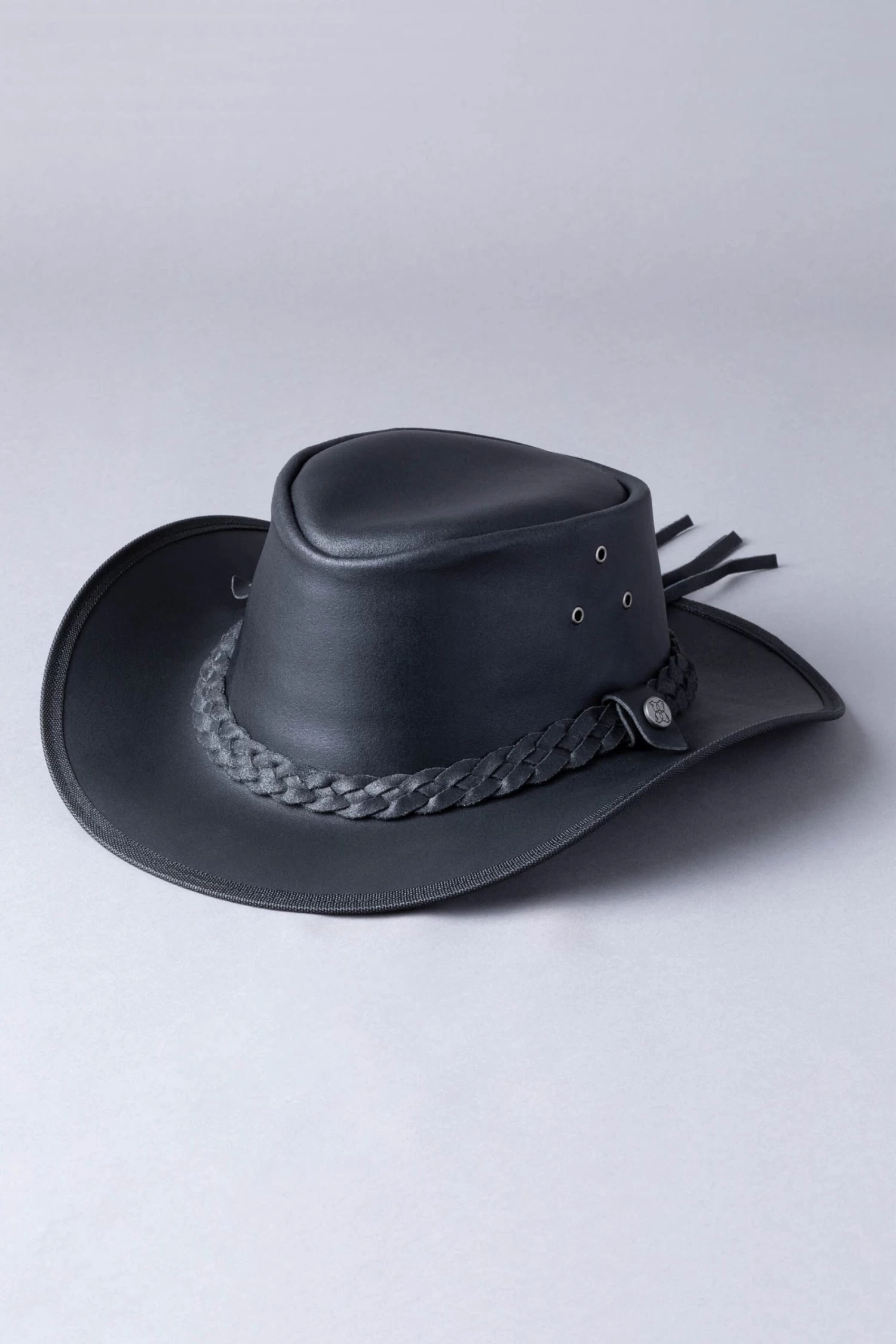 The Outback leather hat in black is our best selling Australian style leather hat. Crafted from durable water resistant leather, with a cracked finish for a rugged appearance. Finished with the expertise you’d expect from a Lakeland product, including a plaited leather trim, Lakeland embossed press studs and vented eyelets.