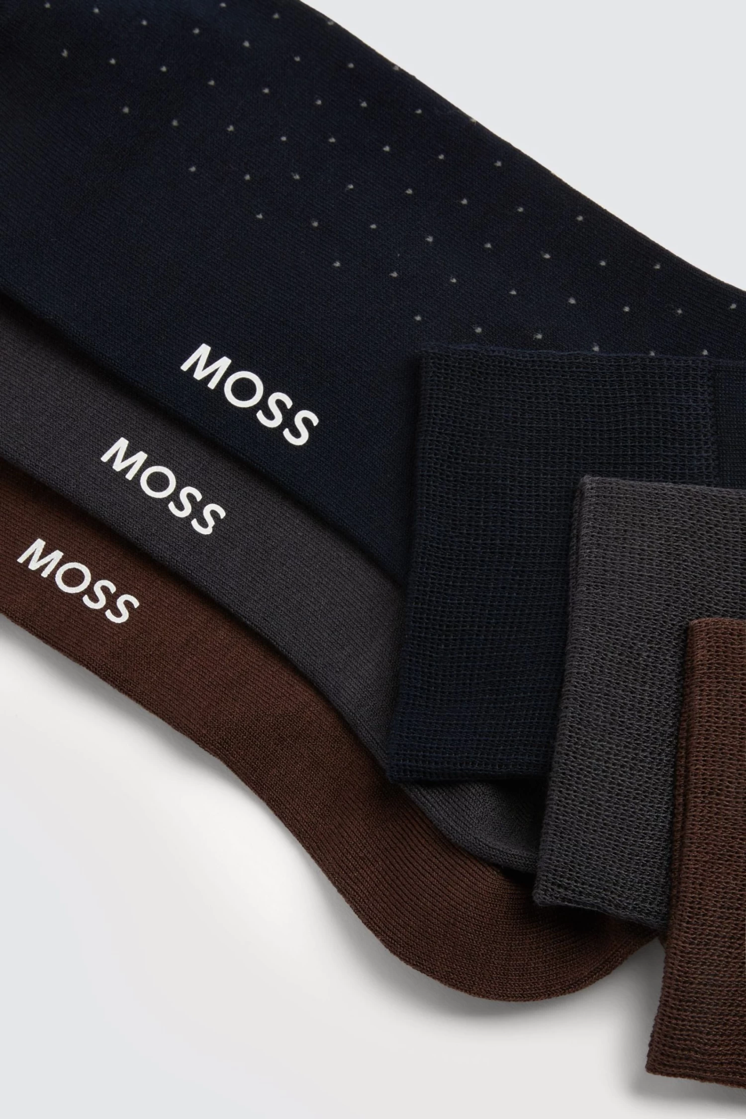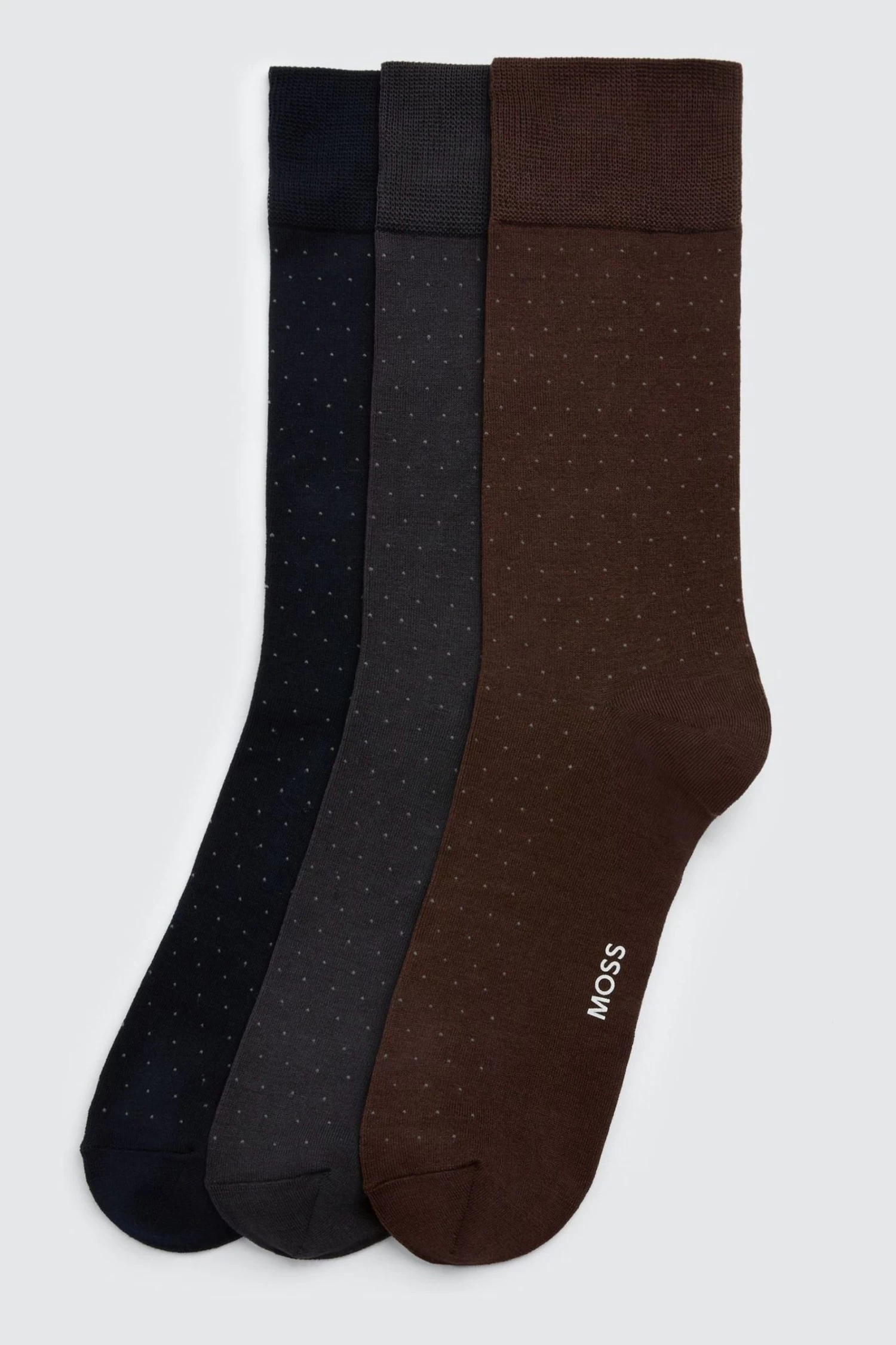 MOSS three-pack of regular-length socks comprises three different colours, each patterned with a pindot motif to bring a shot of interest to your everyday looks. The stretch yarns are rich in cotton to keep your feet breathing throughout the day.
