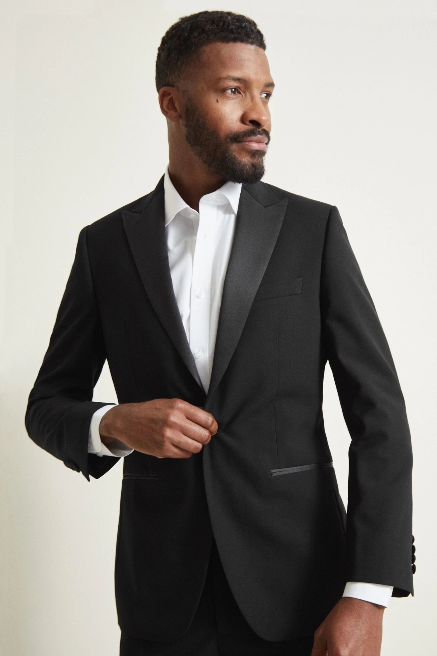 A look that’ll say all the right things about your sense of style, Moss 1851s black dress suit takes all the guesswork out of formal prep. It’s cut to a neat tailored fit in pure-wool cloth with satin-trimmed peak lapels, which you can offset nicely with black studs through your choice of evening shirt.