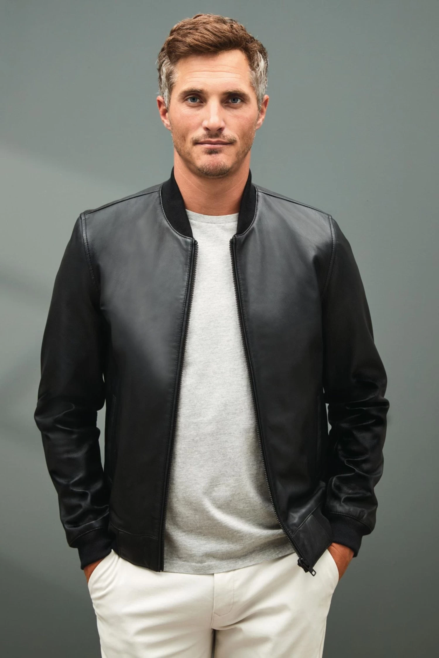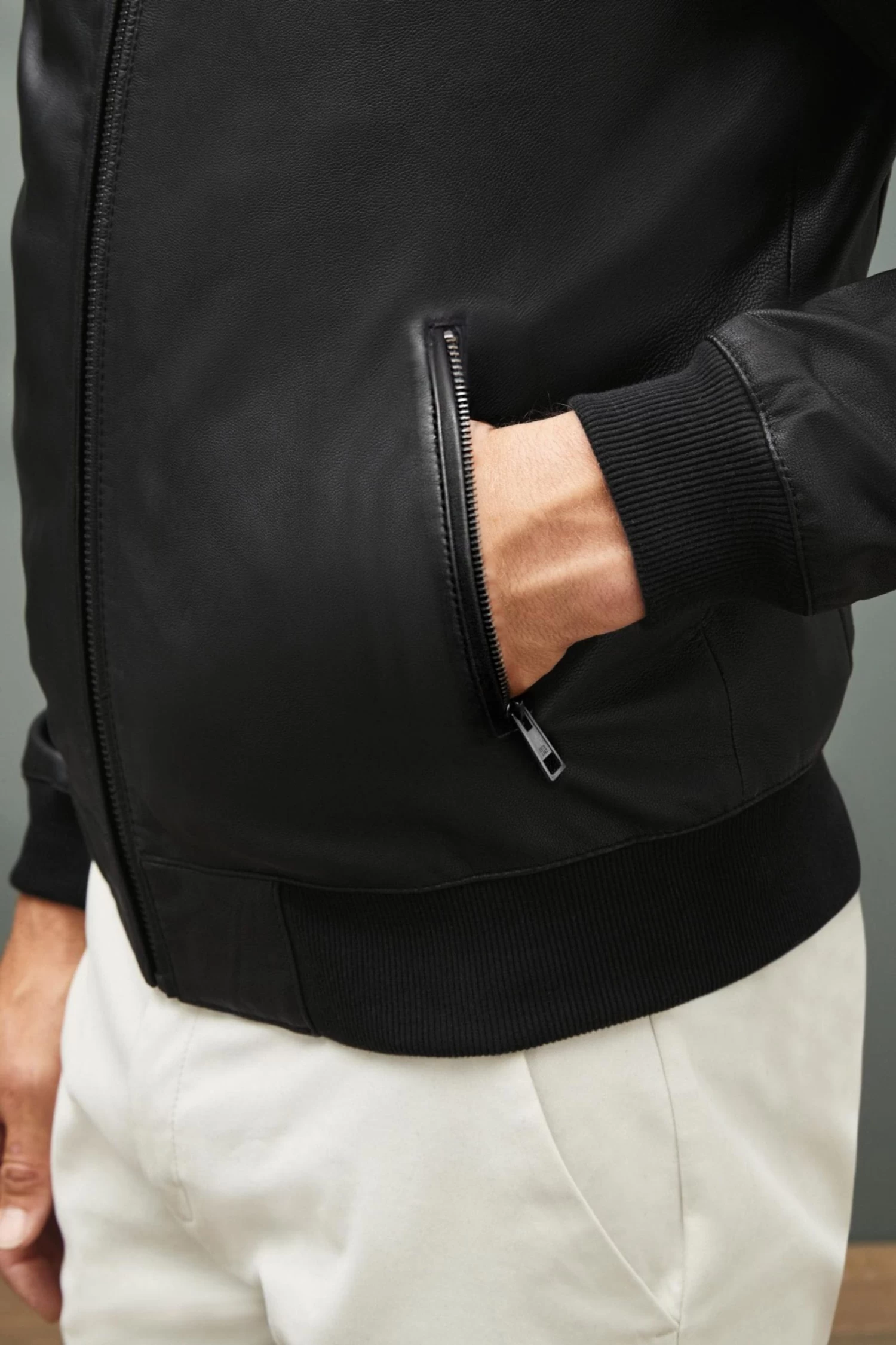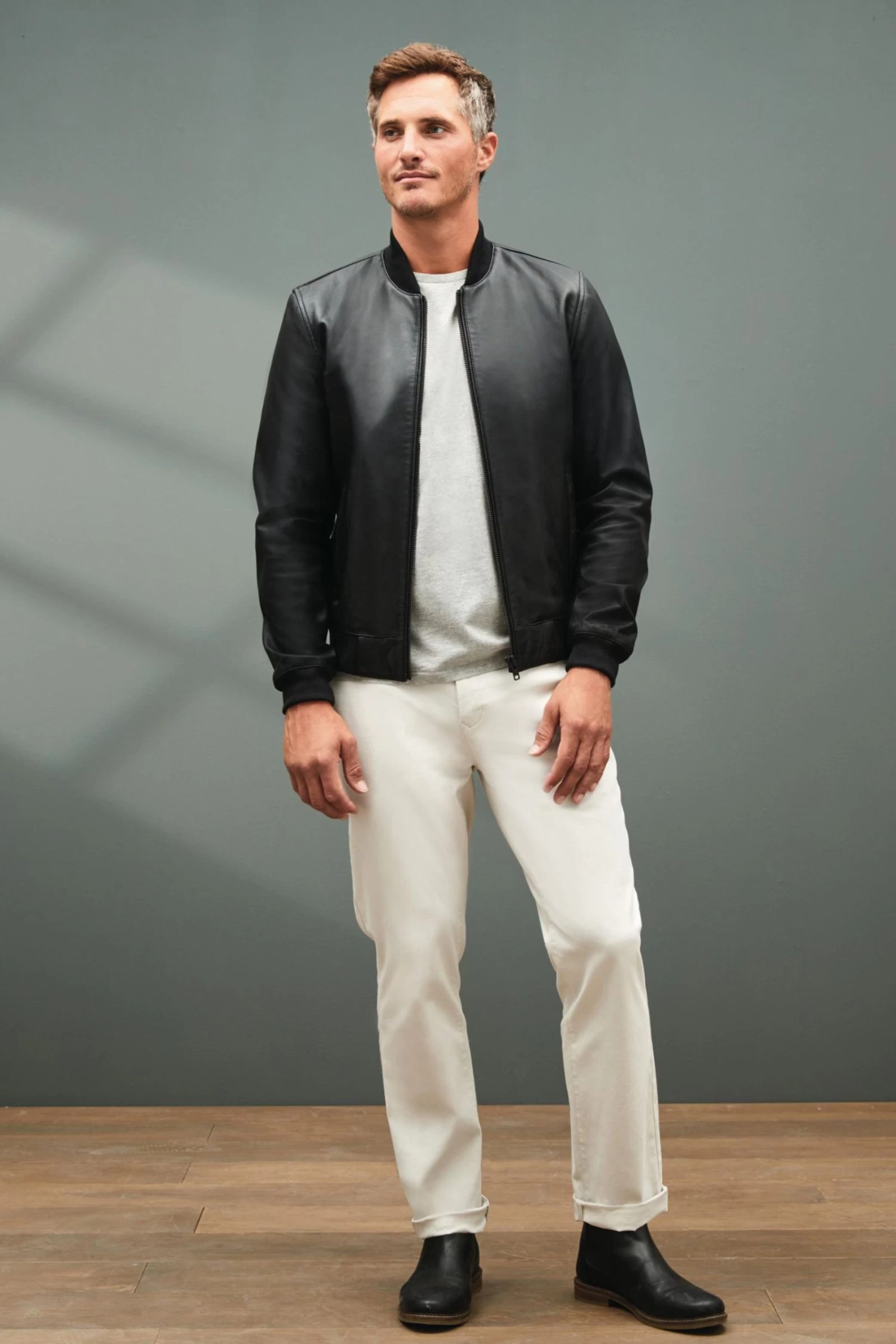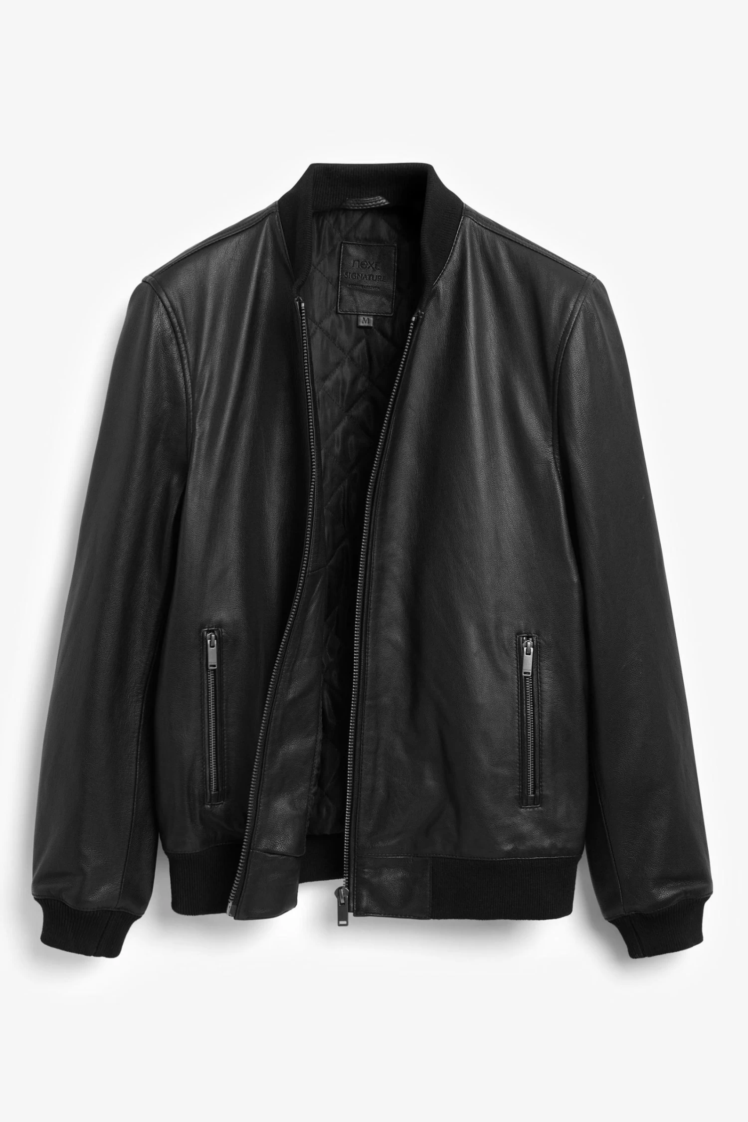 The bomber is a timeless piece of menswear, versatile and trendy it can dress a look up as much as it can pare one down. This edgy Signature leather bomber jacket is an original and timeless outerwear option. Complete with internal welt pocket, gunmetal trims and ribbed hem and cuffs, it is a wardrobe must that will transition you through the seasons.