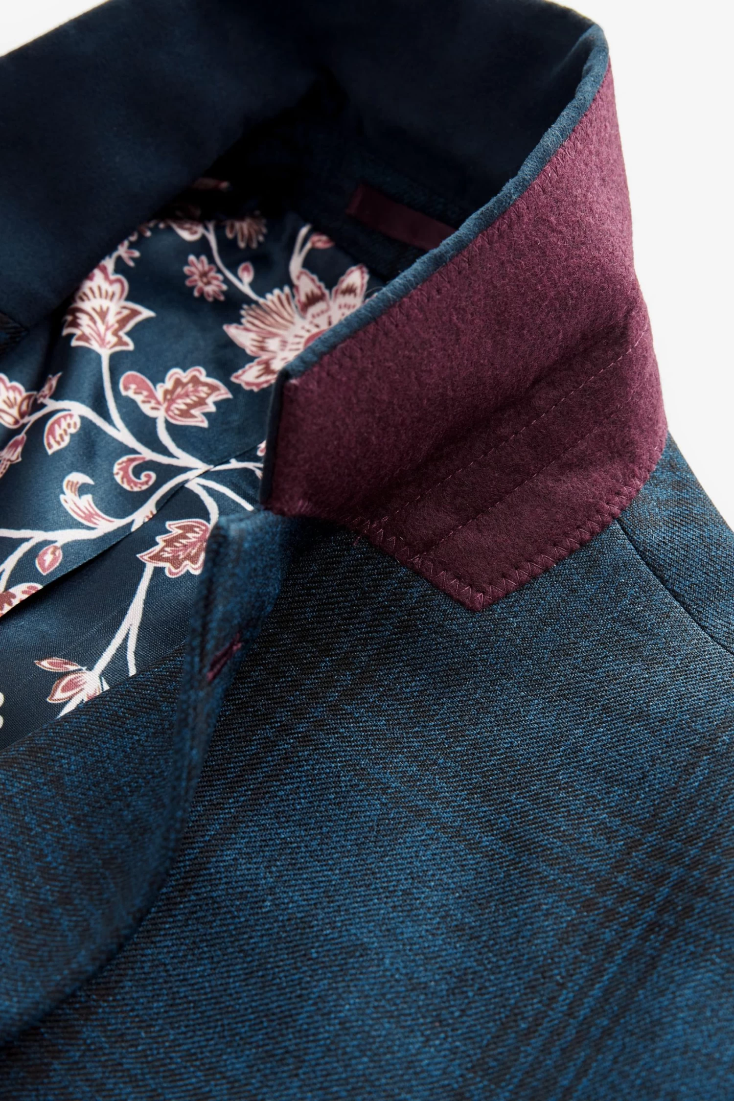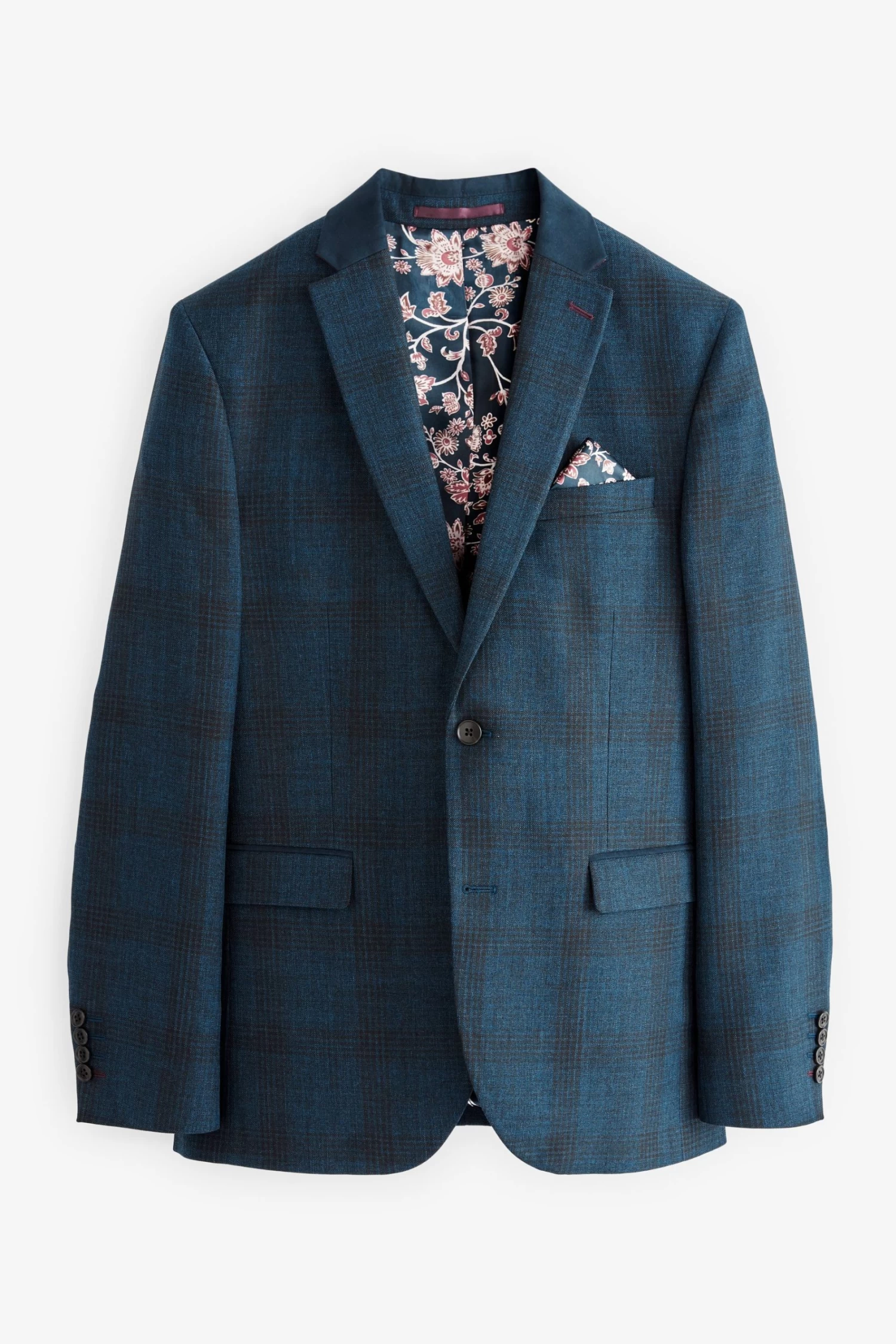 A classic look with a contemporary twist, this modern blue check suit jacket will quickly become a favourite for all those special occasions. This single breasted slim fit design consists of a single button fastening, flap pockets and a peak lapel. Featuring a contrast back and under collar detail and finished with a silky floral lining and pocket square. Pair with our matching trousers and waistcoat to complete the look. Slim fit. Notch lapel collar. Two button fastening. Flap pockets. Silky floral lining. Pocket square. Welted chest pocket.