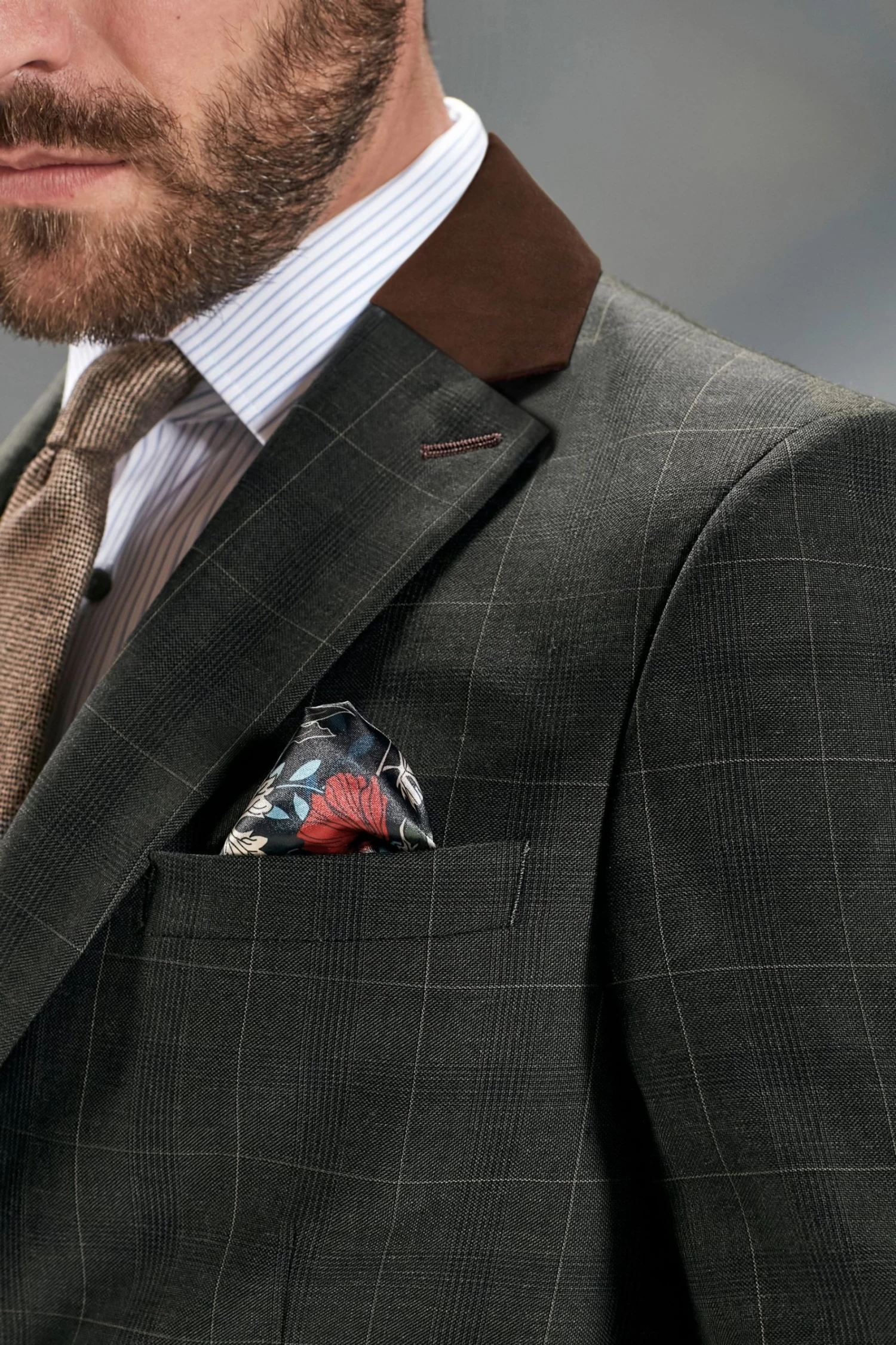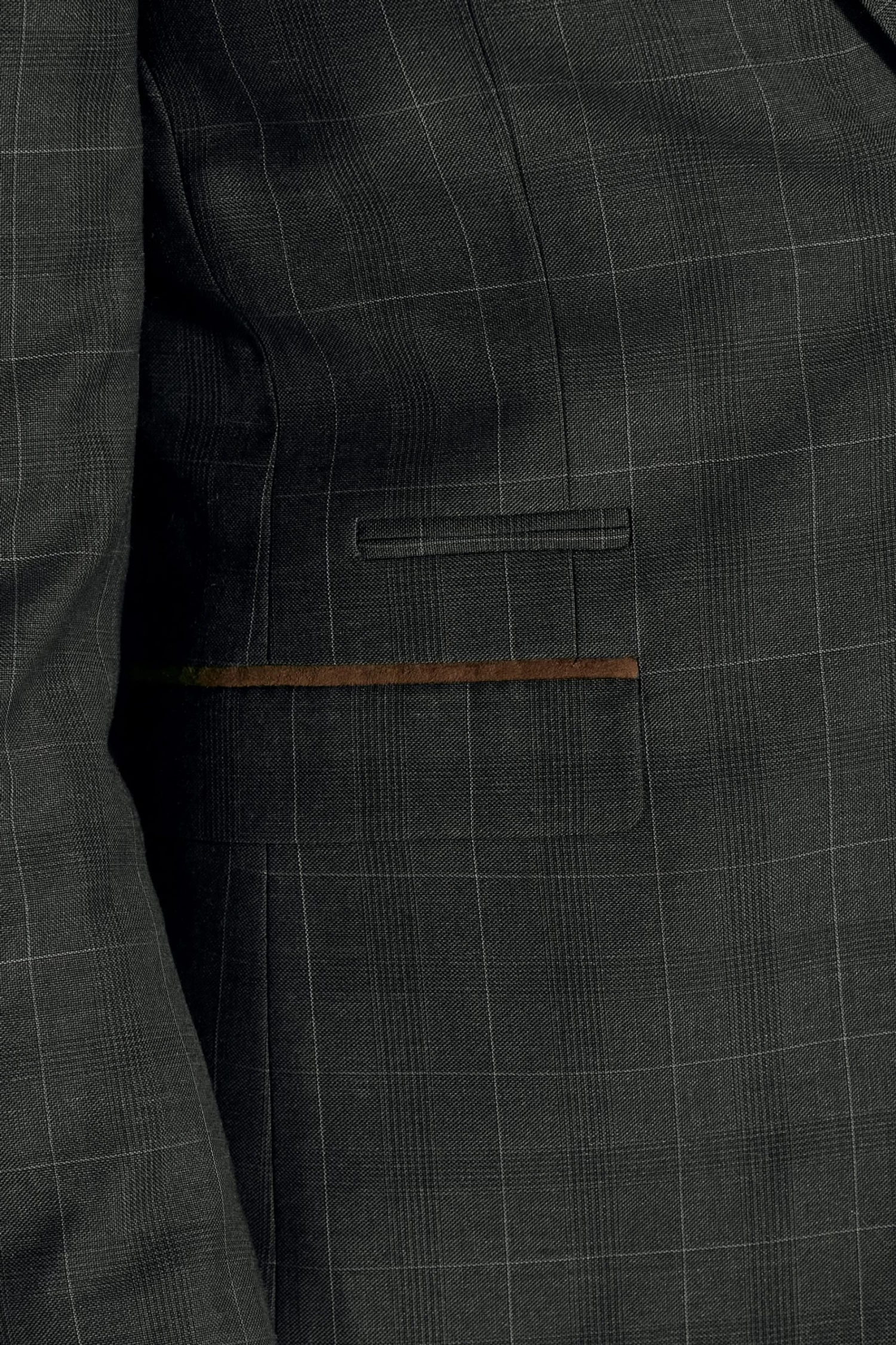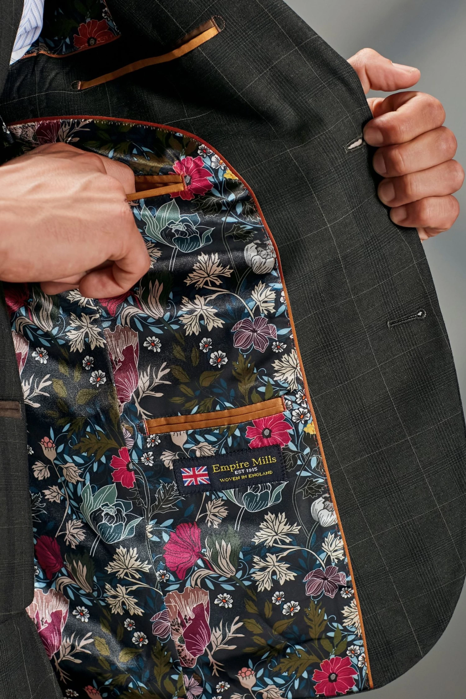 100% British Wool from Empire Mills. Slim fit. Check print. Half canvas chest construction. Two button fastening. Flap front pockets. Welt chest pocket. Side back vents. Corozo button. Printed lining.