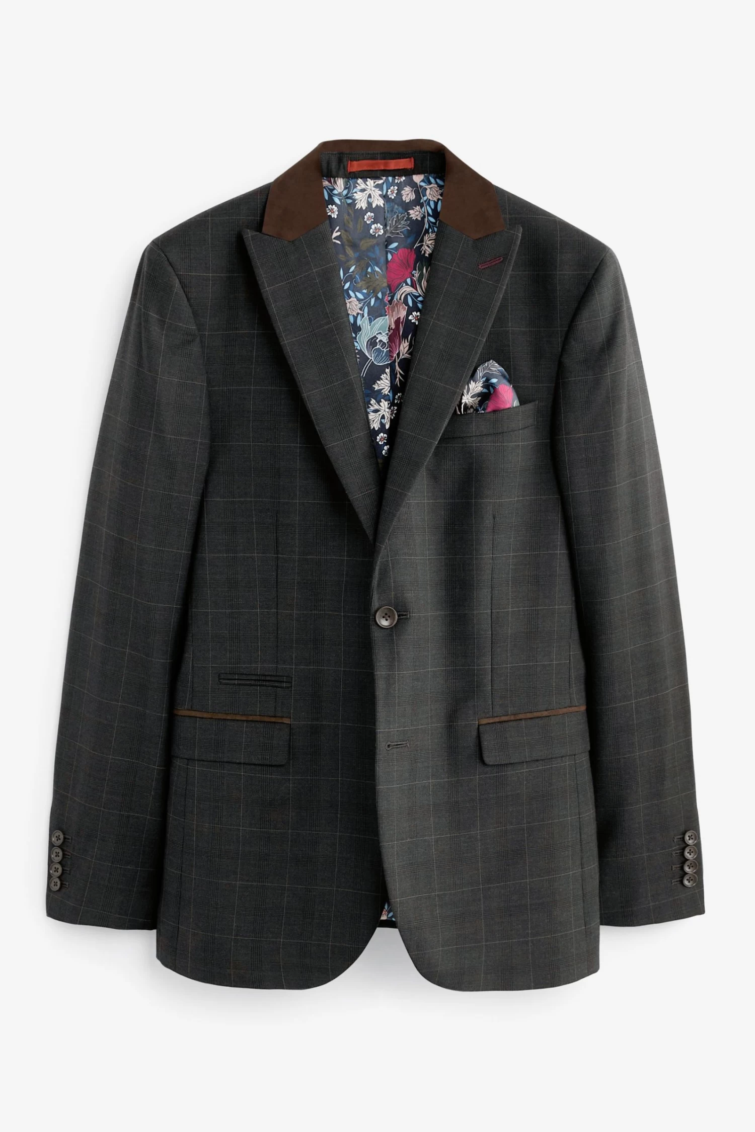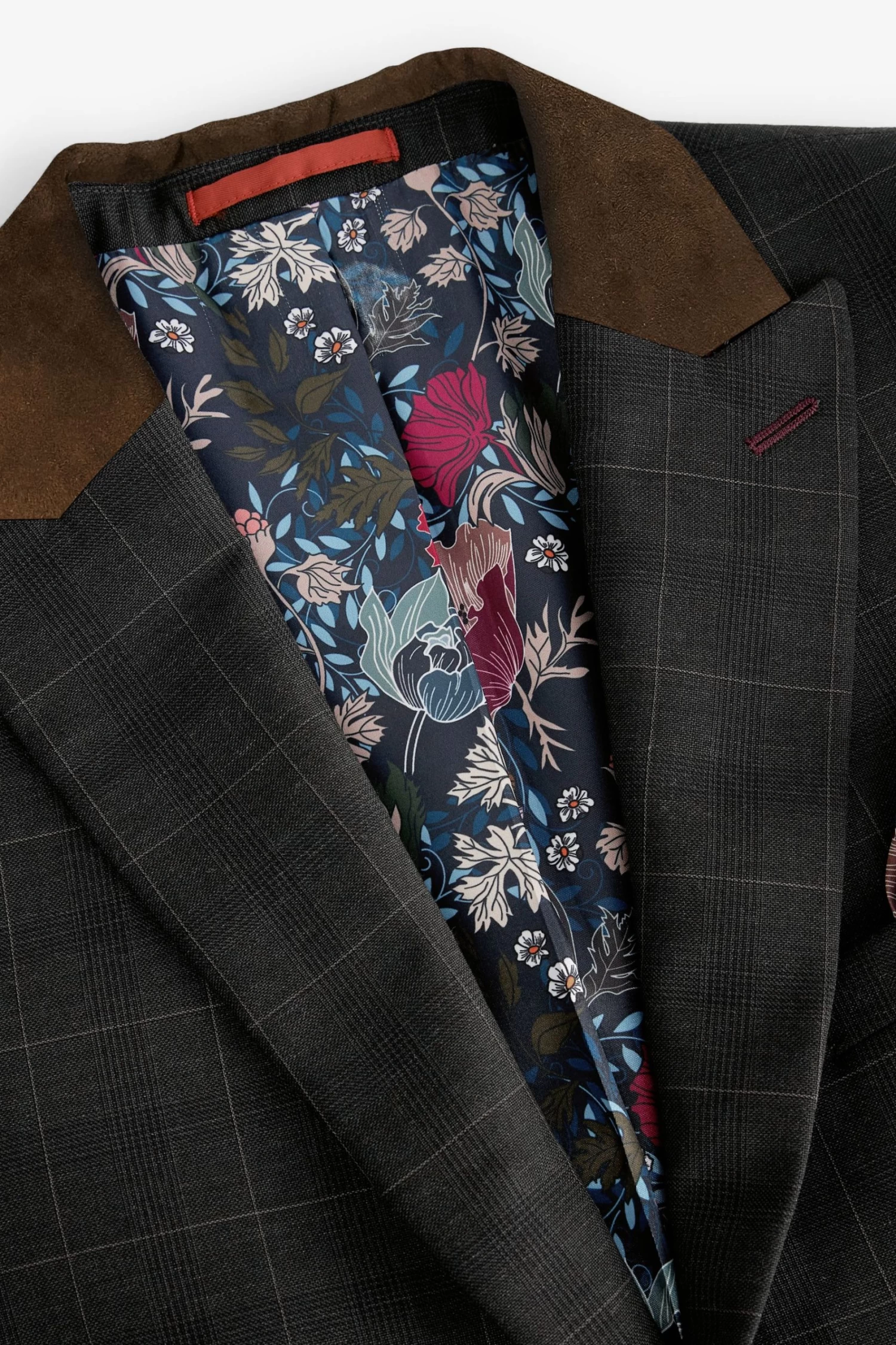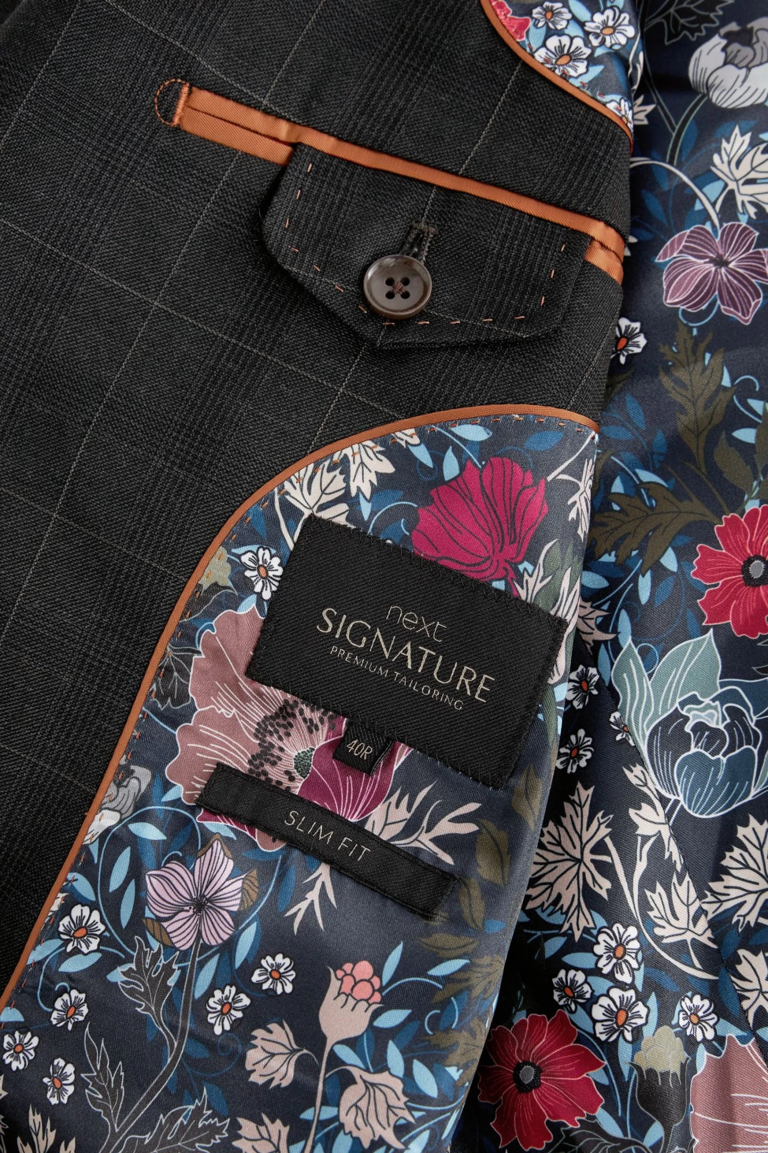 100% British Wool from Empire Mills. Slim fit. Check print. Half canvas chest construction. Two button fastening. Flap front pockets. Welt chest pocket. Side back vents. Corozo button. Printed lining.