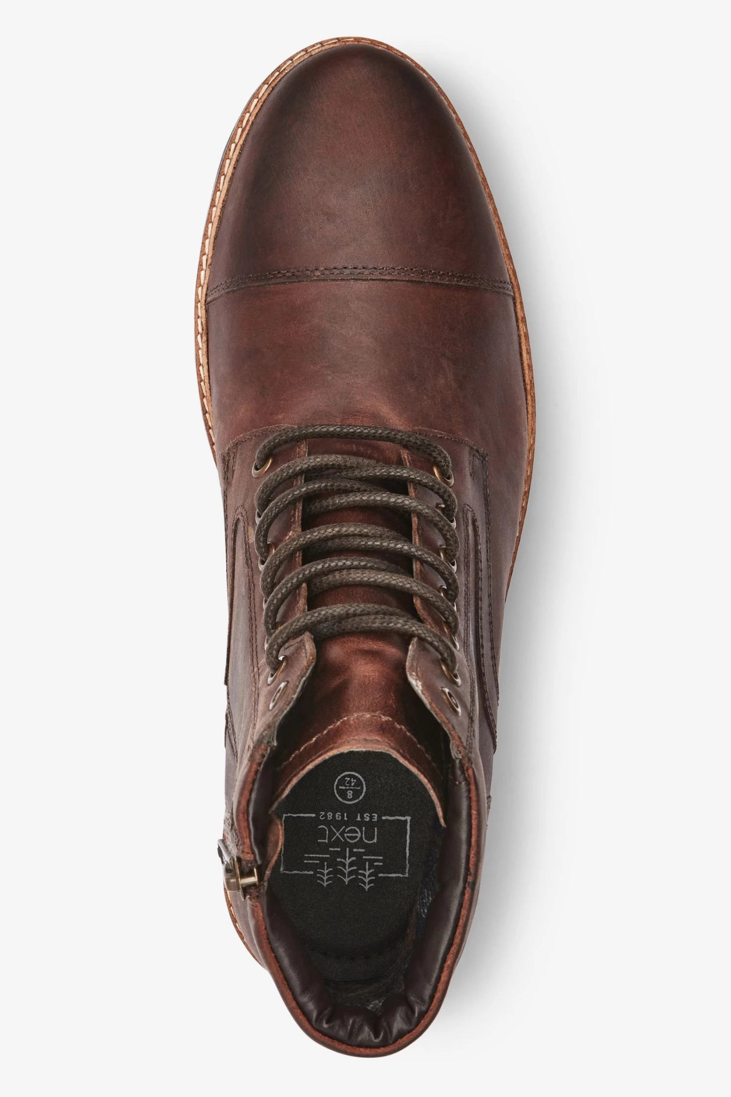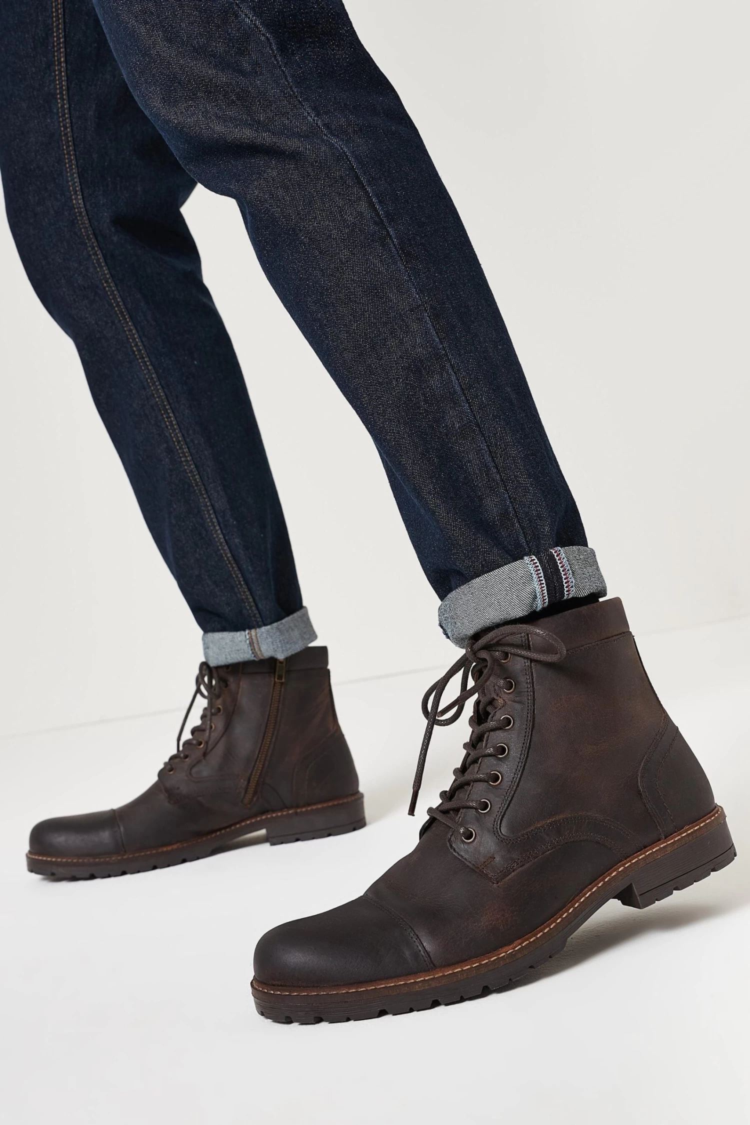 These worker-style boots add a rugged yet slick feel to your casual collection. Made from a rich pull-up leather, these boots with their distressed look, boast impeccable quality with toecap detail. A classic lace-up look with a toecap detail, a zip on the inner and chunky treaded soles.