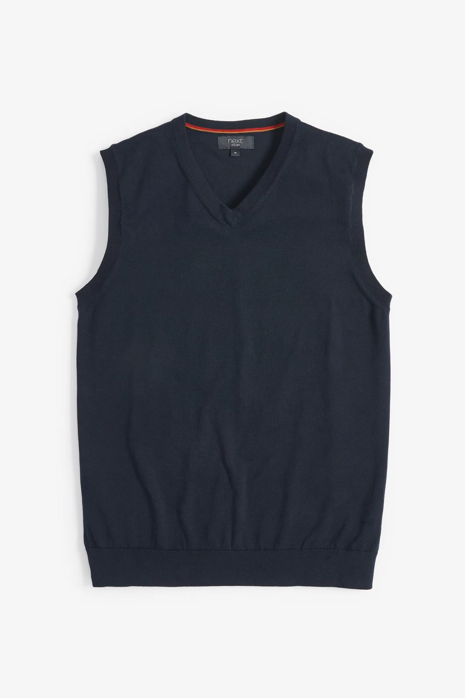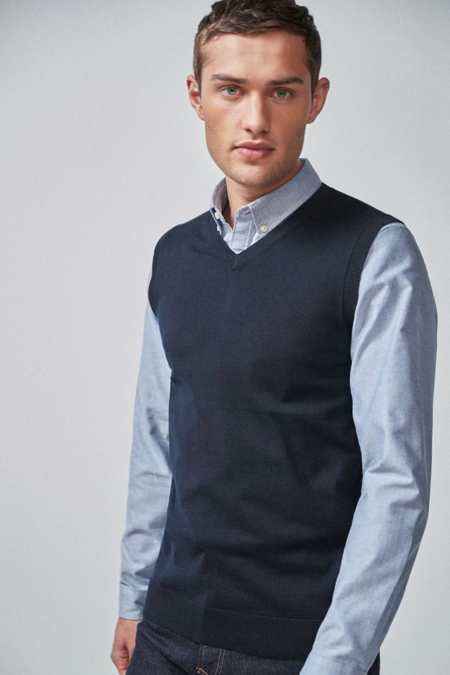 Perfect layering! This sleeveless V-neck jumper has been updated in our new season colour palette. Style it with a long-sleeve shirt for the office.