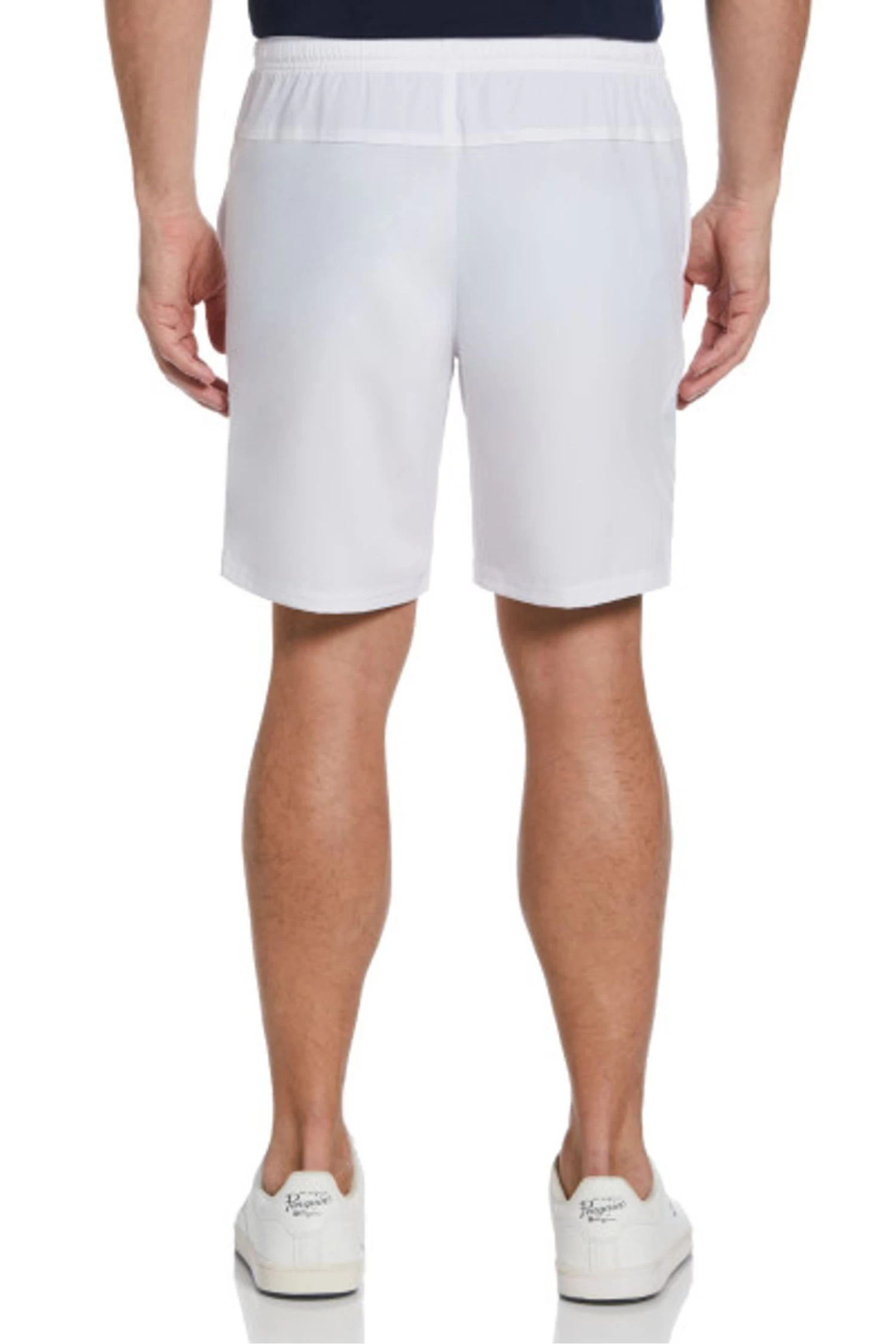 Mens solid 8 ” tennis short with left let pete logo, elastic waist with internal drawstring, 4way stretch fabric and side pockets, easy care moisture wicking stretch fabric.