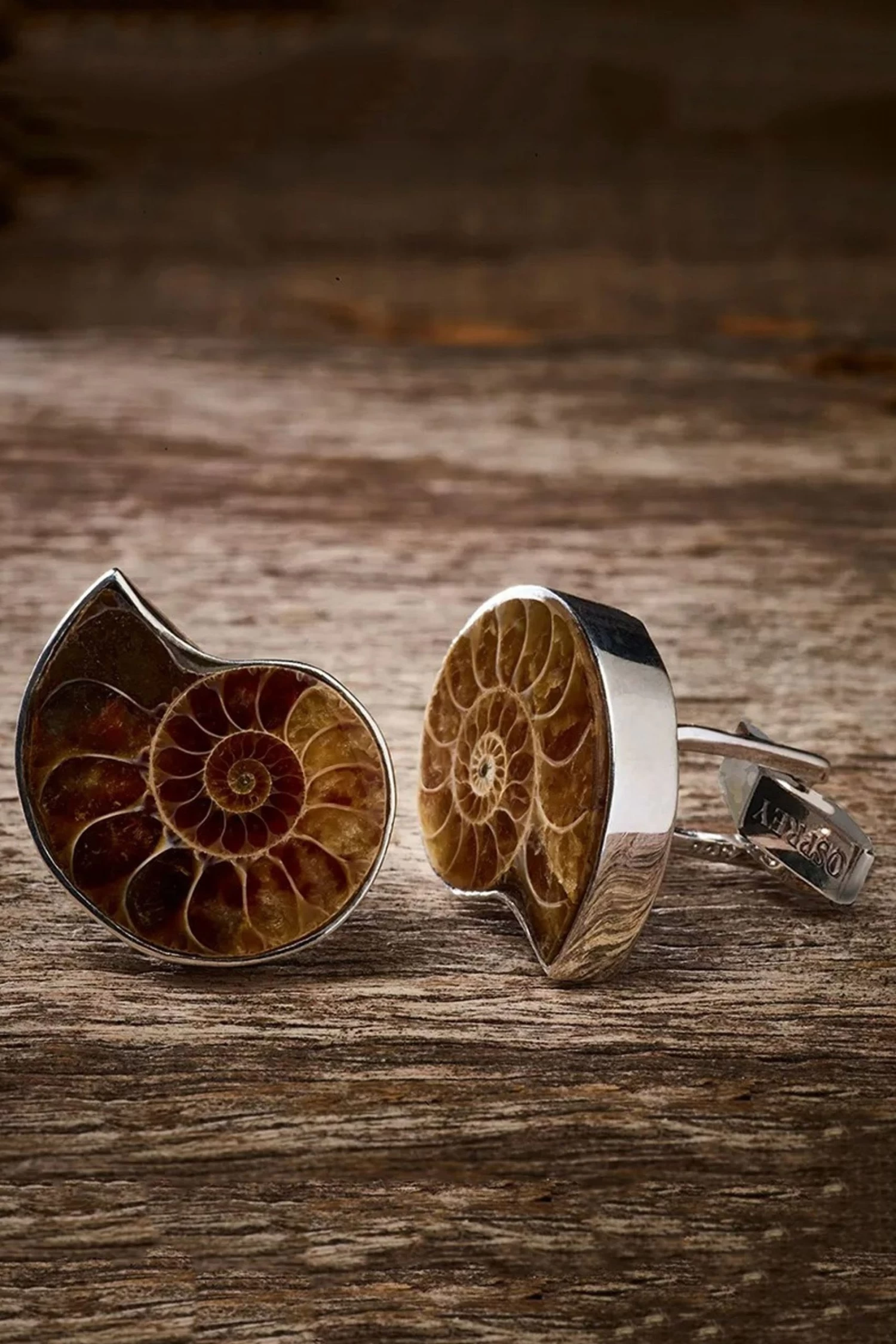 As unique as nature itself, these stunning OSPREY LONDON sterling silver cufflinks feature an ammonite fossil, which is split and polished by hand to reveal a pair of jewels from nature dating back millions of years. Fascinated by the forms and history of fossils since he was a boy, designer Graeme Ellisdon worked with a group of craftsmen to create these unique cufflinks exclusively for OSPREY LONDON. Each ammonite is framed in hand-beaten silver and placed on a stainless steel OSPREY LONDON branded pivot and shank that will fit beautifully through any cuff. As each ammonite is a true one-off, each pair is completely unique and may vary slightly in size (between 15mm and 30mm in diameter) and in colour from the pair shown.