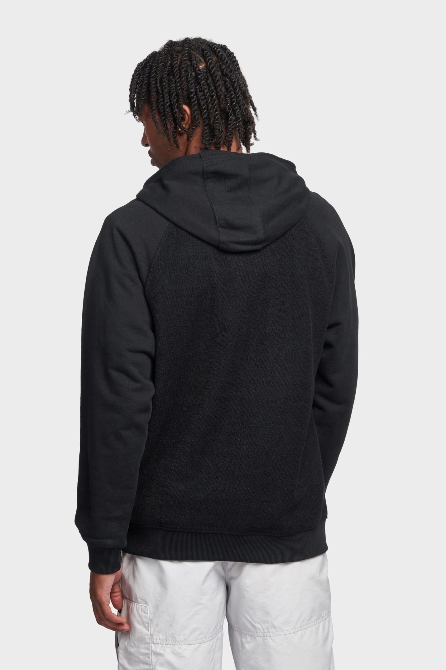 Relaxed fit raglan-sleeve hood in 350gsm loopback cotton, front body in contrast texture using the reverse loopback side of fabric. Drawcord at hood with branded eyelets and aglets. Penfield woven badge at chest. Finished with twin needle cover stitch, rib trim at neck, cuffs and hem and woven tab label. Inspired by the outdoors.