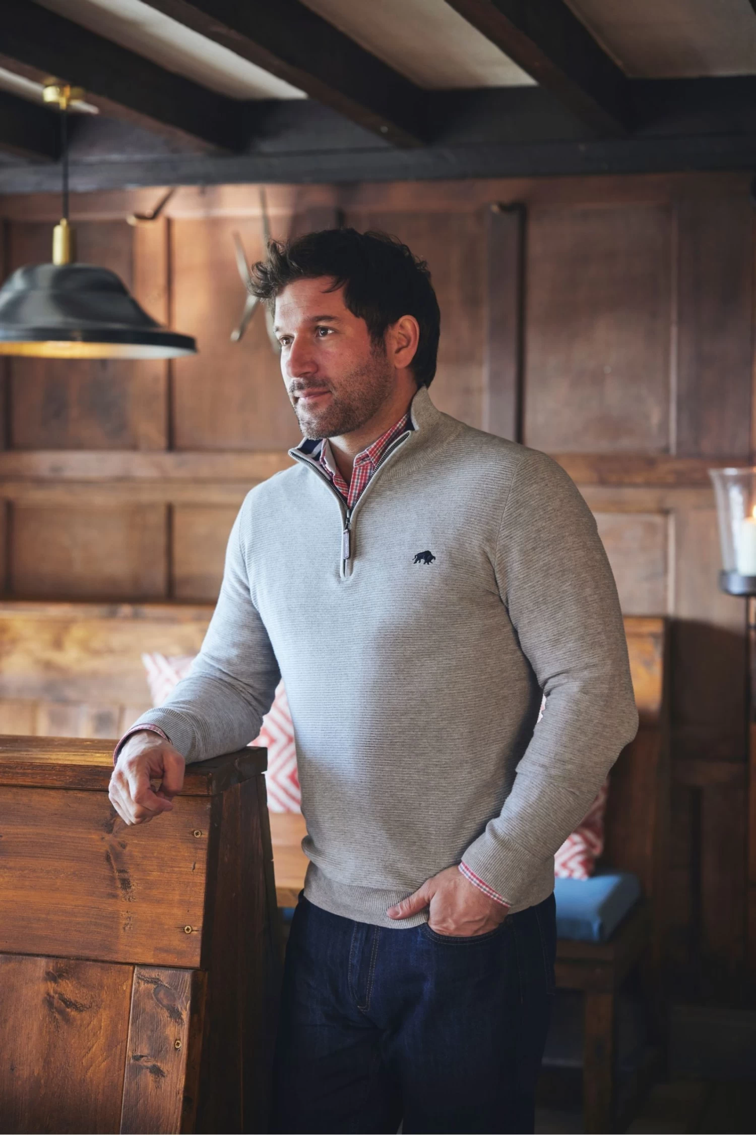 Our classic quarter zip knit is the perfect addition to your wardrobe all year round! With ribbed detail all-over, striped print inside the collar, and featuring our iconic bull logo on the left hand side of the chest it’s the ideal piece for all your layering needs on those cooler evenings.