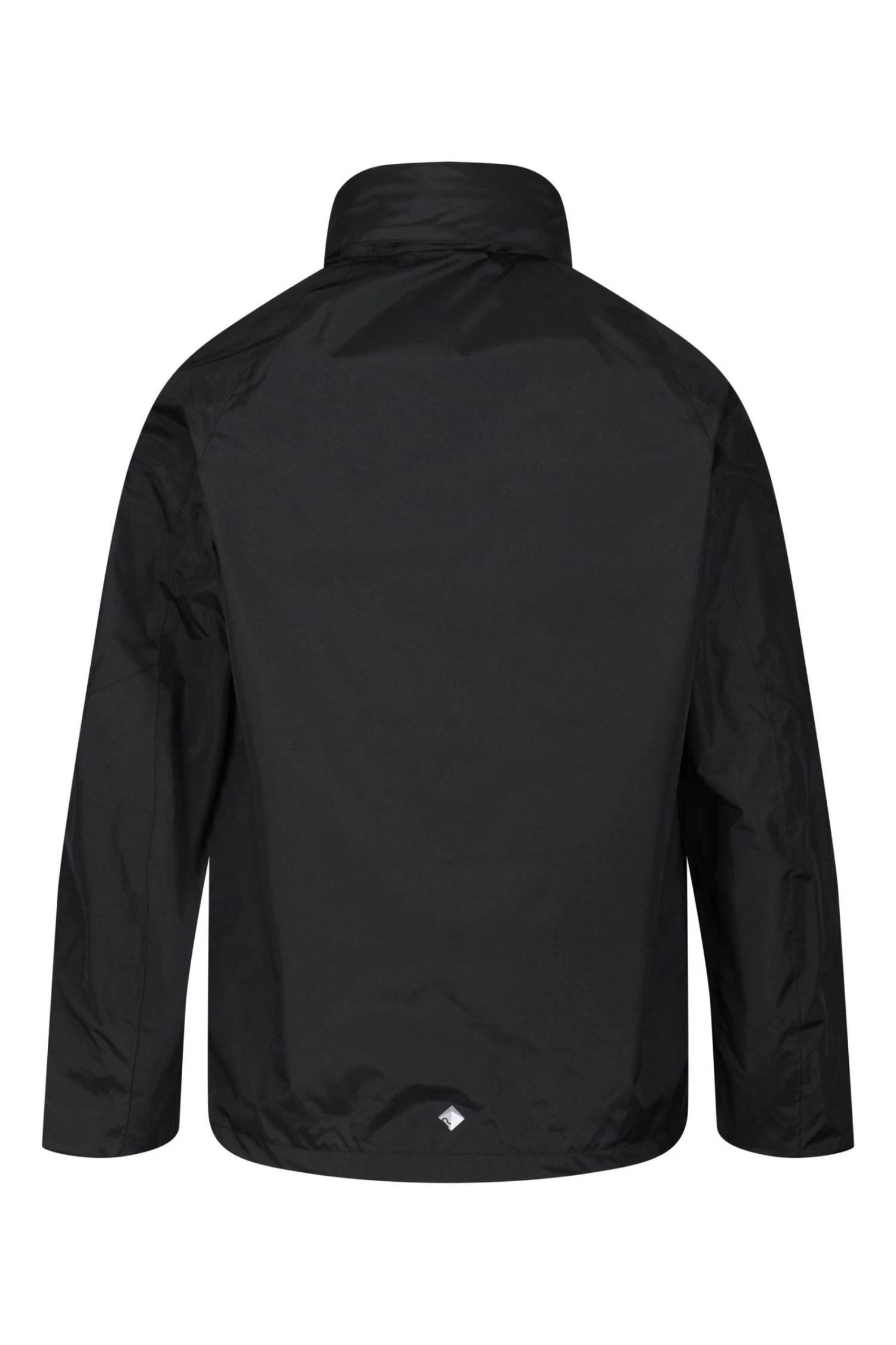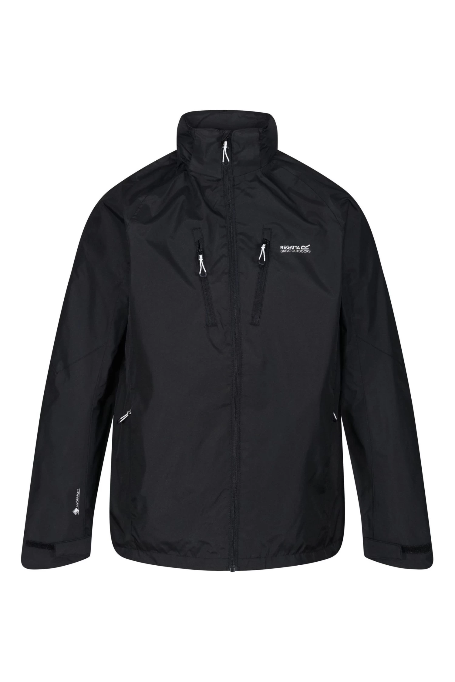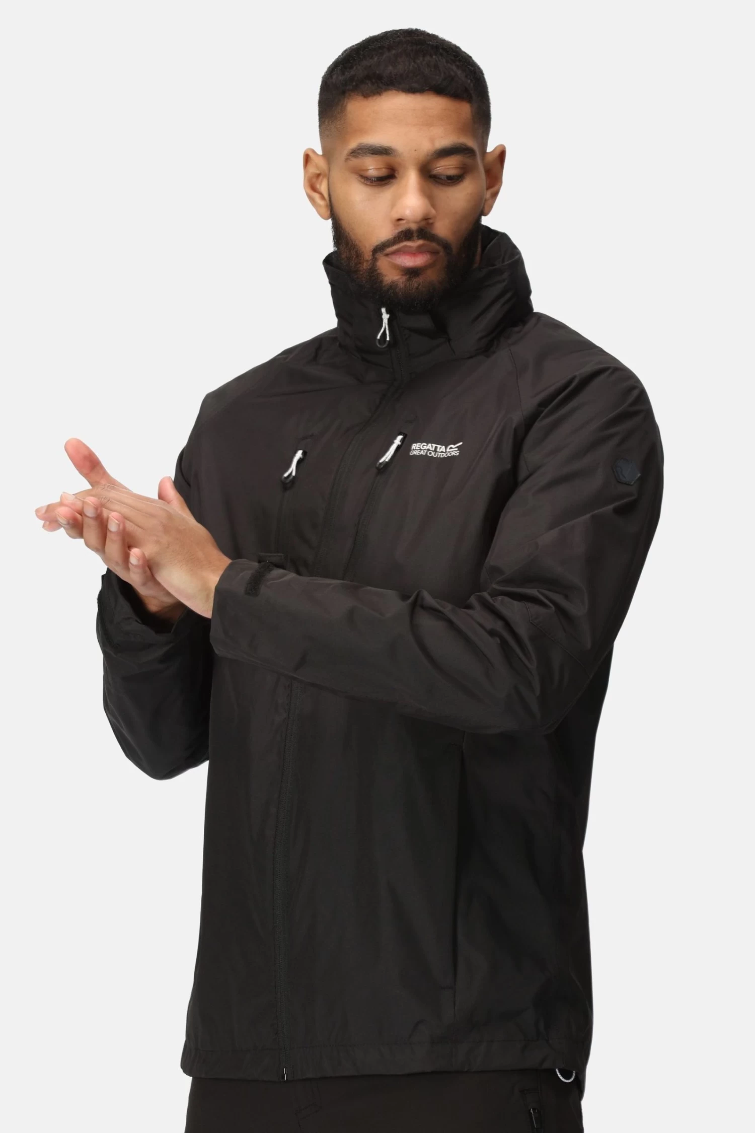 Waterproof polyester with sealed seams and a DWR (Durable Water Repellent) finish delivers reliable wet weather protection. Comfort features include: a lightweight, soft-touch lining, an adjustable hood that rolls down and packs away with a neat design, adjustable hook and loop cuffs and an easy-adjust shockcord hem. With multiple pockets, including a zipped one on the inside and the Regatta print on the chest.