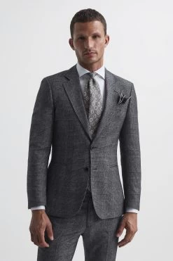 Choose the Babbington for heritage suiting with a style refresh. This single-breasted blazer is crafted from premium yarns into a checked design. It features notch lapels and a two-button close, and will look just as good in the boardroom as it will at your upcoming events. Wear with the coordinating trousers, add a REISS shirt and tie then choose our double-strap monk shoes for ultimate appeal. Notch lapels. Two-button closure. Buttoned cuffs. Dual jetted pockets. Double vent to reverse. Fully lined. The model is wearing a size 38. Measurements of model: Height 6ft 3″ / 191cm, Chest 40″ / 102cm, Waist 28″ / 71cm.