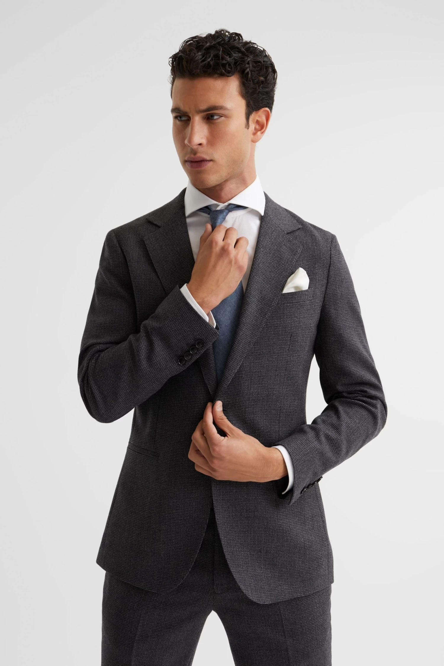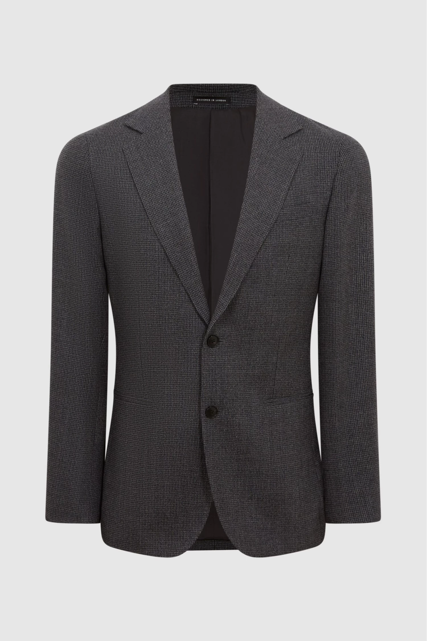 The Bamburgh suit channels heritage styling with its puppytooth check finish. It’s crafted from a rich wool blend with traditional notch lapels, buttoned cuffs and a three-pocket layout. The single-breasted design lends an updated feel. Wear over a classic Reiss’ shirt and coordinate with the matching trousers for a sleek edit. More details:- Notch lapels. Single-breasted silhouette. Two-button closure. Jetted pockets. Internal pockets. Double vents to reverse. Puppytooth check. Fully lined.