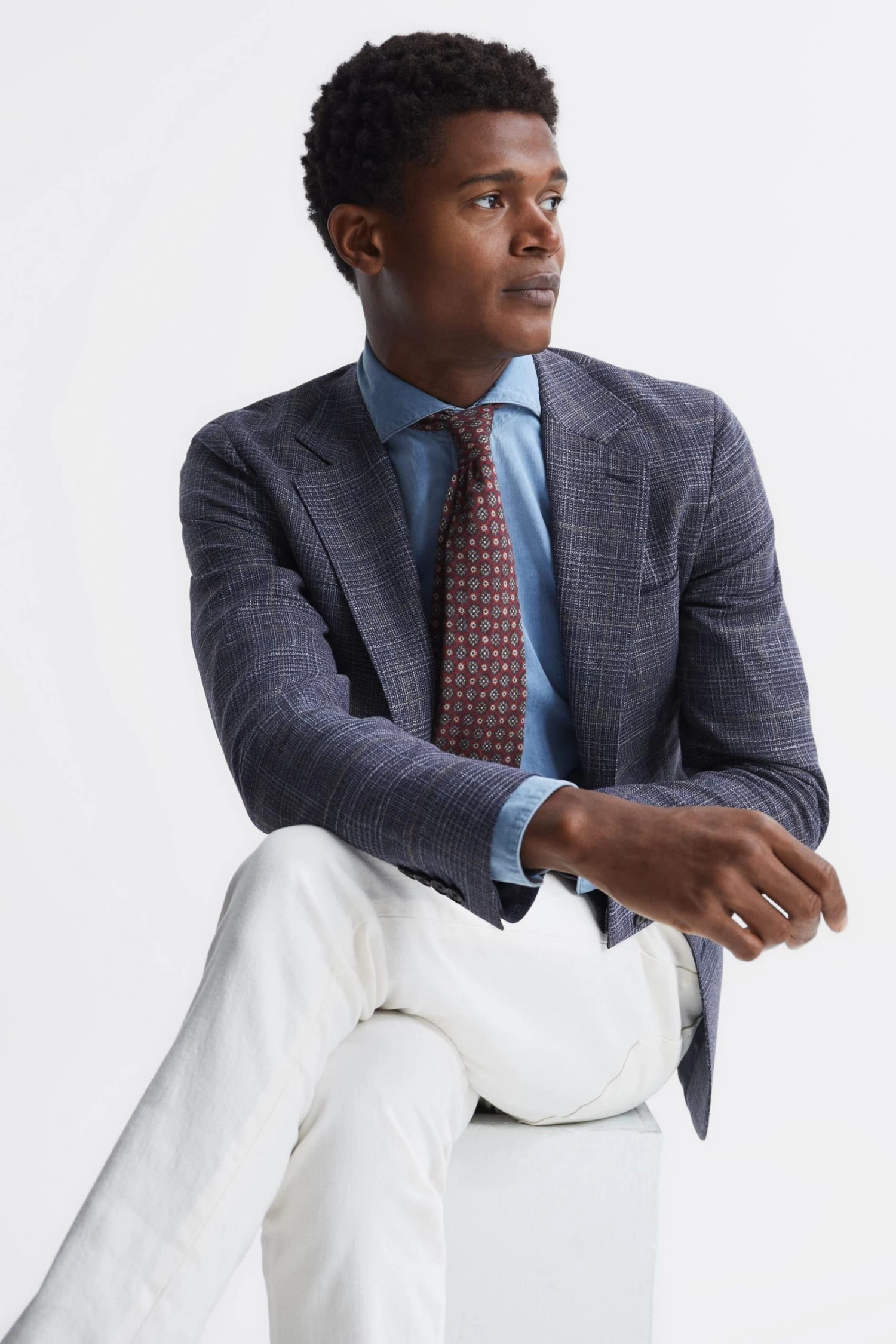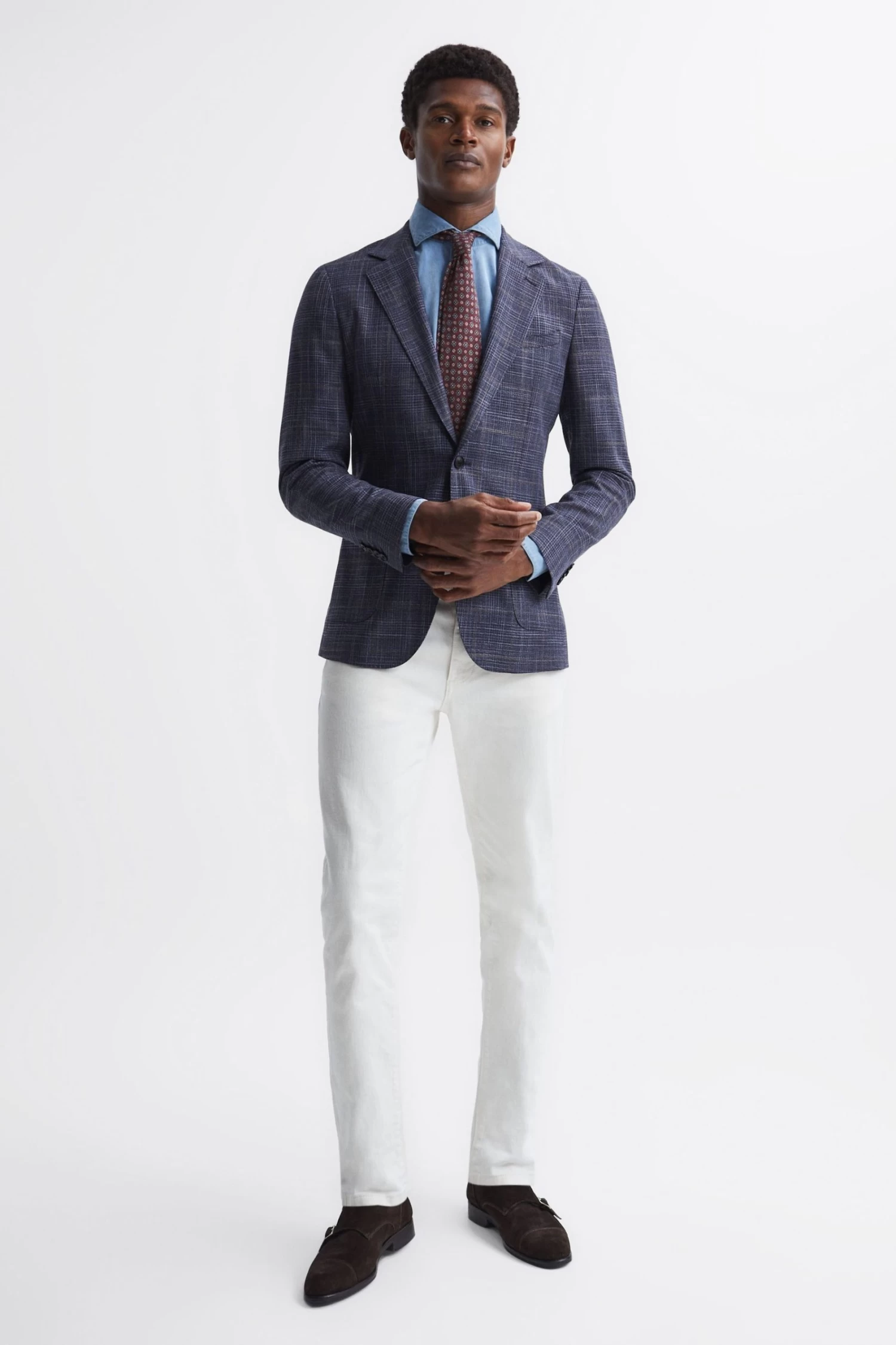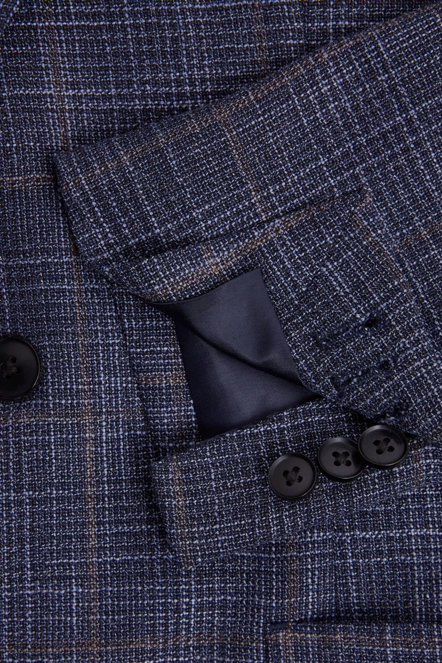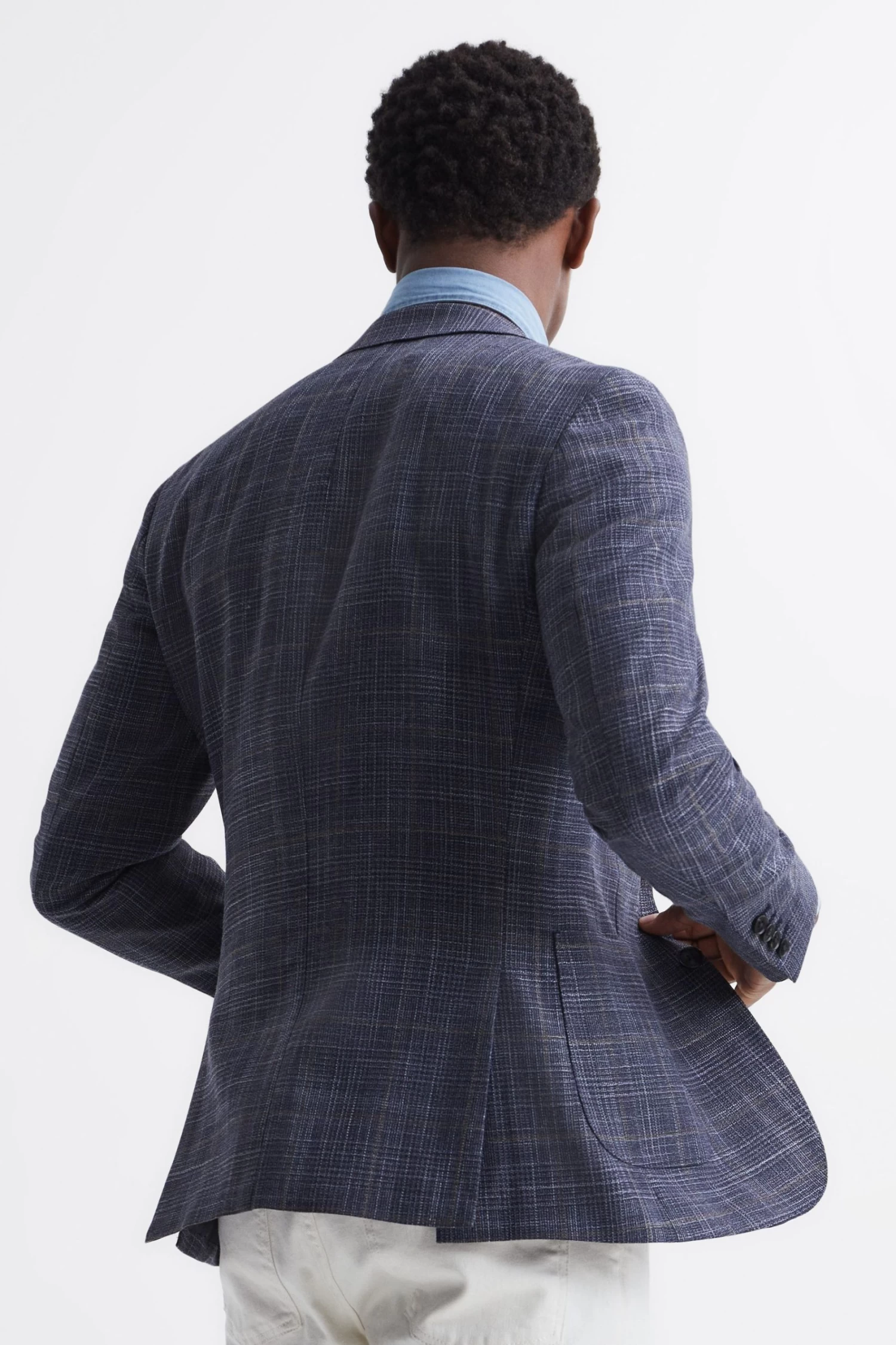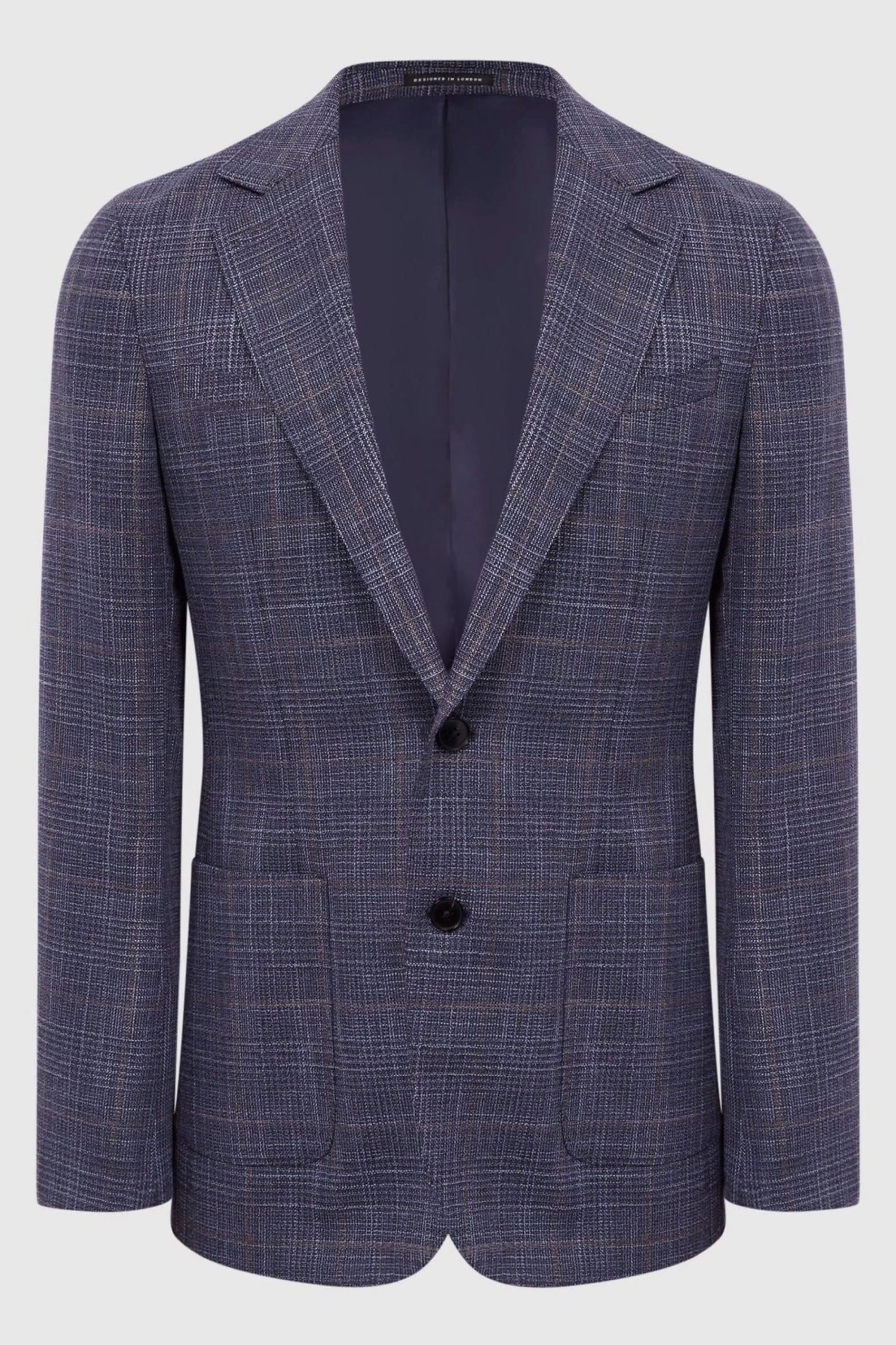 The Belvedere blazer in Indigo is crafted from a rich wool blend into a classic Prince of Wales check, combining classic comfort with enduring style. It’s single-breasted and features notch lapels and buttoned cuffs. Dual patch pockets are added for practicality, providing everyday appeal. Wear it over a shirt as part of your on-duty rotation. Prince of Wales check. Notch lapels. Single-breasted. Two-button closure. Buttoned cuffs. Dual patch pockets to hip. Chest welt pocket. Double vent to reverse. Wool blend. Lined. The model is wearing a size 38 Measurements of model: Height 6ft 2.5 / 189cm.