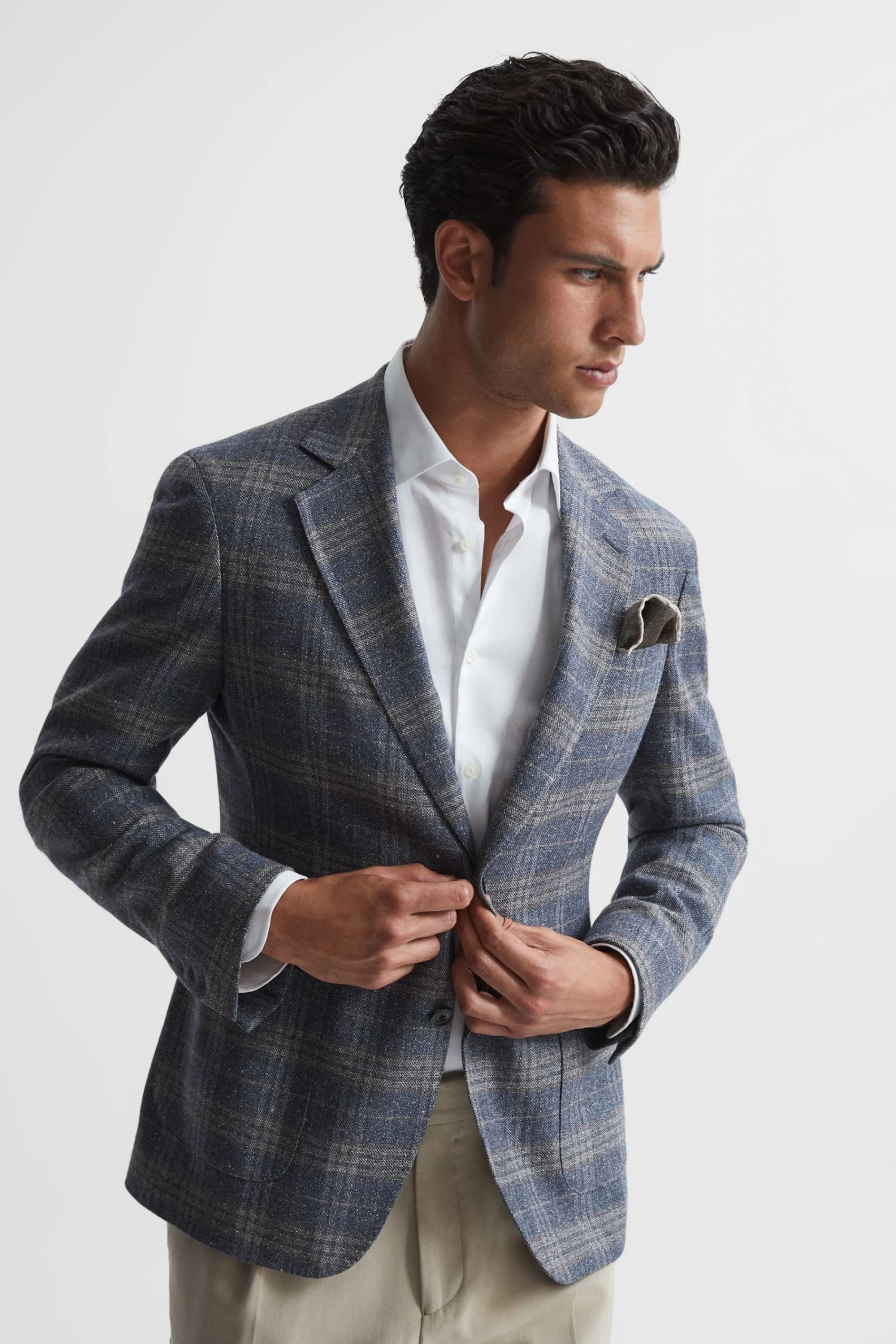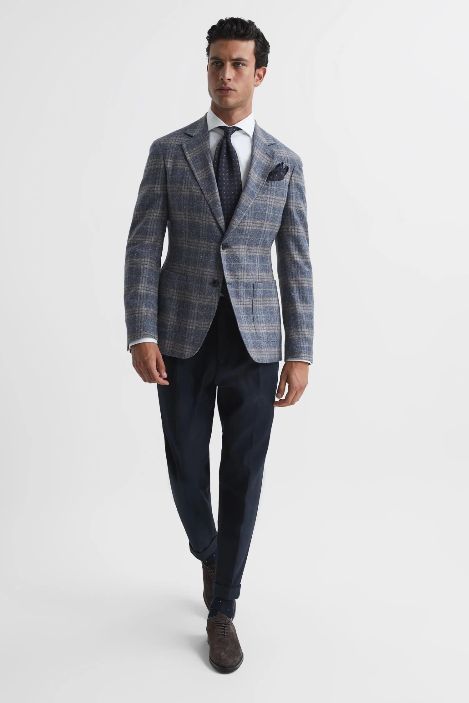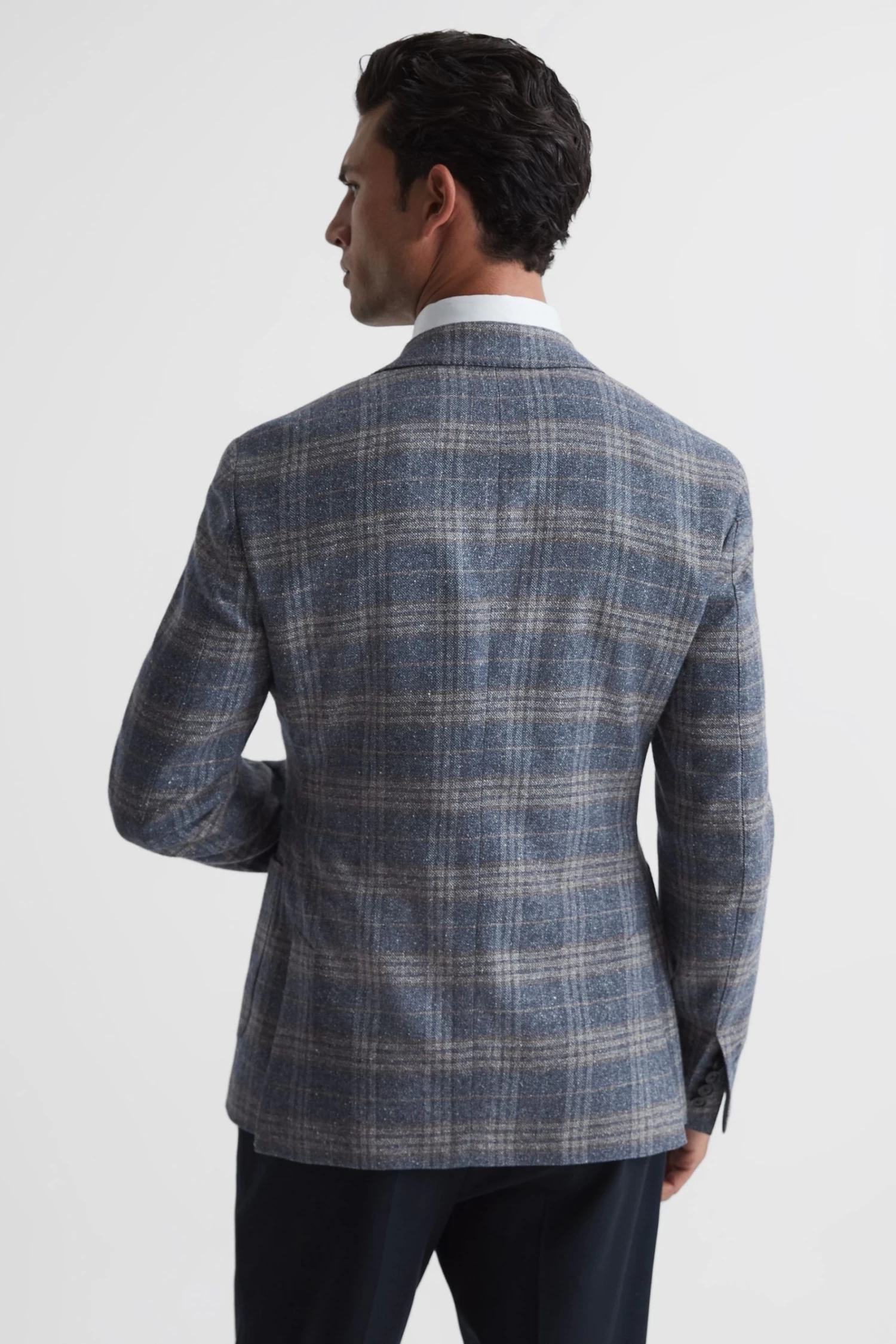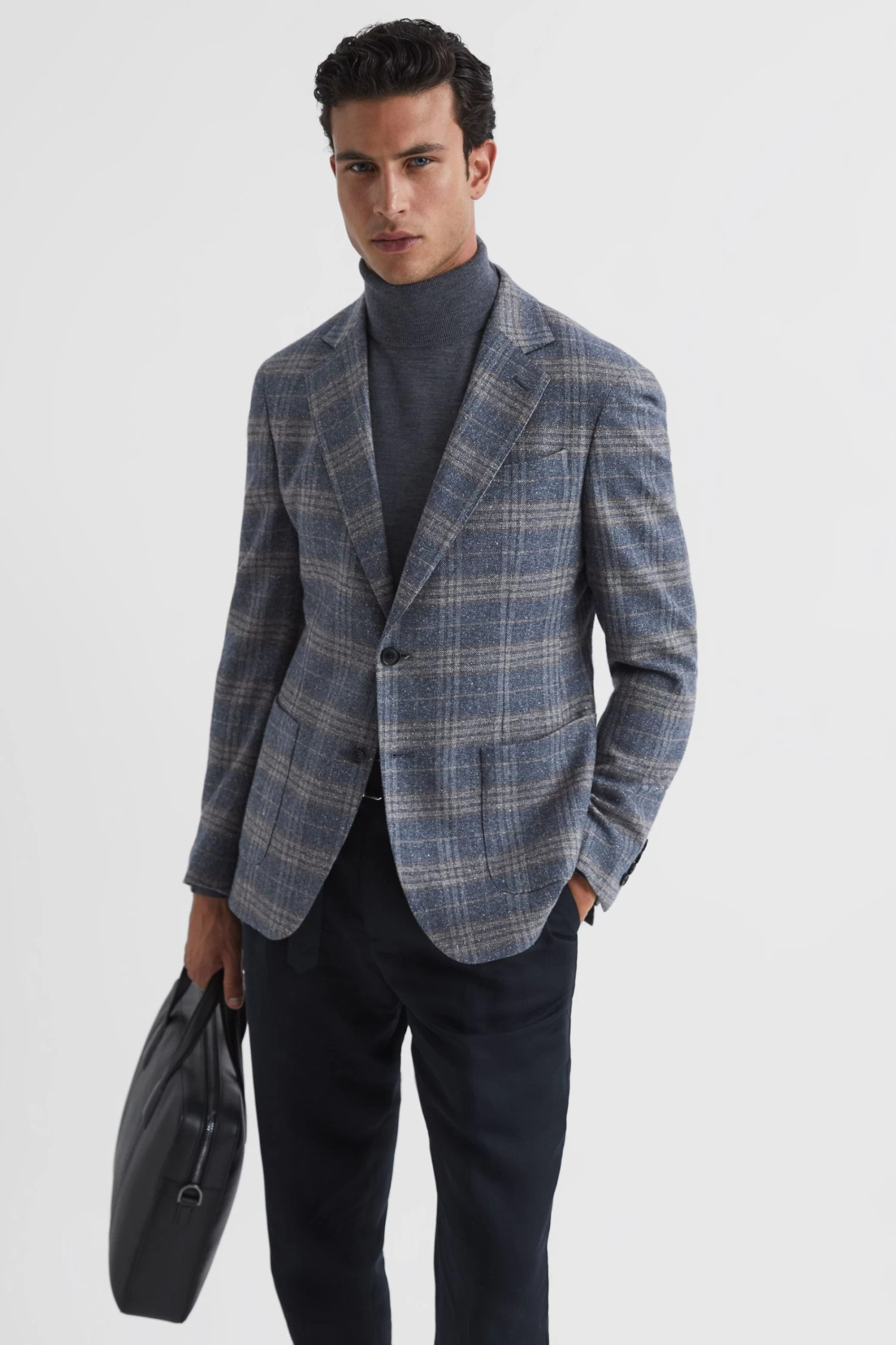 The Bloomsbury blazer is crafted in a REISS signature airforce blue shade, ideal for the modern man. It s fabricated from a rich wool blend with hints of silk for a luxurious finish. The checked design and single-breasted, slim-fit shape lend a heritage feel. Wear over a shirt with formal trousers and add a fresh pair of monk strap shoes for effortless poise. Notch lapels. Single breasted. Two-button closure. Buttoned cuffs. Patch pockets. Dual vents to reverse. Checked Satin-feel buggy lining. Slim Fit.