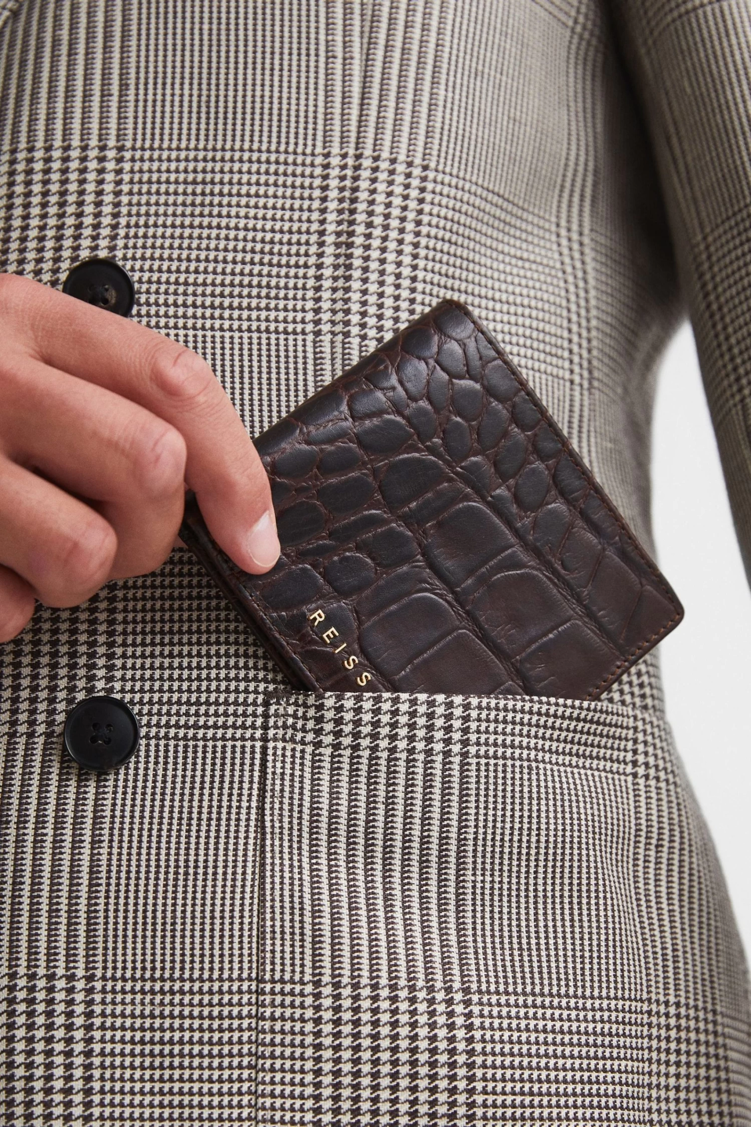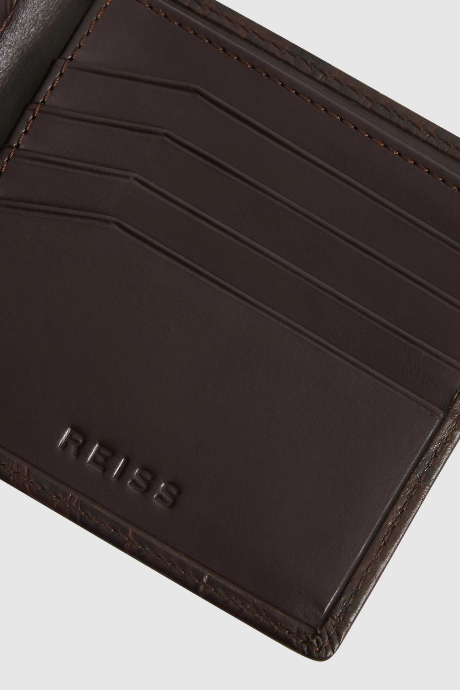 The Cabot wallet is the ideal accessory to keep your money in check. Its crafted from luxurious leather with a stylish snake-effect finish and has a bi-fold design with internal slots for your credit cards as well as a section for notes. 100% leather. 8 card slots. Large notes section. REISS embossed logo. Stitched edges. Measurements of model: Height 6ft 2″ / 188cm.