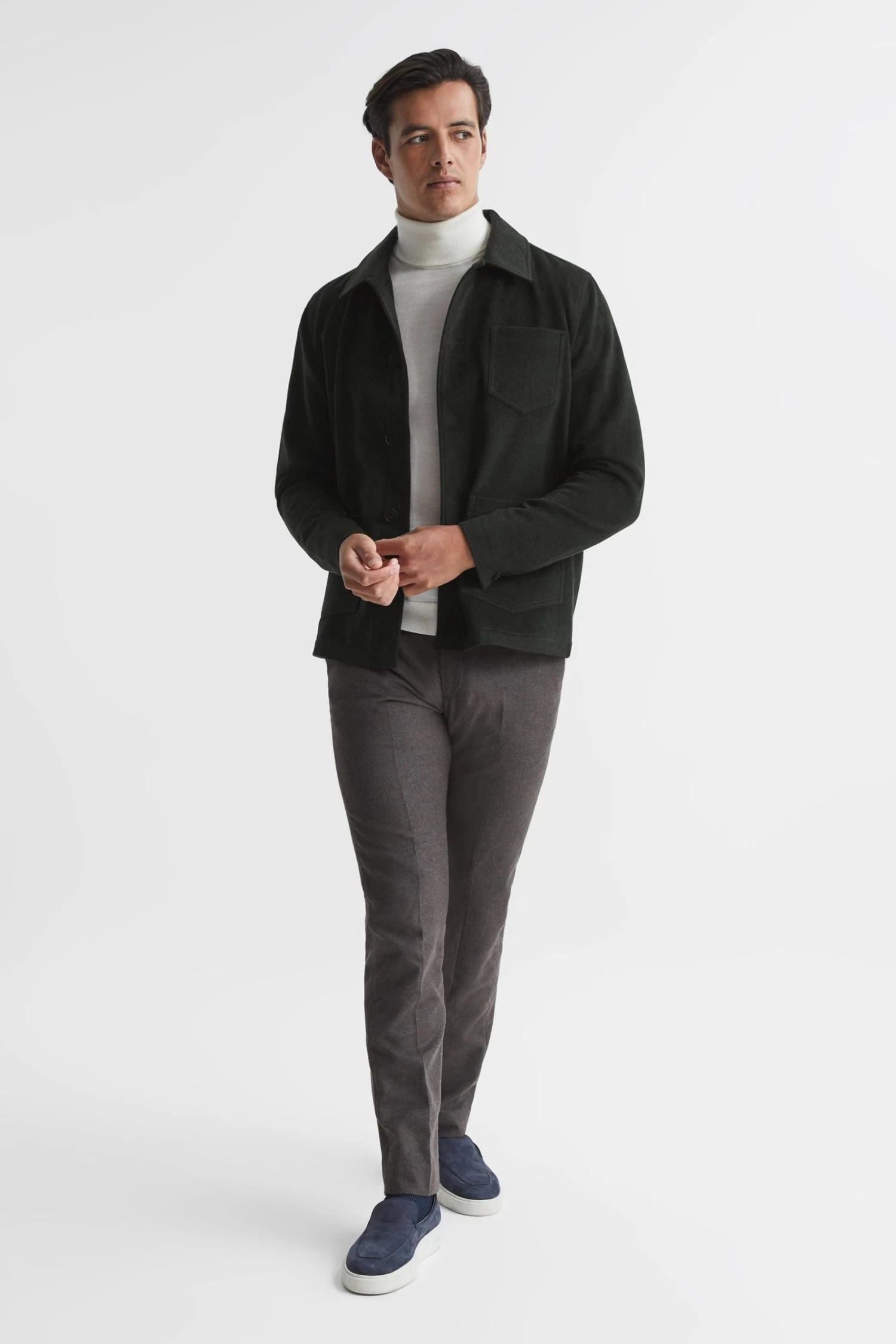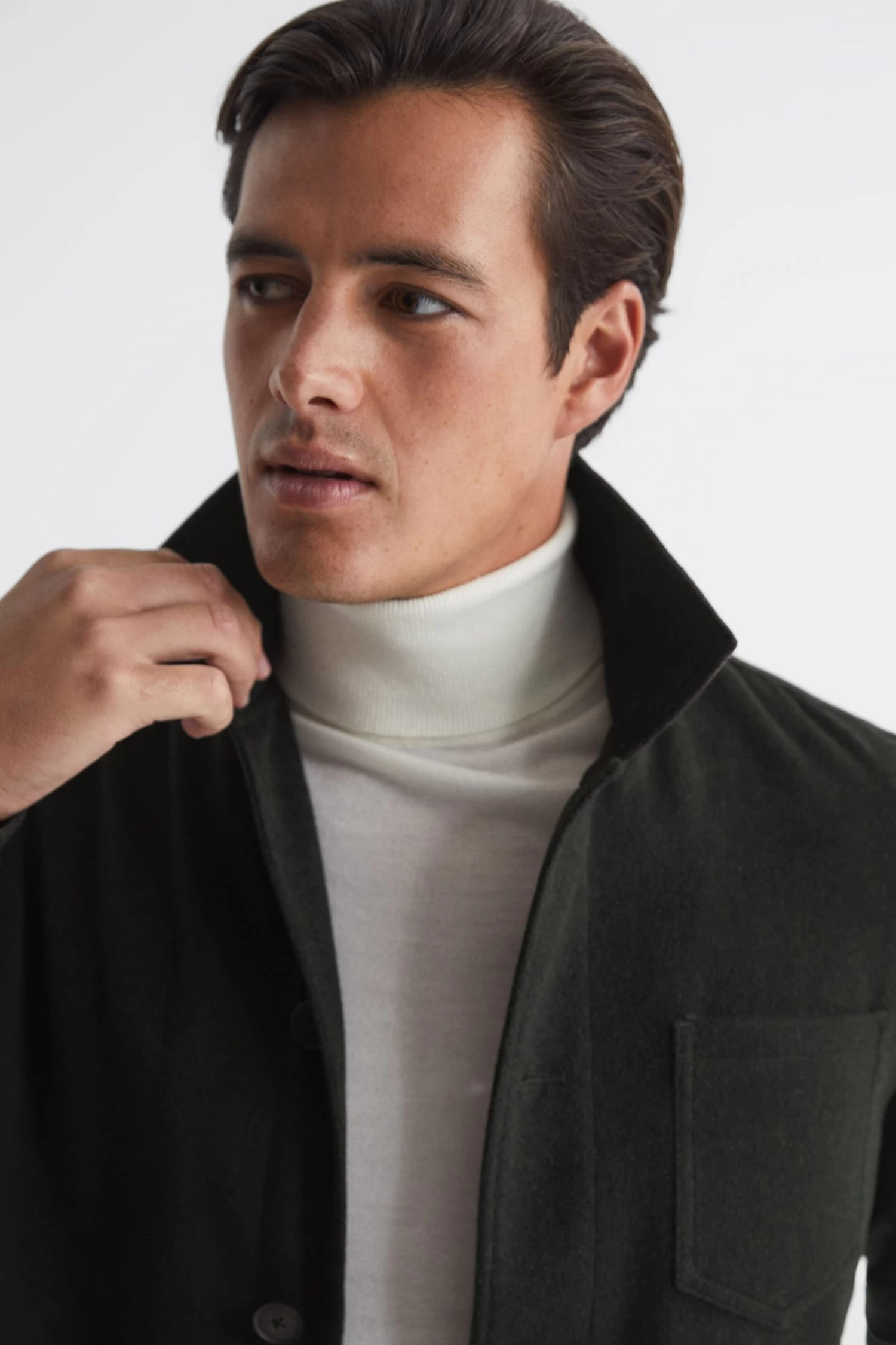 The Connaught in green is crafted from the most sumptuous cashmere yarns, for the softest possible handle. It’s designed to be worn over a T-shirt or knitwear, for a masterful layered ensemble. Point collar. Patch pockets. Buttoned front. 100% Cashmere. The model is wearing a size M. Measurements of model: Height 6ft 2″ / 188cm.