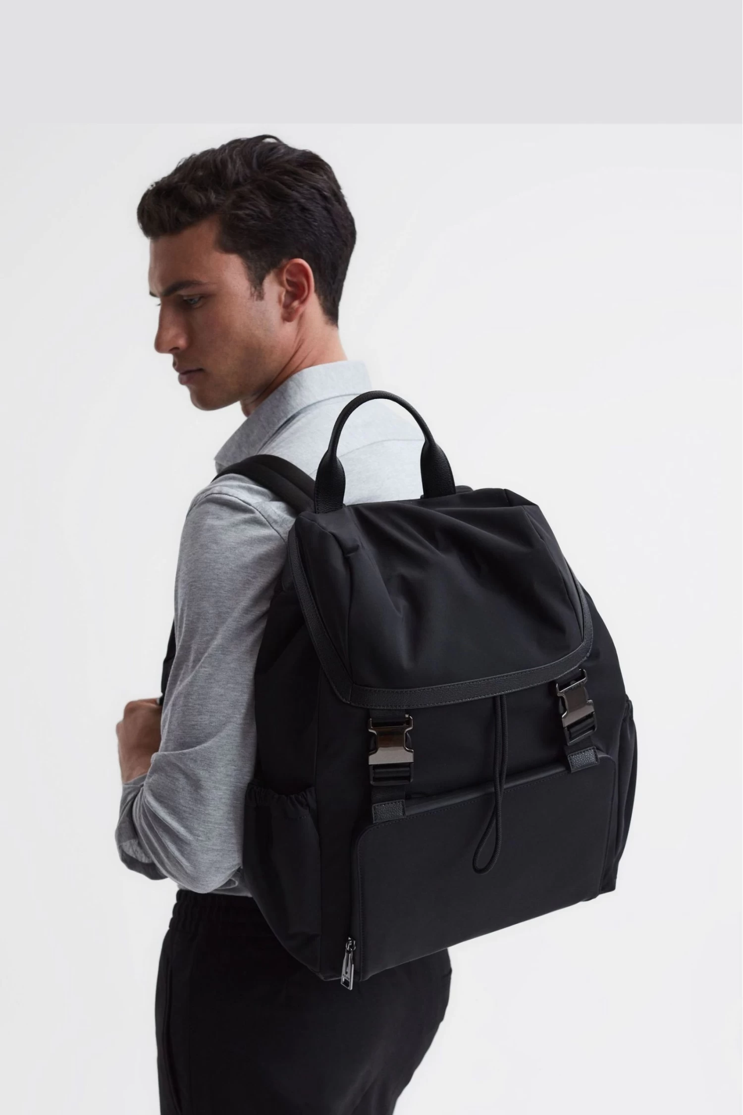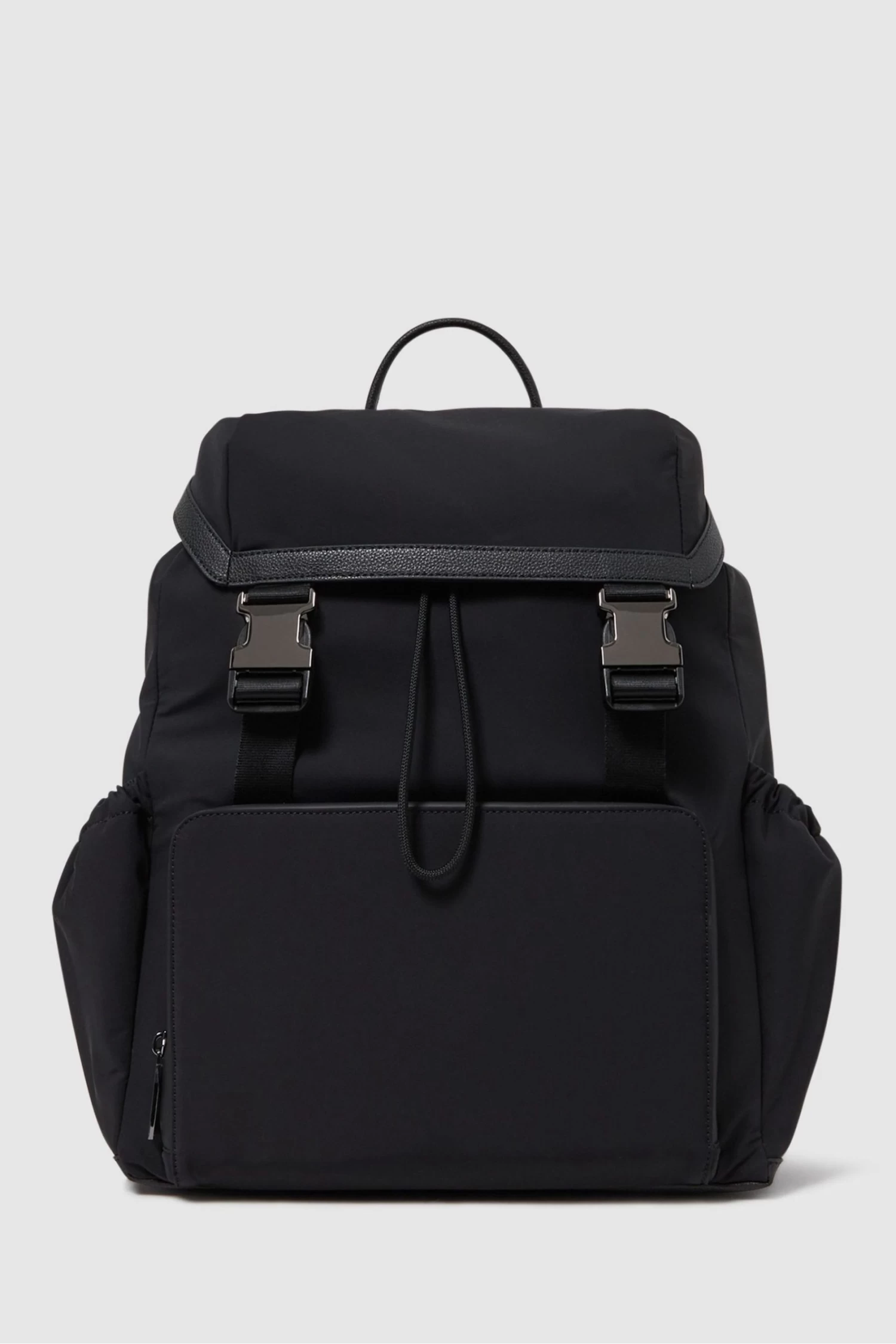 Practical and stylish in equal measure, the Danny backpack is the perfect companion for your long-weekend travels. Its main compartment is fastened with a drawstring closure and dual buckles to the front. Elasticated pockets are added to the side and a front zipped pocket is added for convenience. Choose as part of your everyday Reiss attire. Drawstring top Dual buckle closure Adjustable shoulder straps Elasticated side pockets Front zipped pocket Gun-metal tone hardware Mesh back panel Cotton lining
