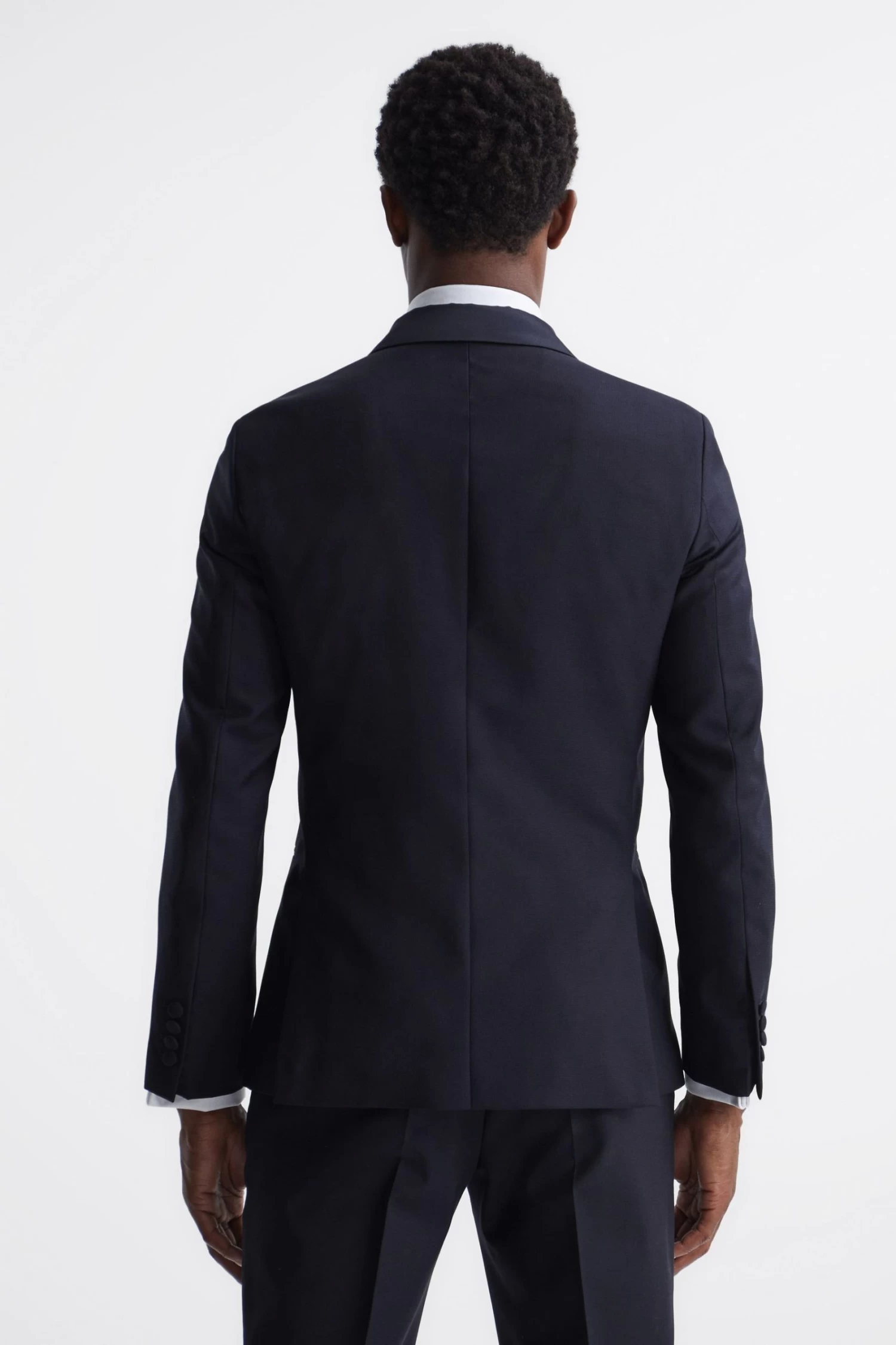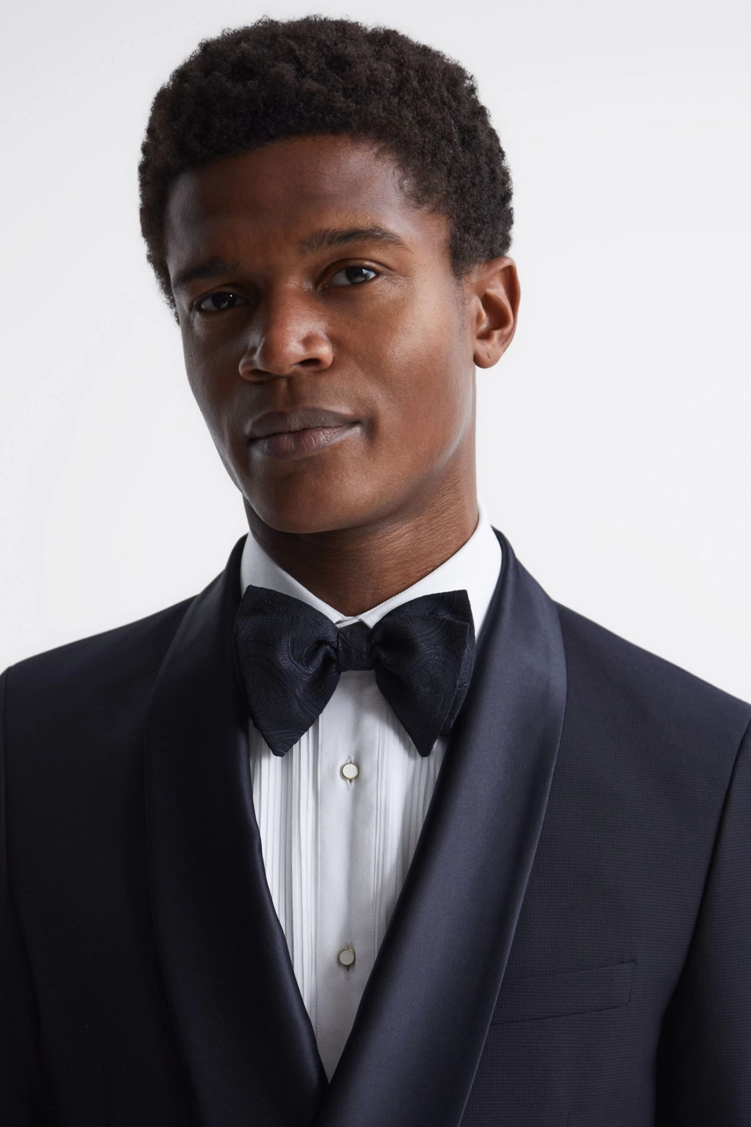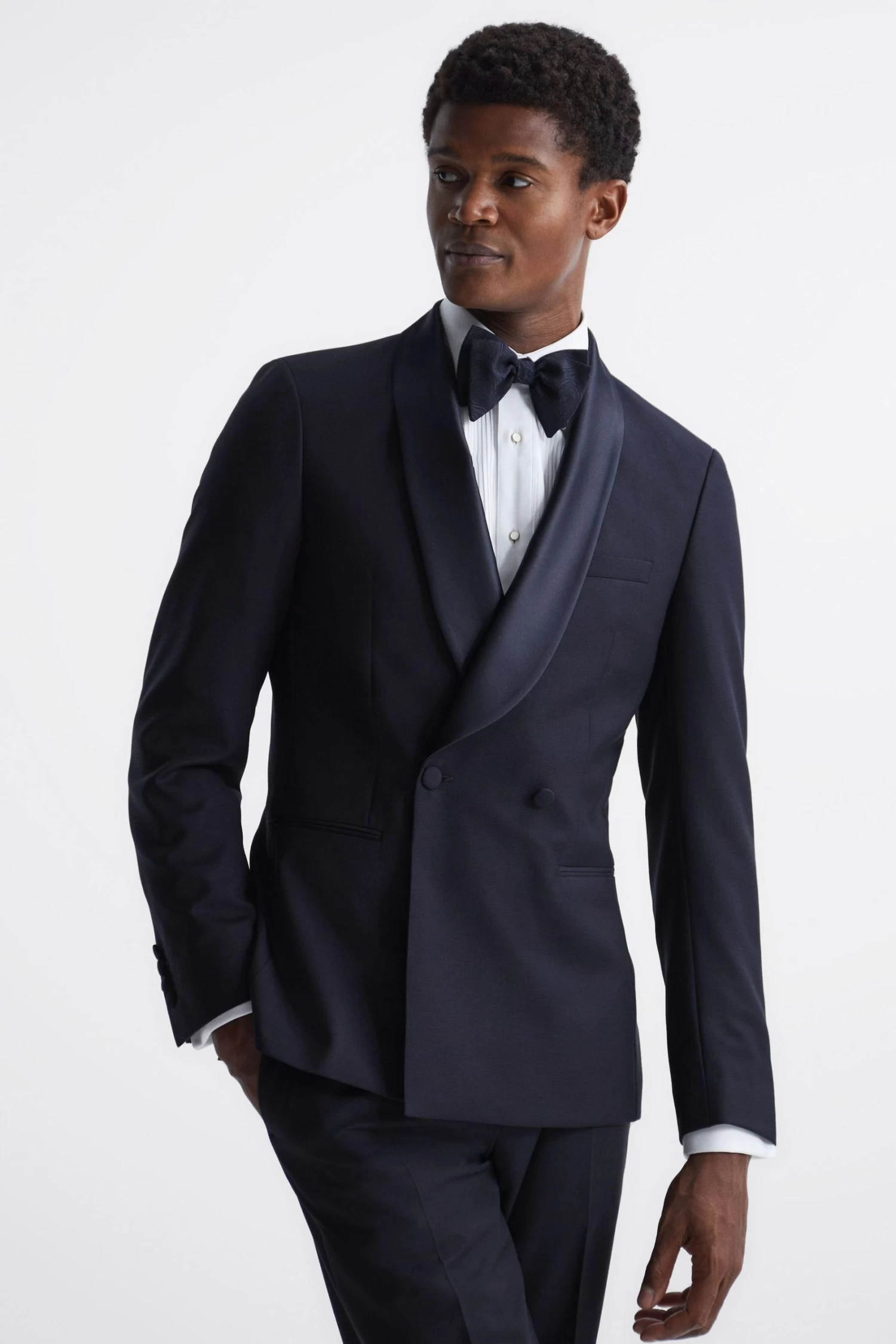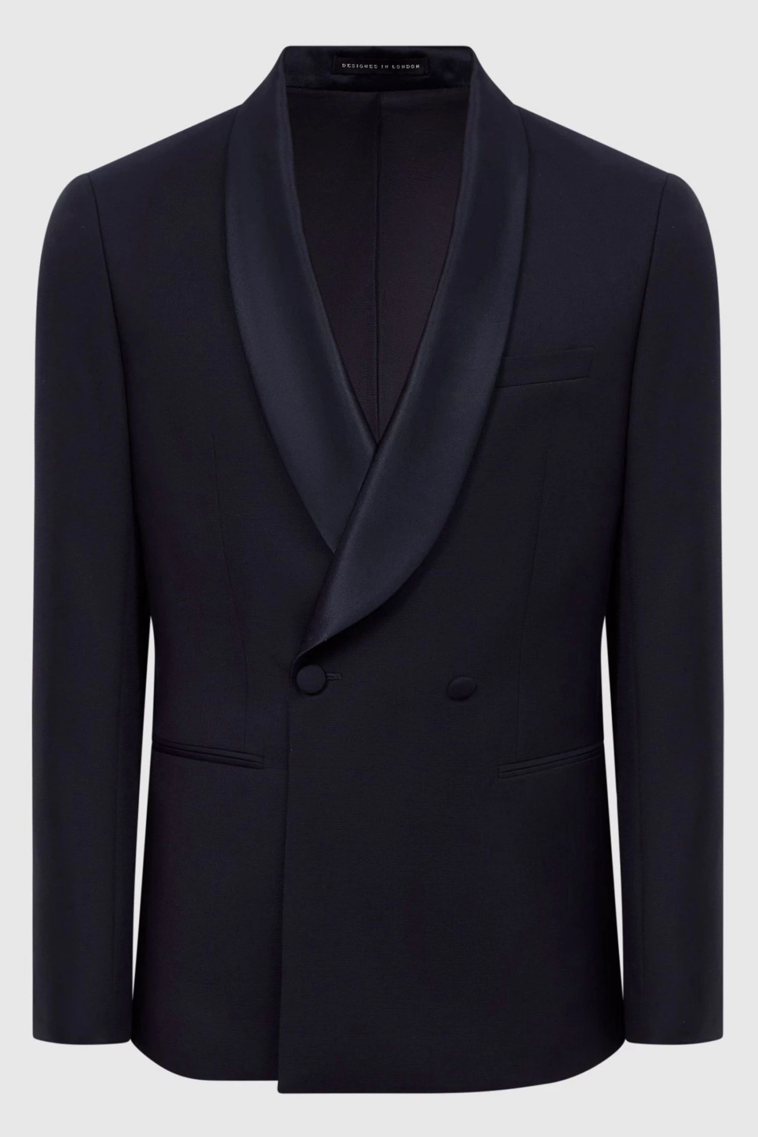 The Expose double breasted blazer in navy is crafted from 100% wool for a textured finish and features satin shawl lapels. This contrast adds a lustrous look and handle, making it a standout occasion piece. Buttoned cuffs and a double vent to the rear are added to maintain the tailored look and feel of the garment. Style over a dress shirt and add a bow tie for a sleek formal edit. Double-breasted. Satin shawl lapels. Buttoned front. Buttoned cuffs. 100% wool. Textured finish. Dual jetted pockets to hip. Chest welt pocket. Internal pockets. Double vent to rear. Fully lined. The model is wearing a size 38. Measurements of model: Height 6ft 2.5″ / 189cm.