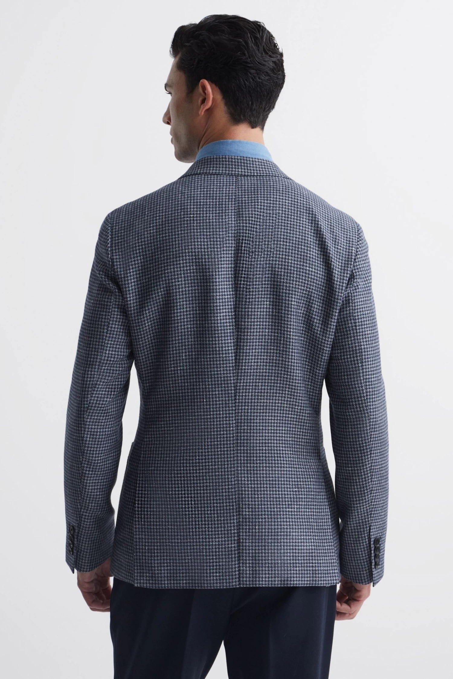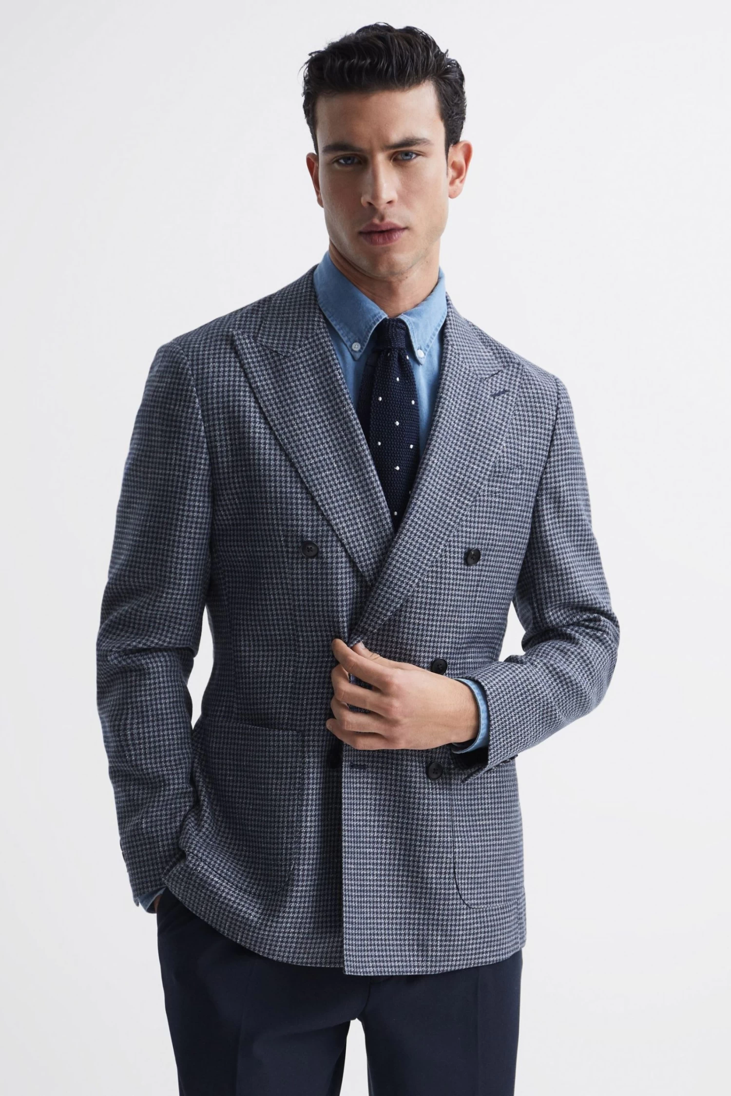 The blue Monument blazer is fabricated in a timeless dogtooth design and cut in a double-breasted silhouette for enduring style. It features peak lapels and a six-button fastening for added formality. Pair with formal trousers for a stand-out look. Wool blend. Dogtooth design. Double breasted. Notch lapels. Six-button closure. Long sleeves. Buttoned cuffs. Dual vent to reverse. Buggy lining. Modern fit. The model is wearing a size 38. Measurements of model: 6ft 2″ / 188cm.