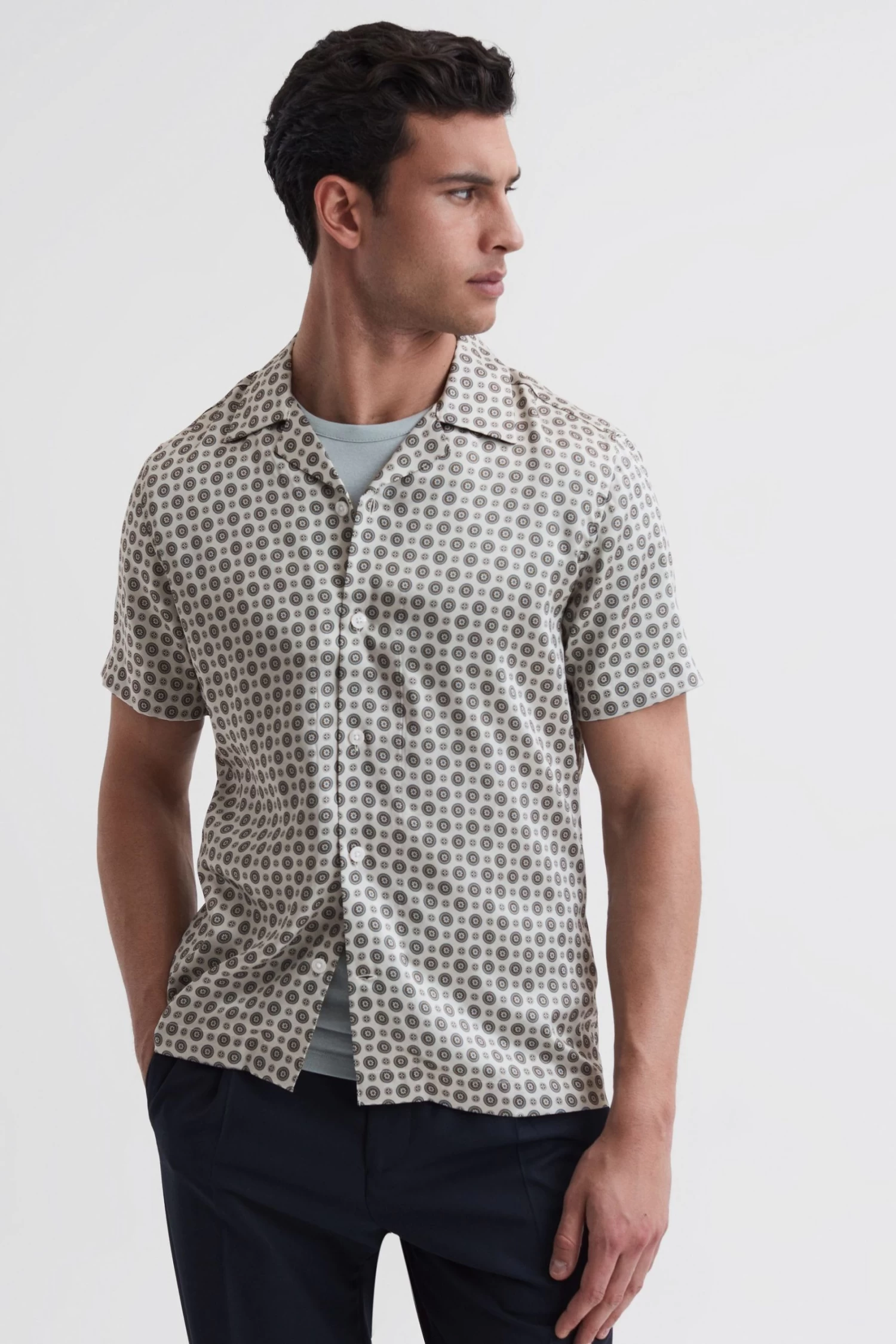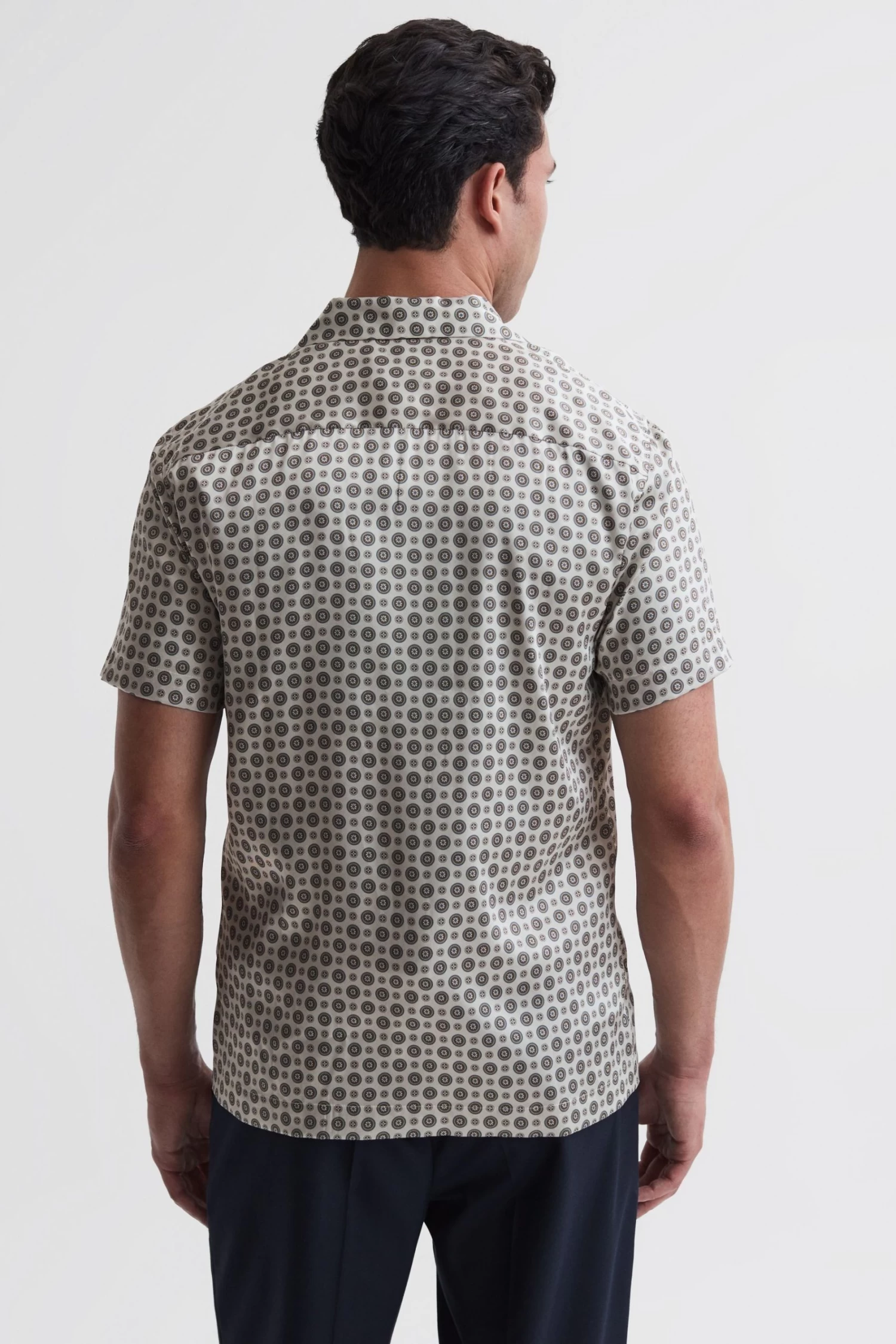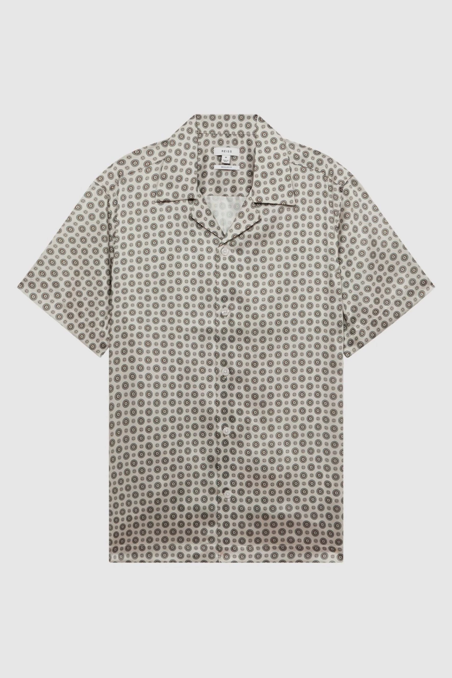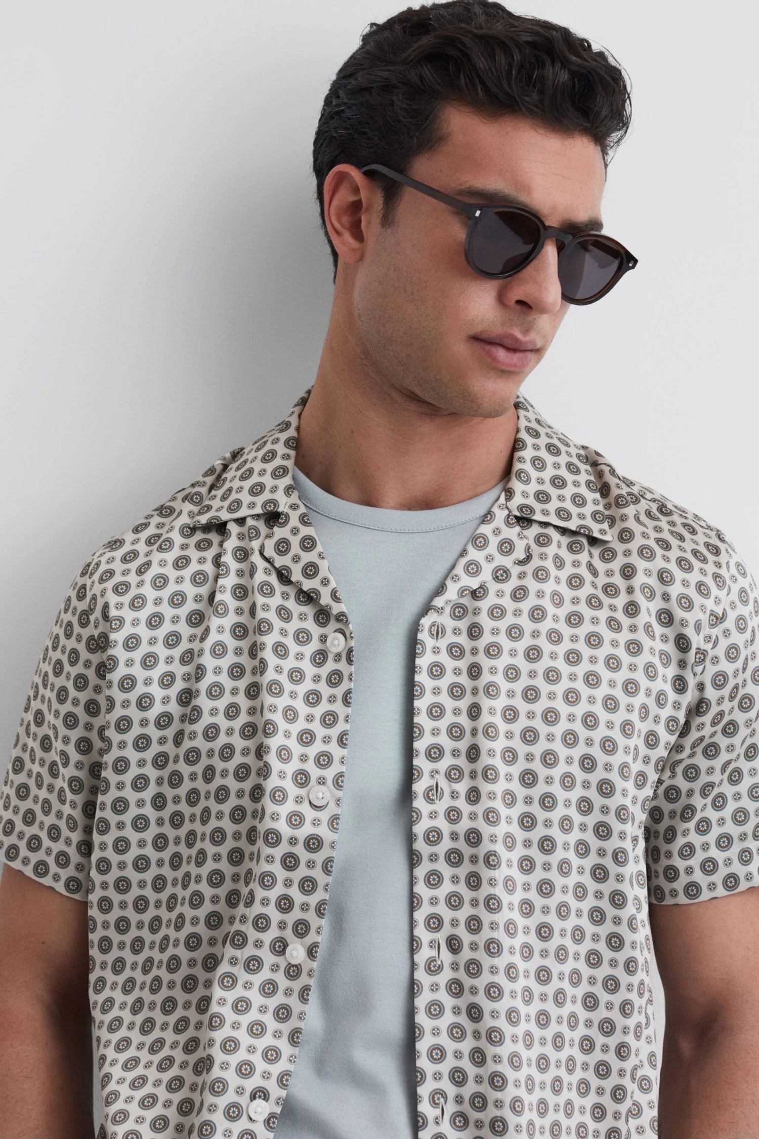 Designed with an abstract medallion pattern, the Pedro Cuban collar shirt is an effortless style asset. For weekend plans, pair it with tailored shorts and trainers. Or, choose chinos for a cool look. Medallion pattern. Cuban collar. Short sleeves. Front buttoned closure. The model is wearing a size M Measurements of model: 6ft 2″ / 188cm.