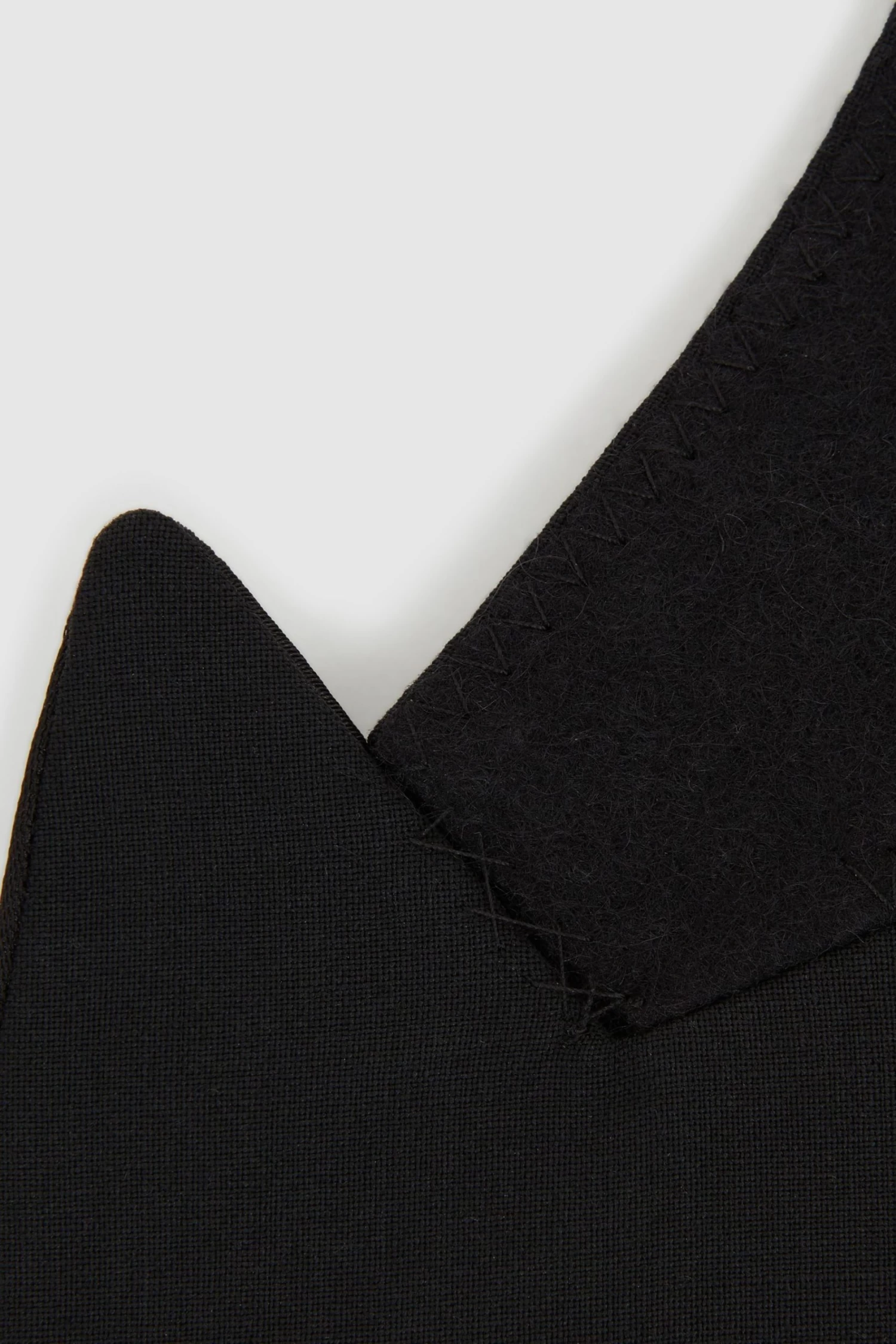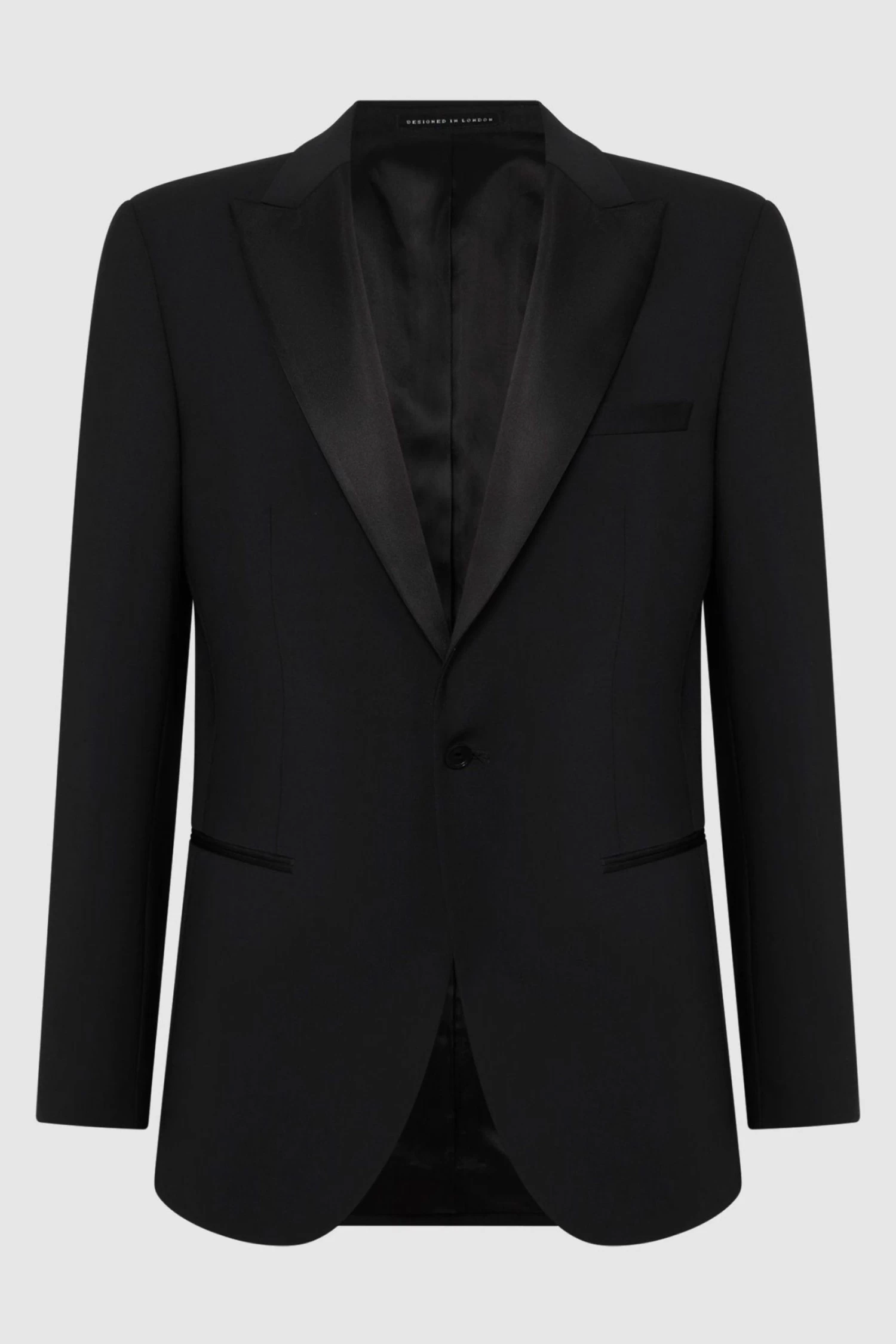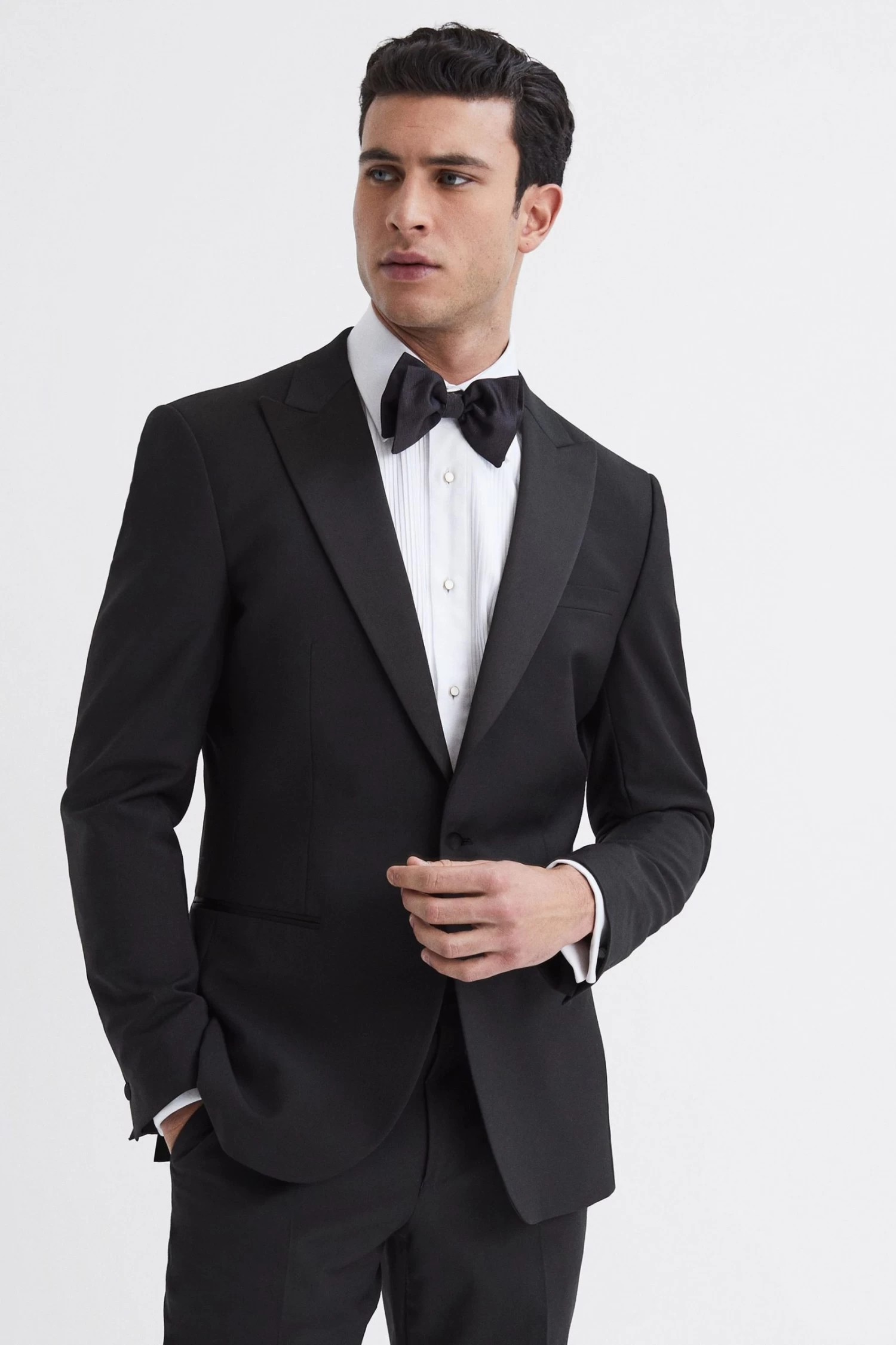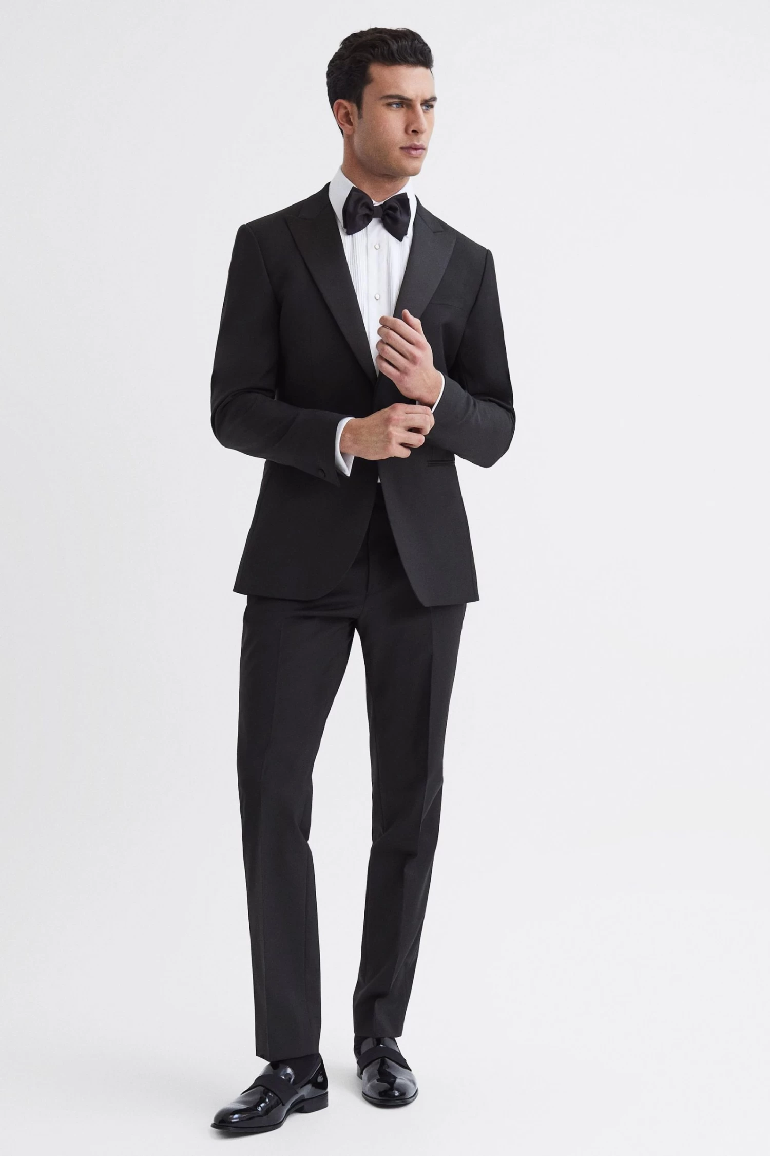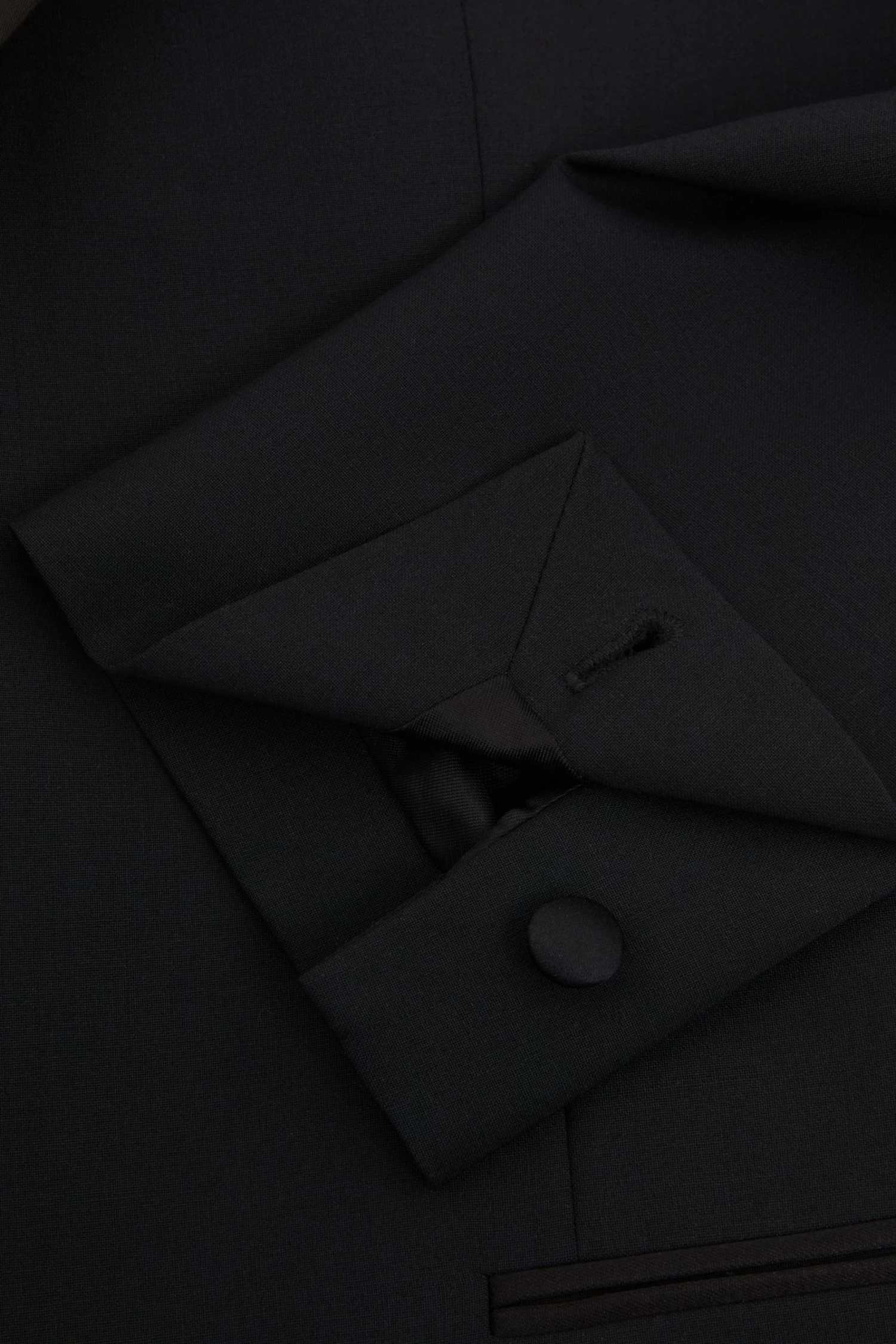 Leave a lasting impression at your next black-tie event with the Poker dinner jacket. Liquid repellent and crease-resistant to maintain form, this tailored piece features satin peak lapels, a single button fastening and jetted front pockets for a classic look. Wear it with the matching tuxedo trousers and a bow tie for sartorial perfection. Bi-Stretch. High Durability. Spillage and water-resistant. Crease-resistant. Peak lapels. Single-breasted silhouette. Single-button fastening. Buttoned cuffs. Vent to reverse. Modern fit. Fully lined. Measurements of model: Height 6ft 3″ / 191cm, Chest 40″ / 102cm, Waist 28″ / 71cm.