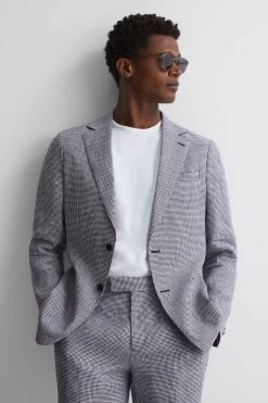 Heritage dressing gets a warm-weather twist with the single-breasted Squad blazer. Its 100% linen composition is woven into a navy dogtooth design, making it both a breathable and stylish choice. Curate a sleek profile by pairing with the matching trousers. 100% linen Dogtooth design Single breasted Two-button fastening Notch lapels Patch pockets Lining The model is wearing a size 38 Measurements of model: Height 6ft 2.5 / 189cm