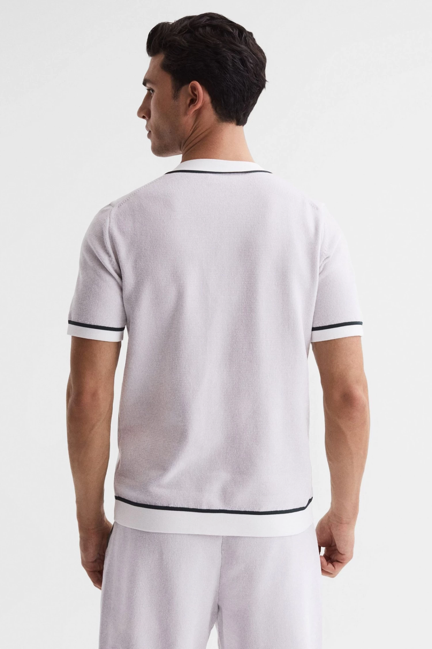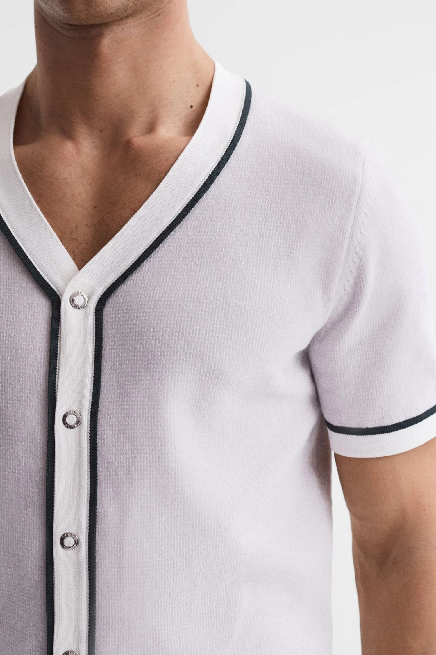 The soft grey Striker shirt is crafted from a supremely soft chenille fabrication for a premium take on loungewear. It’s fitted with a press-stud closure and an elasticated hem. Curate a coordinating edit with the matching shorts, then choose white trainers for a fresh finish. Chenille fabrication. V-neckline. Short sleeves. Press-stud closure. Elasticated hem.