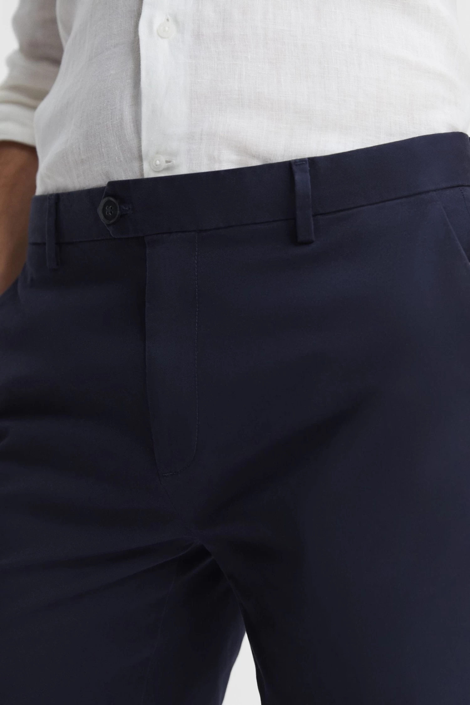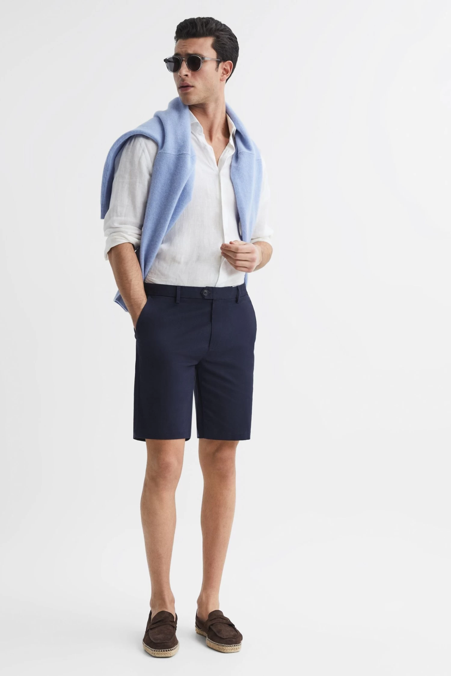 Choose the soft sage Wicket chino shorts for a preppy aesthetic. They re cut from a cotton-blend to a modern fit, and they finish above the knee. Team this stylish pair with a classic T-shirt and loafers for easy summer styling. Cotton-stretch fabrication. Zip fly and button closure. Side slip pockets. Belt loops. Buttoned jetted pockets to reverse. The model is wearing a size 32 Measurements of model: 6ft 2″ / 188cm.