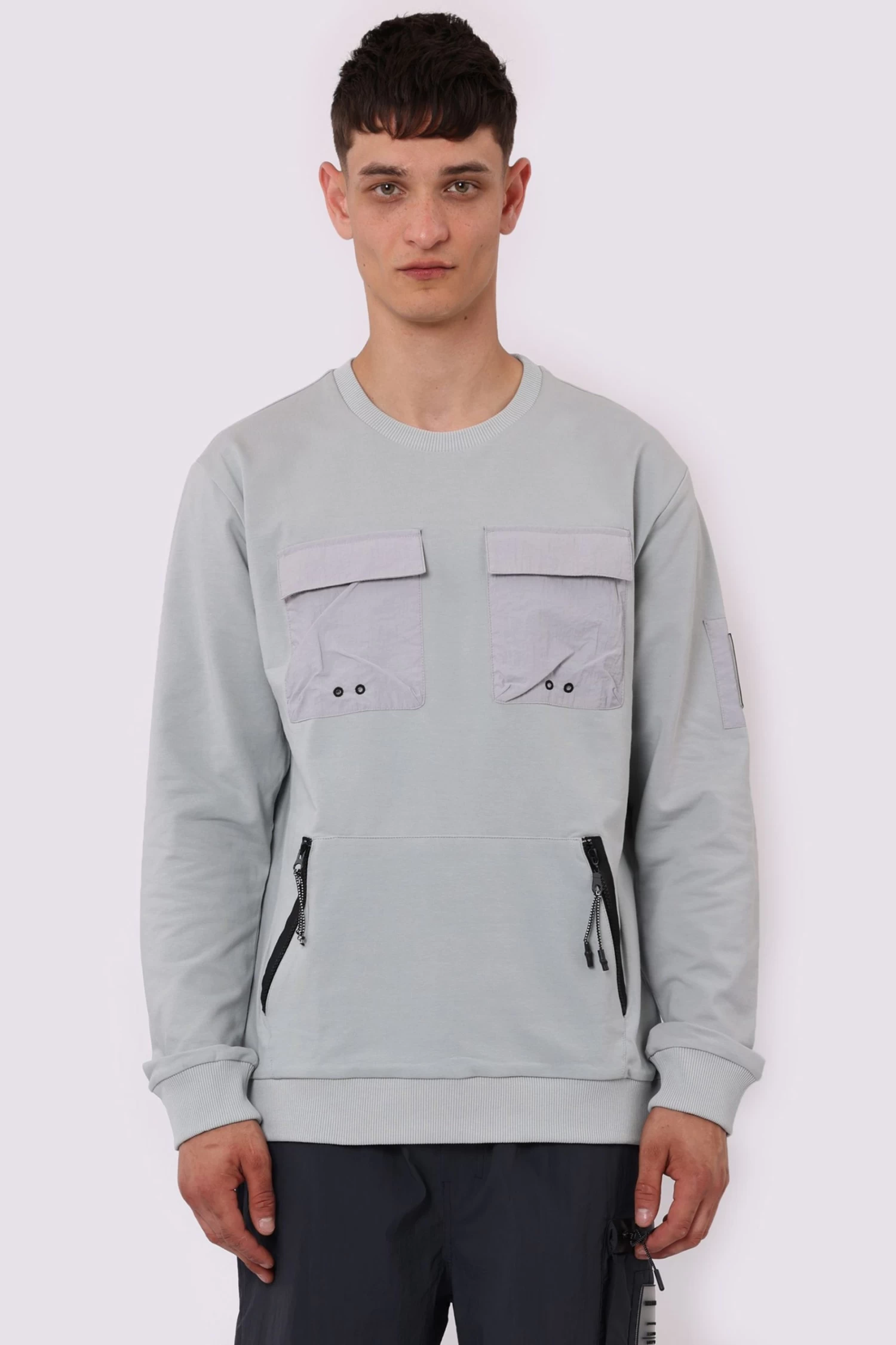 The Terrace Crew in indigo is crafted from a soft loop back sweat and shaped to a regular fit. Featuring utility inspired flap chest pockets in taslon. Pouch pocket with rubber zip pockets. Ribbed crew, cuff and hem. Our signature rubber Religion badge sits on the arm.