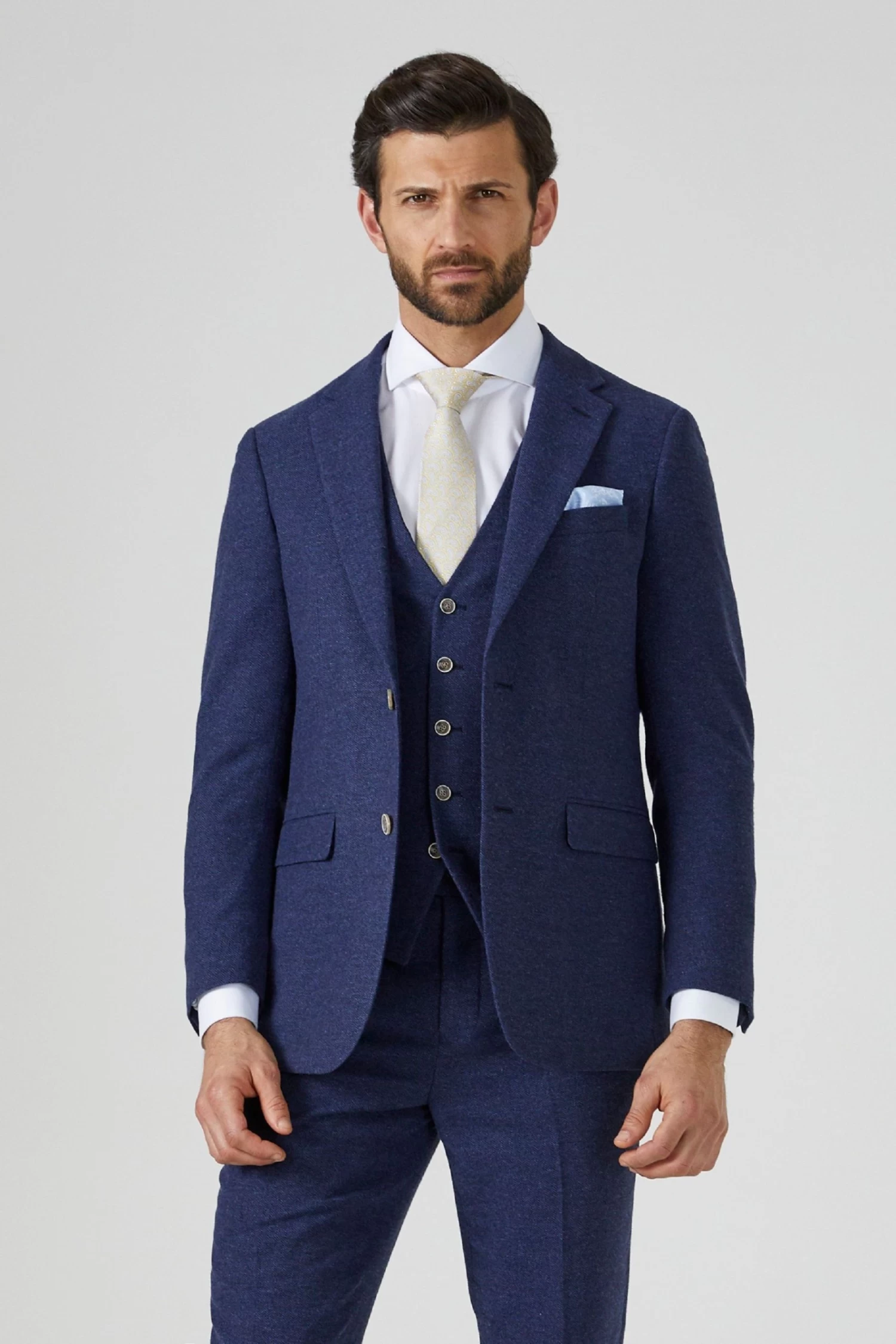 I’m Jude, a single-breasted suit jacket cut from a navy herringbone cloth. With my silhouette-defining tailored fit, notch lapel and slanted flap pockets, there’s definitely something special about me. Just the ticket for a wedding. Jude tailored fit single-breasted suit jacket in navy herringbone wool blend fabric. Features include two-button fastening, slant flap pockets, and floral print lining with twin side vents.