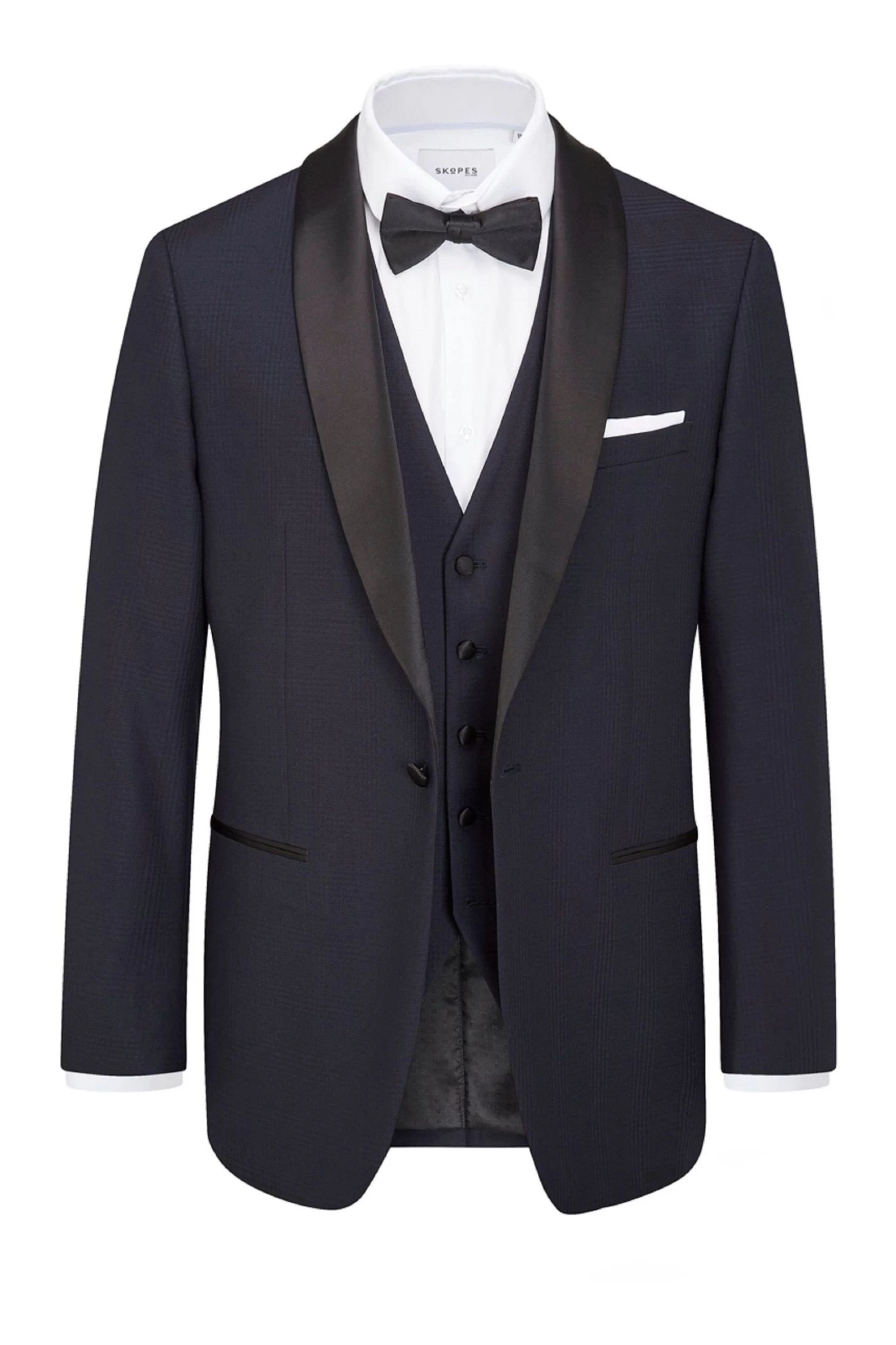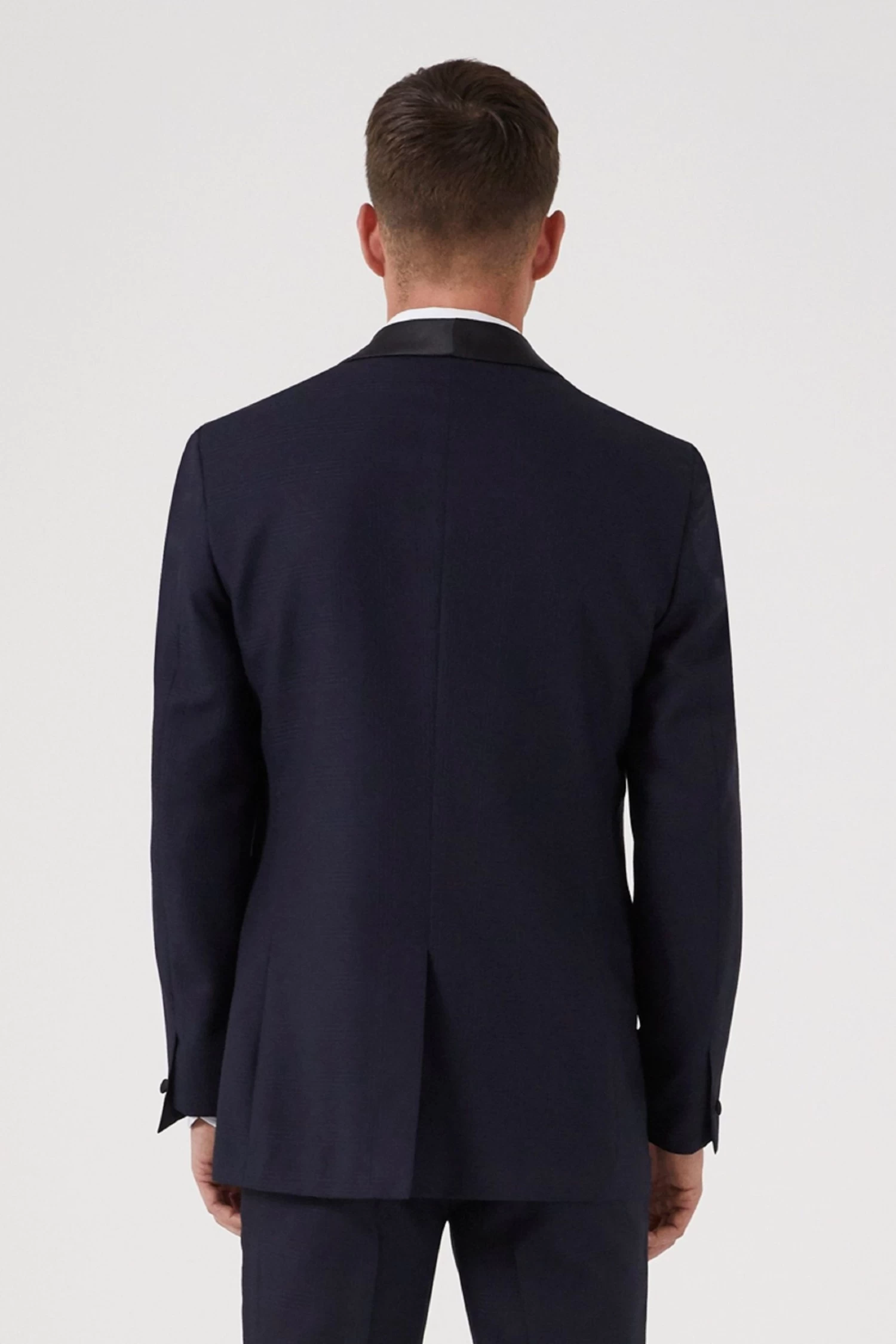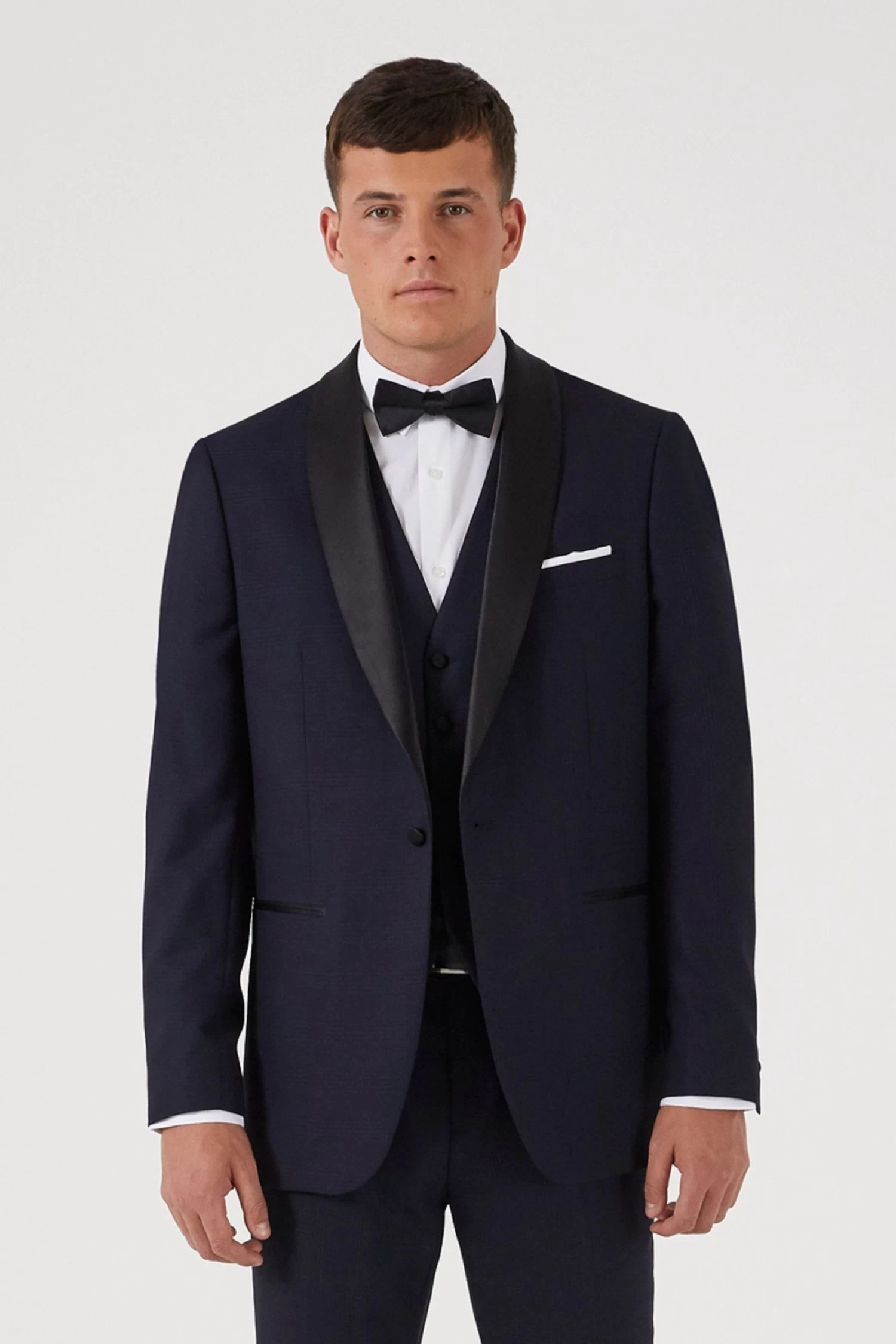 Newman tailored fit single-breasted dinner suit jacket in navy self-check with satin shawl collar. Features include one-button fastening, straight jetted satin pockets, a centre back vent, cloth-covered buttons and tonal pattern lining. See matching tailored-fit trousers and waistcoats.
