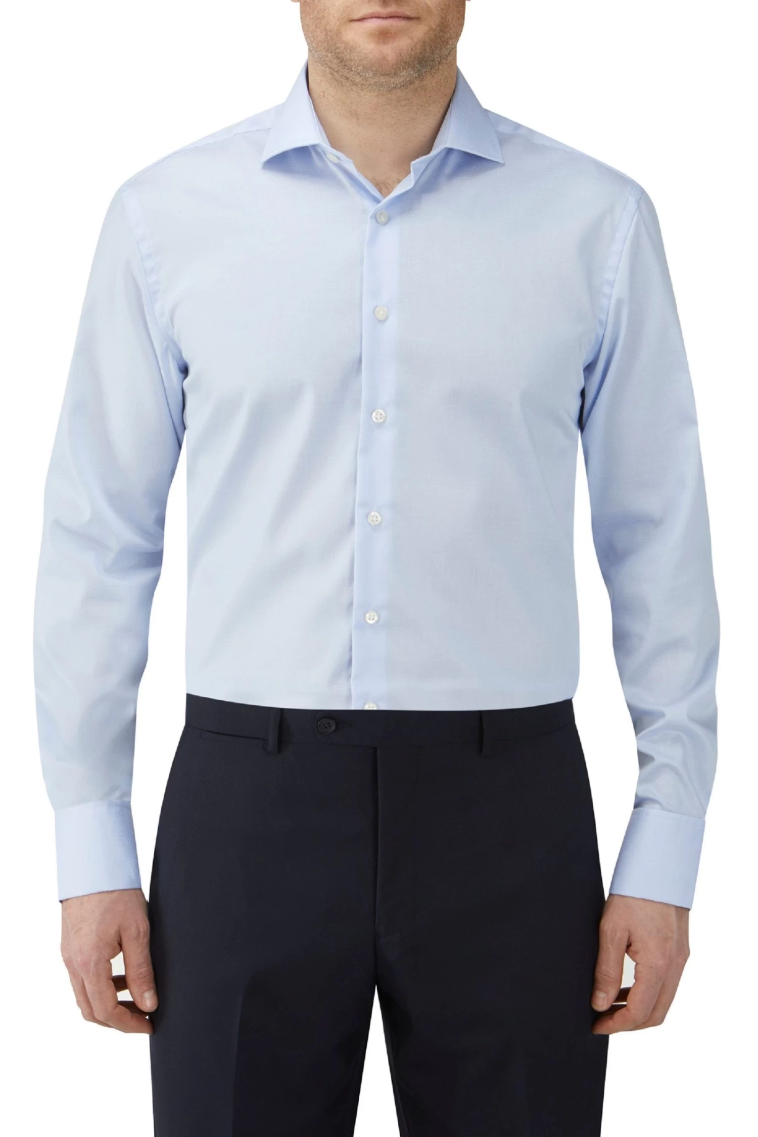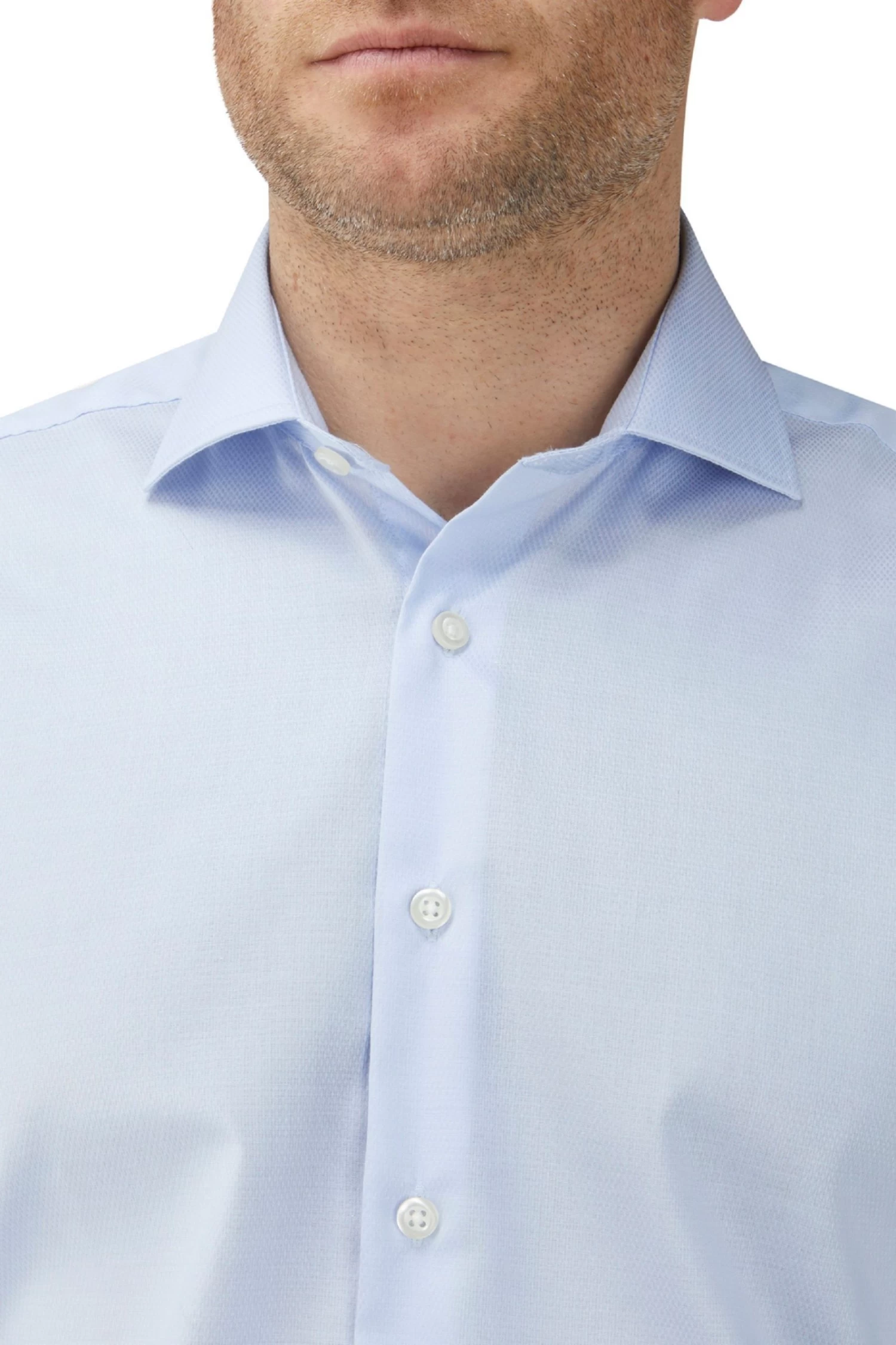 Formal shirt in tailored fit blue dobby stamp design. Long sleeve formal shirt with cutaway collar and double cuff. Tailored fit gives a slimmer silhouette, tapered at the waist and a closer fit across the chest.