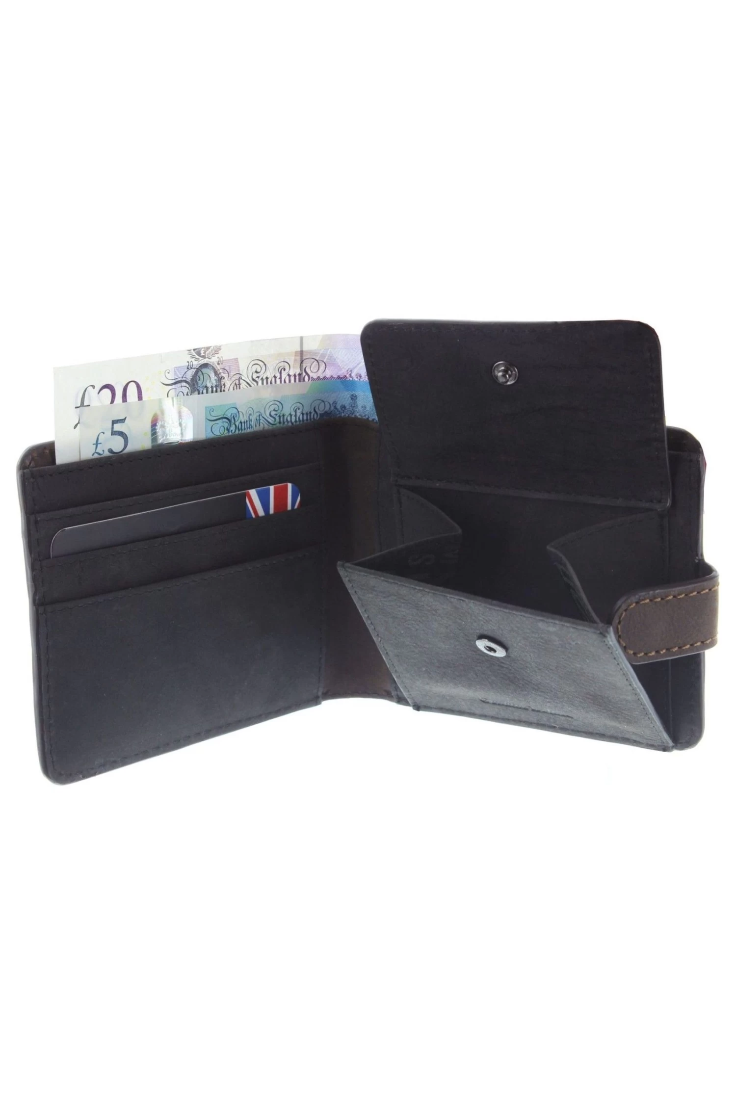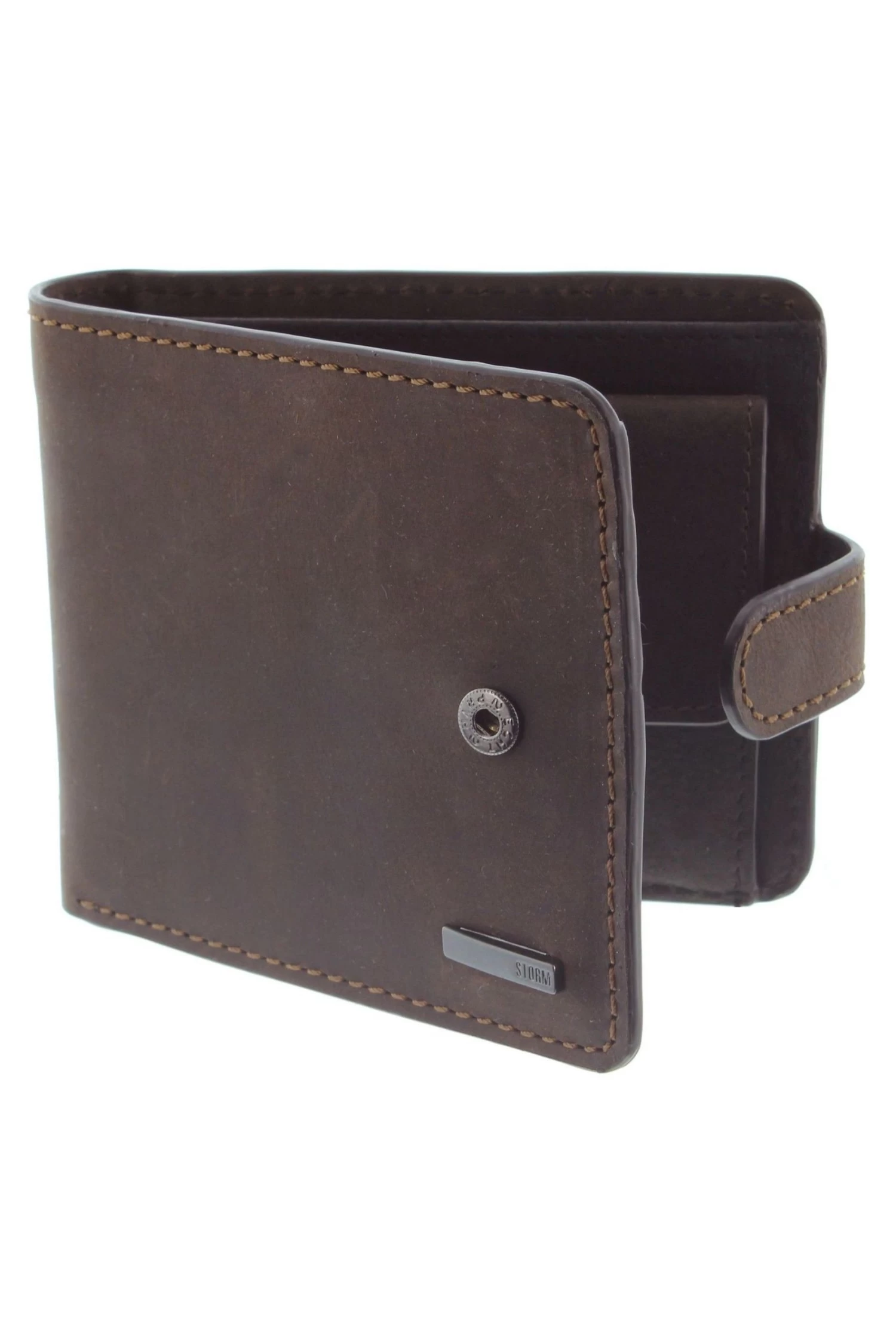 Men’s leather wallet with press-stud fastening, contrast internal banknote/card sections with coin pocket and metallic Storm badge.