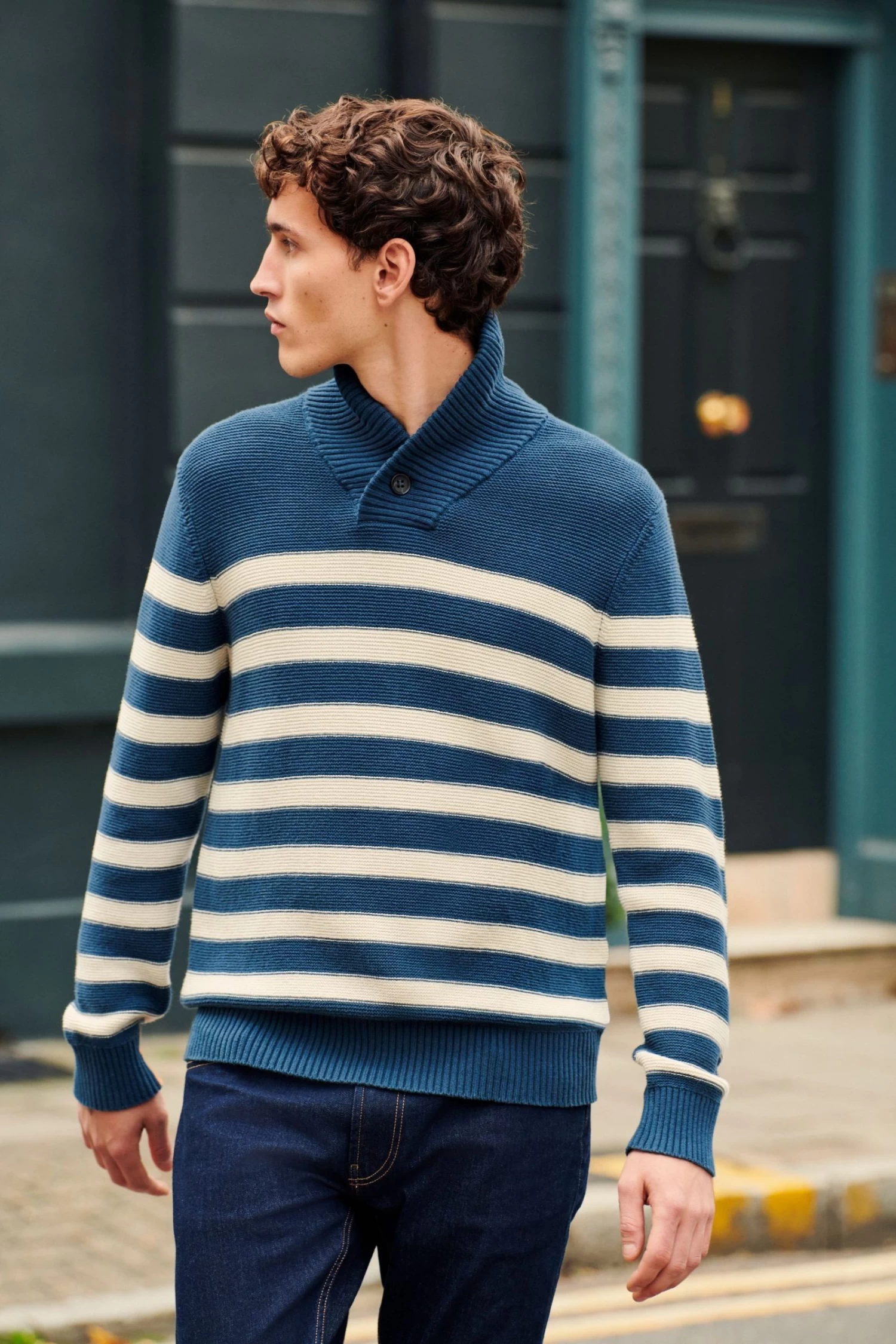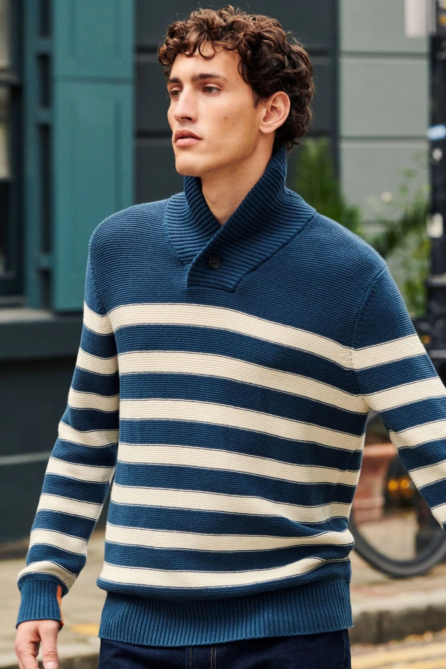 Reine Bio-Baumwolle, klassische Streifen, Brusttasche und ein stylisher Schalkragen. Dieser Pullover erfüllt so ziemlich alle Ansprüche. Trage ihn zu Jeans oder Chinos, und zum Bootfahren.